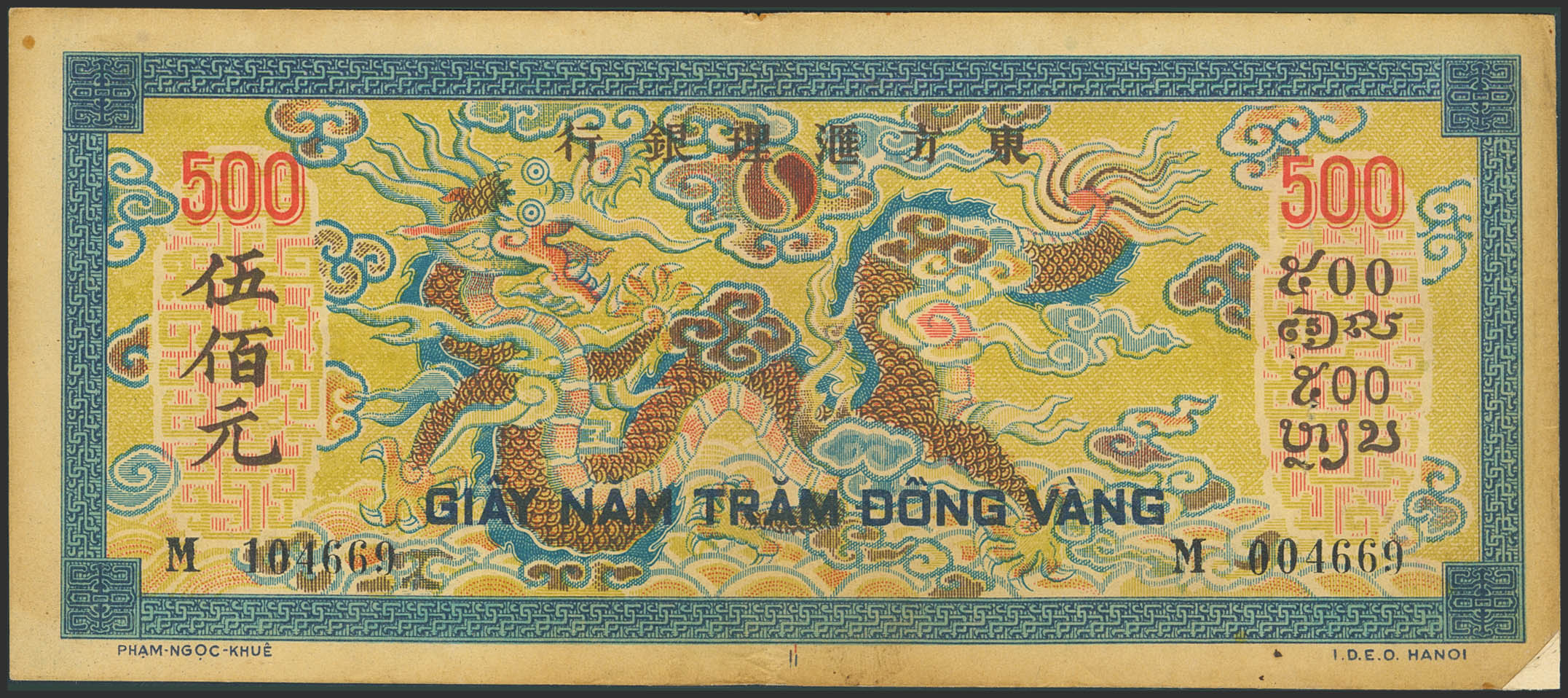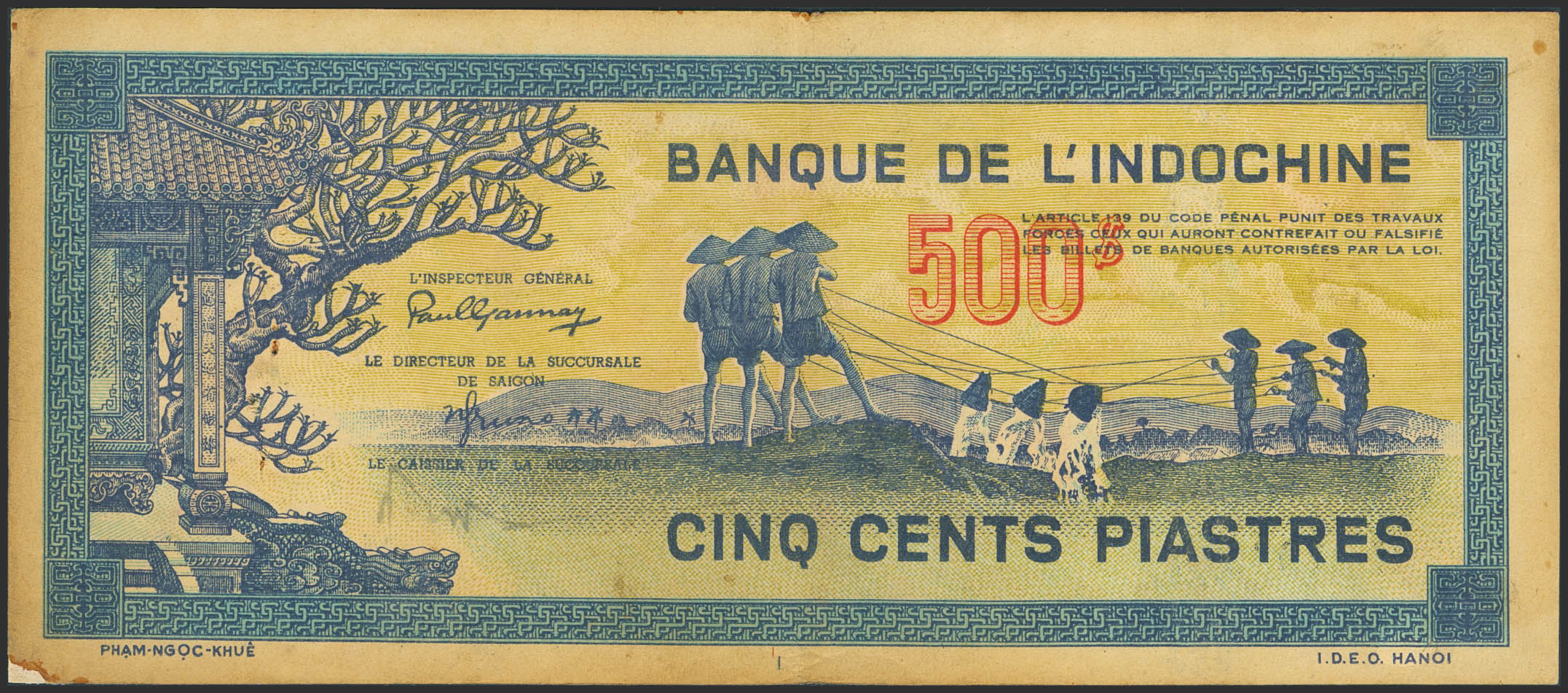 FRENCH INDOCHINA. 500 Piastres. (1944ca). Banque de L´Indochine. (Pick: 68). Very Fine, pinholes, adhesive paper added-the missing corner.