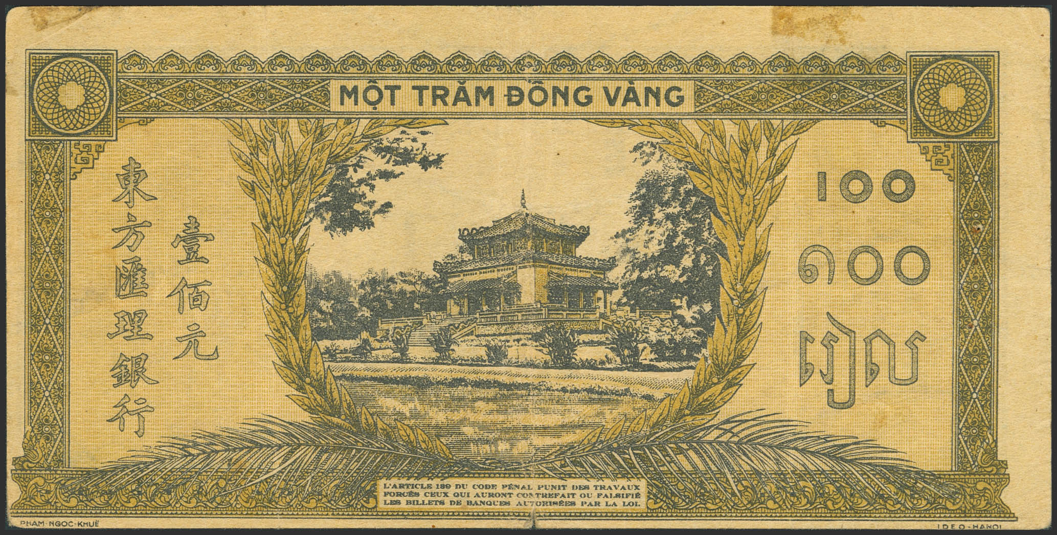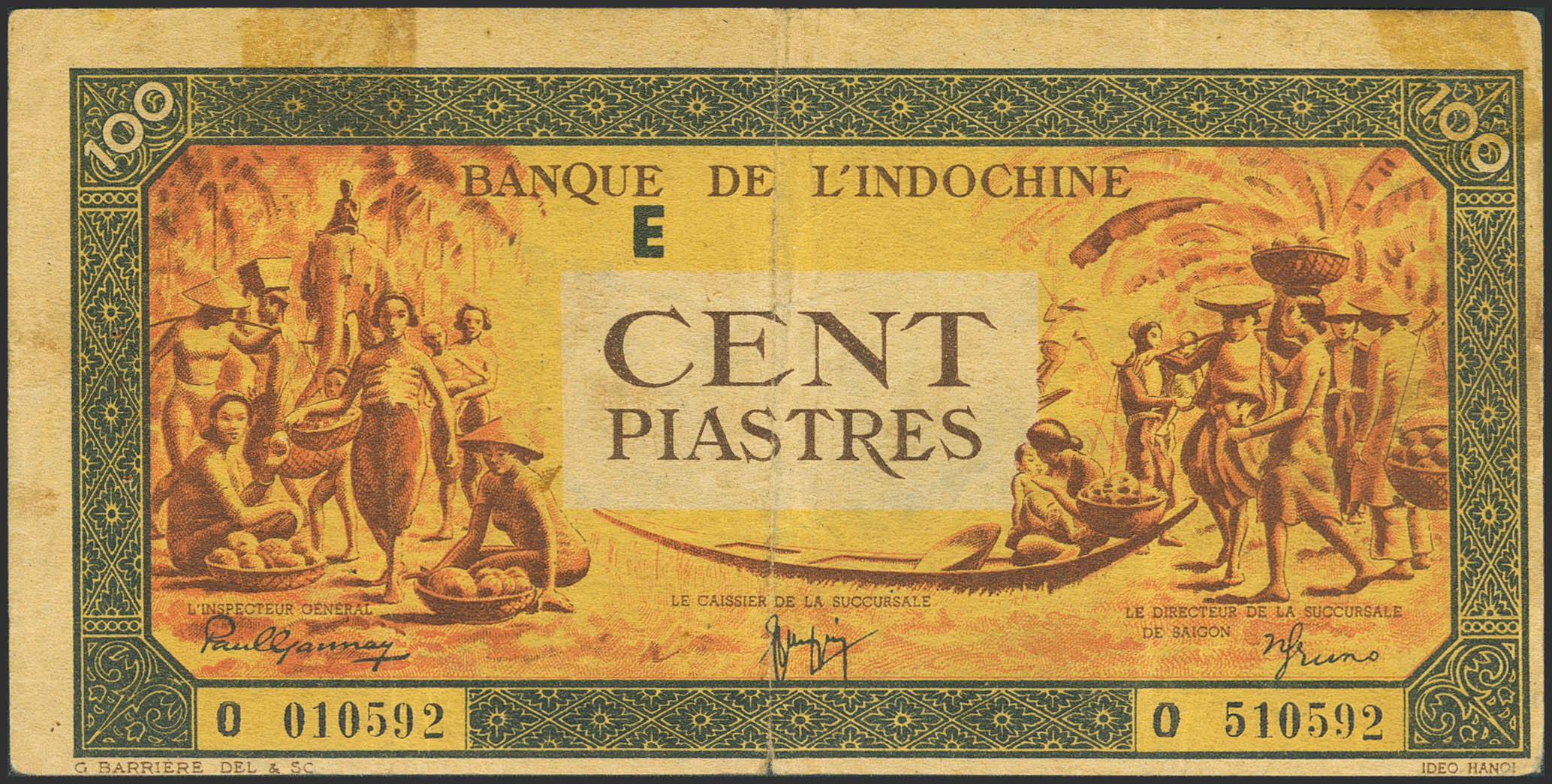 FRENCH INDOCHINA. 100 Piastres. (1942ca). Banque de L´Indochine. (Pick: 73a). Fine, previously mounted.