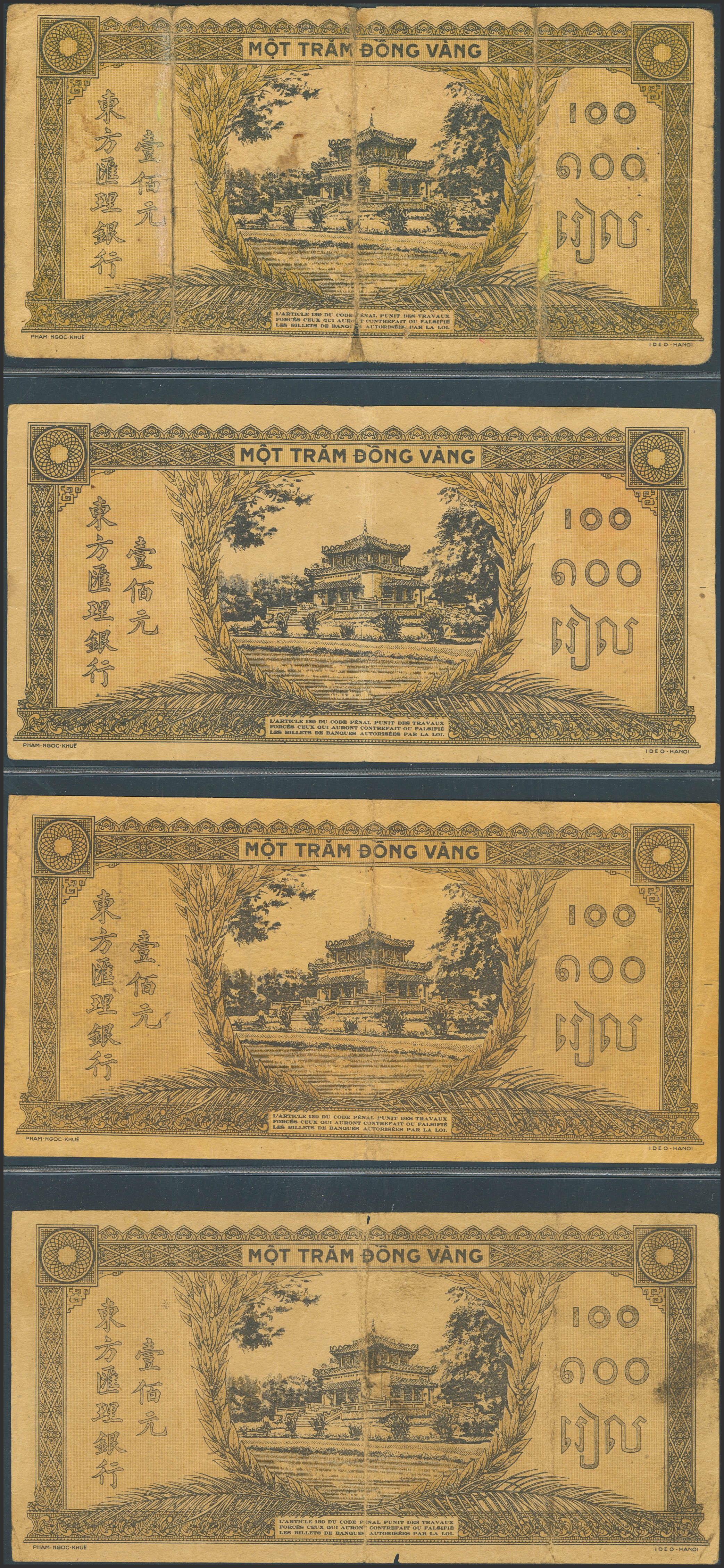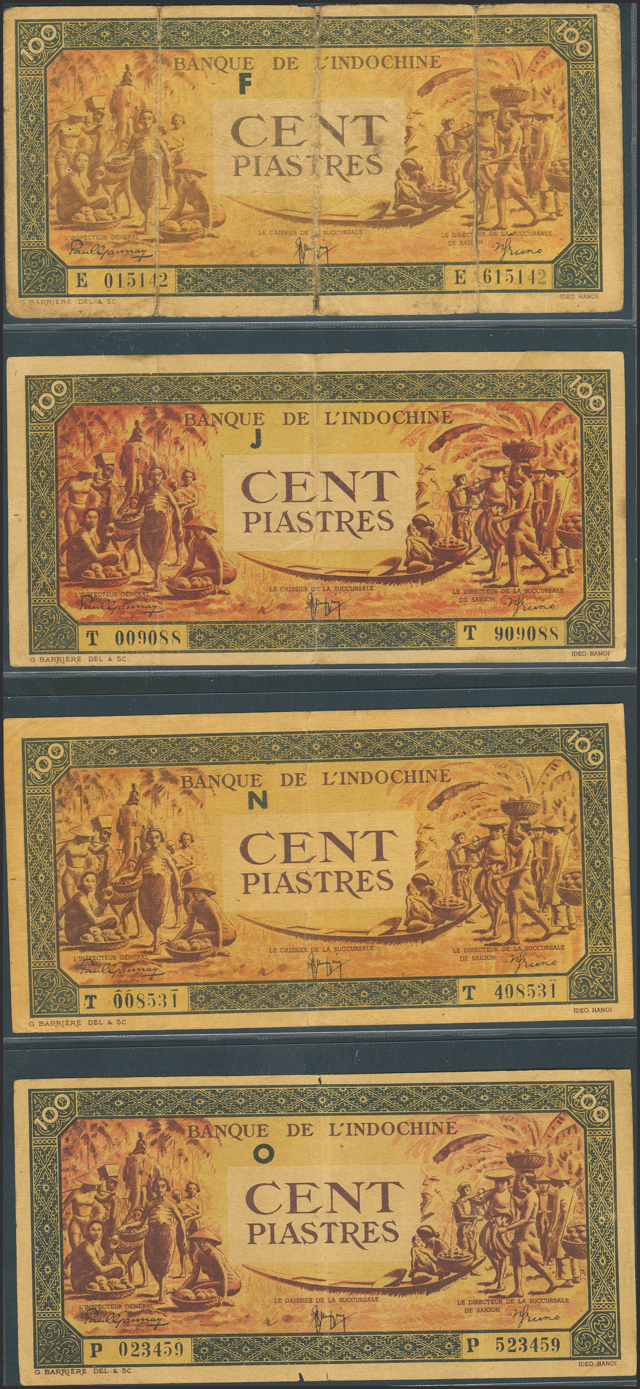 FRENCH INDOCHINA. Lot of 4 notes of 100 Piastres. (1942ca). Banque de L´Indochine. (Pick: 73a). Very Good / Fine, one with old restoration, pinholes, tears.