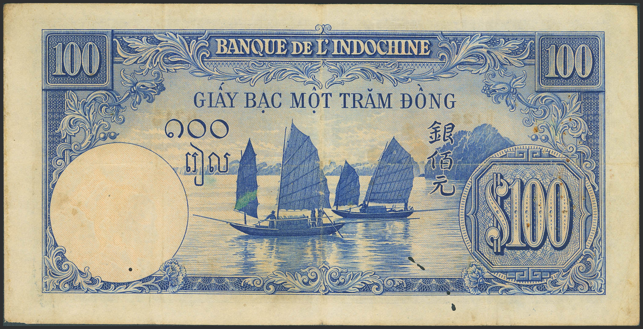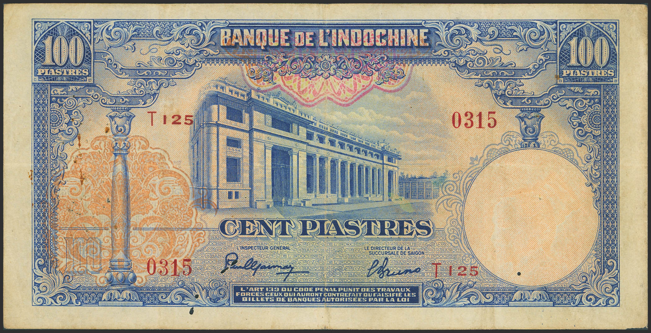 FRENCH INDOCHINA. 100 Piastres. (1946ca). Banque de L´Indochine. (Pick: 79a). Very Fine, multiple pinholes, wormhole.