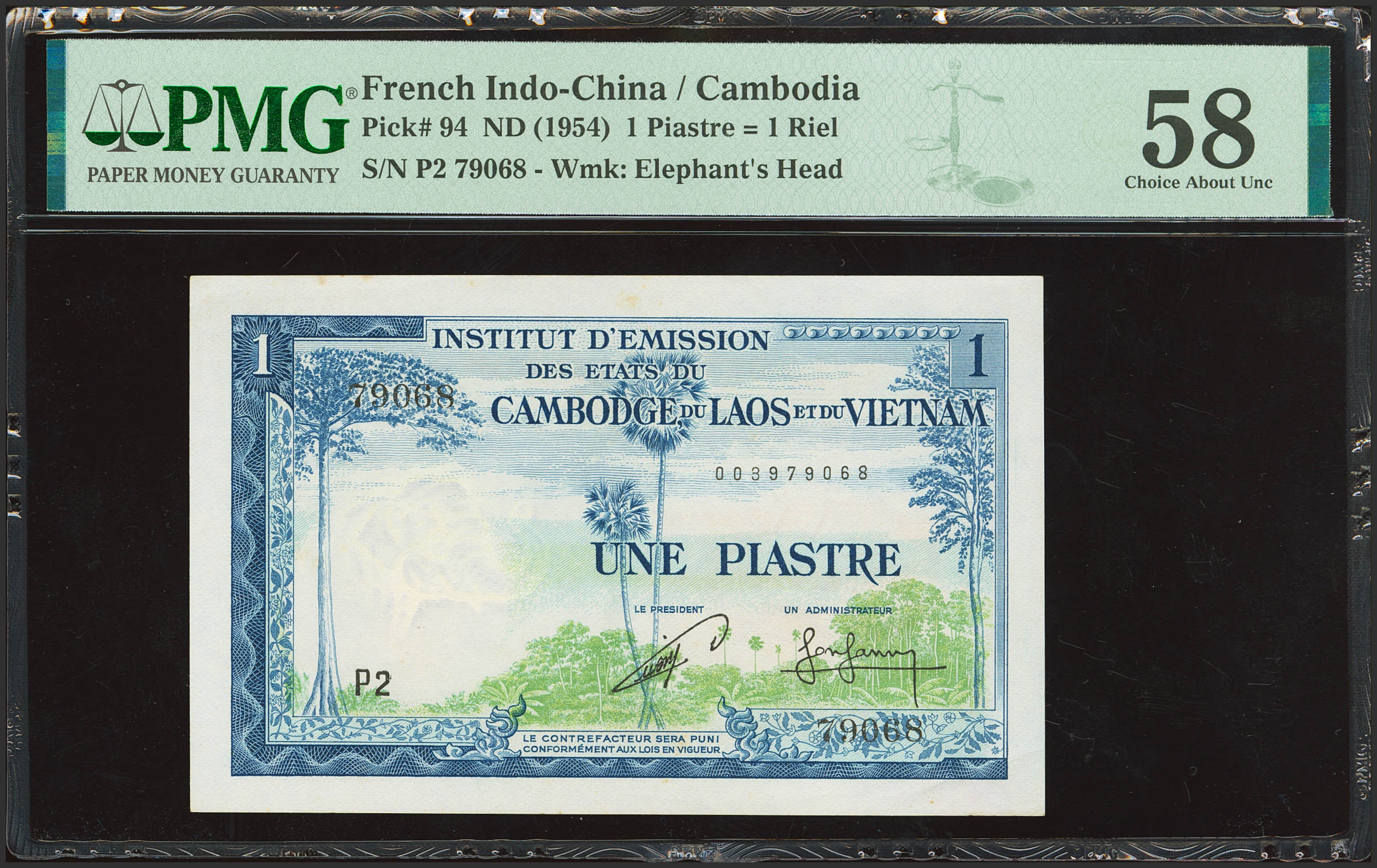 FRENCH INDOCHINA. 1 Piastre. (1954ca). Institut d'Emission des Etats du Cambodge, du Laos et du Viet-Nam. Cambodia. (Pick: 94). PMG58.