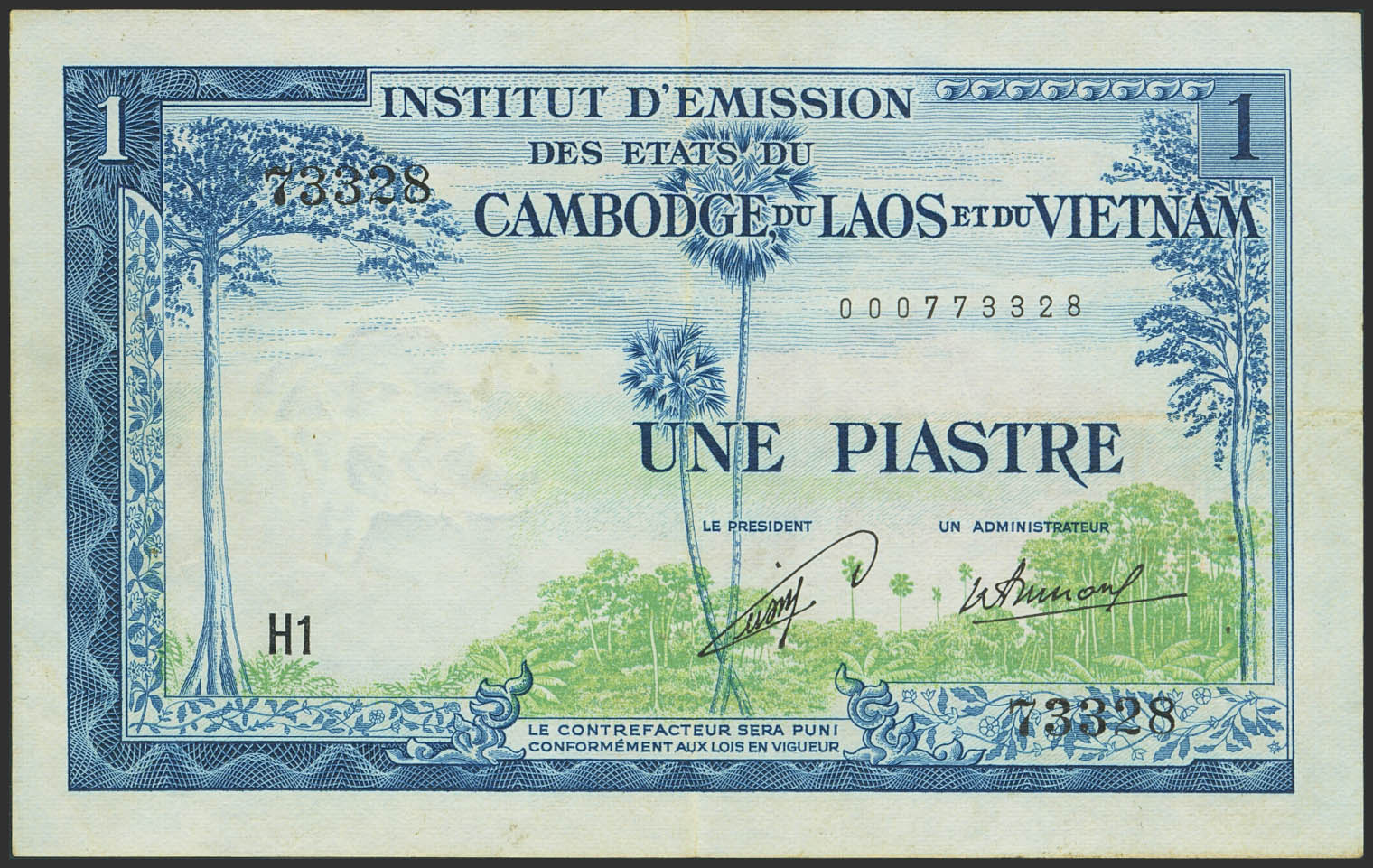 FRENCH INDOCHINA. 1 Piastre. (1954ca). Institut d'Emission des Etats du Cambodge, du Laos et du Viet-Nam. Laos. (Pick: 100). More than Very Fine.