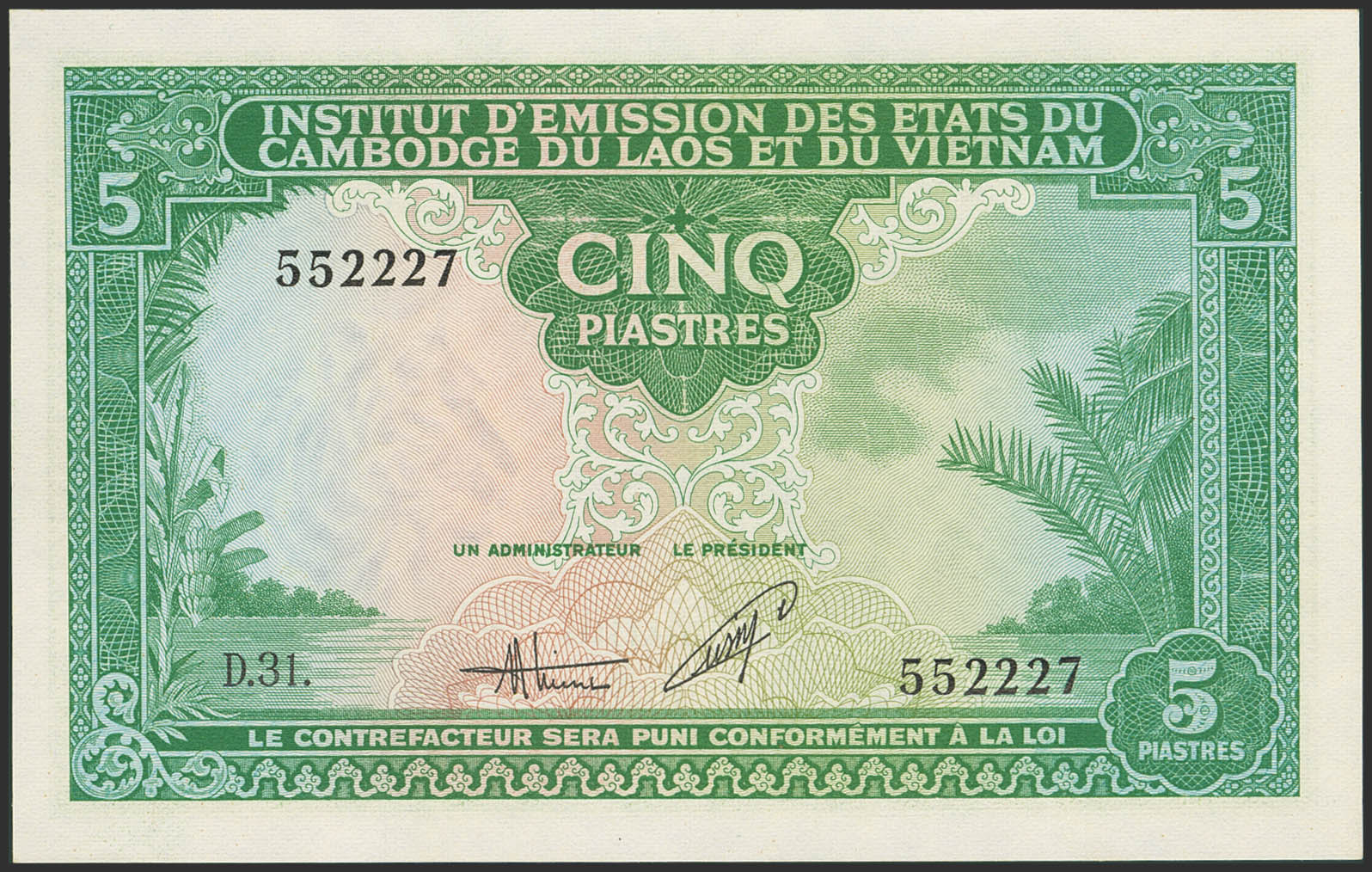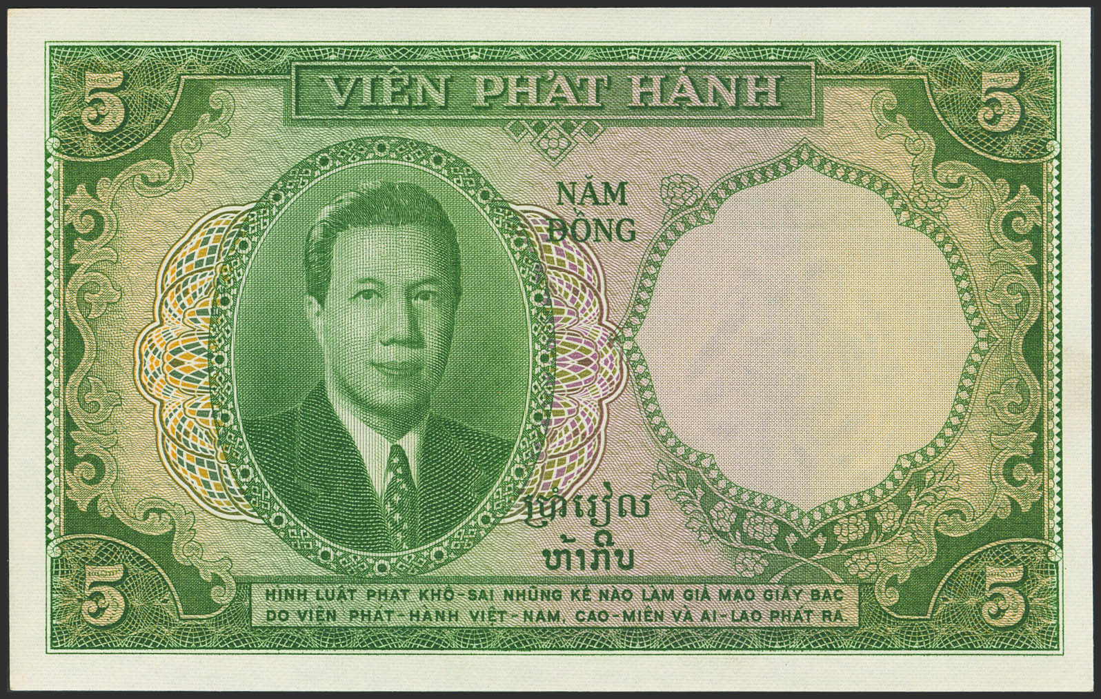FRENCH INDOCHINA. 5 Piastres. (1953ca). Institut d'Emission des Etats du Cambodge, du Laos et du Viet-Nam. Vietnam. (Pick: 106). About Uncirculated.
