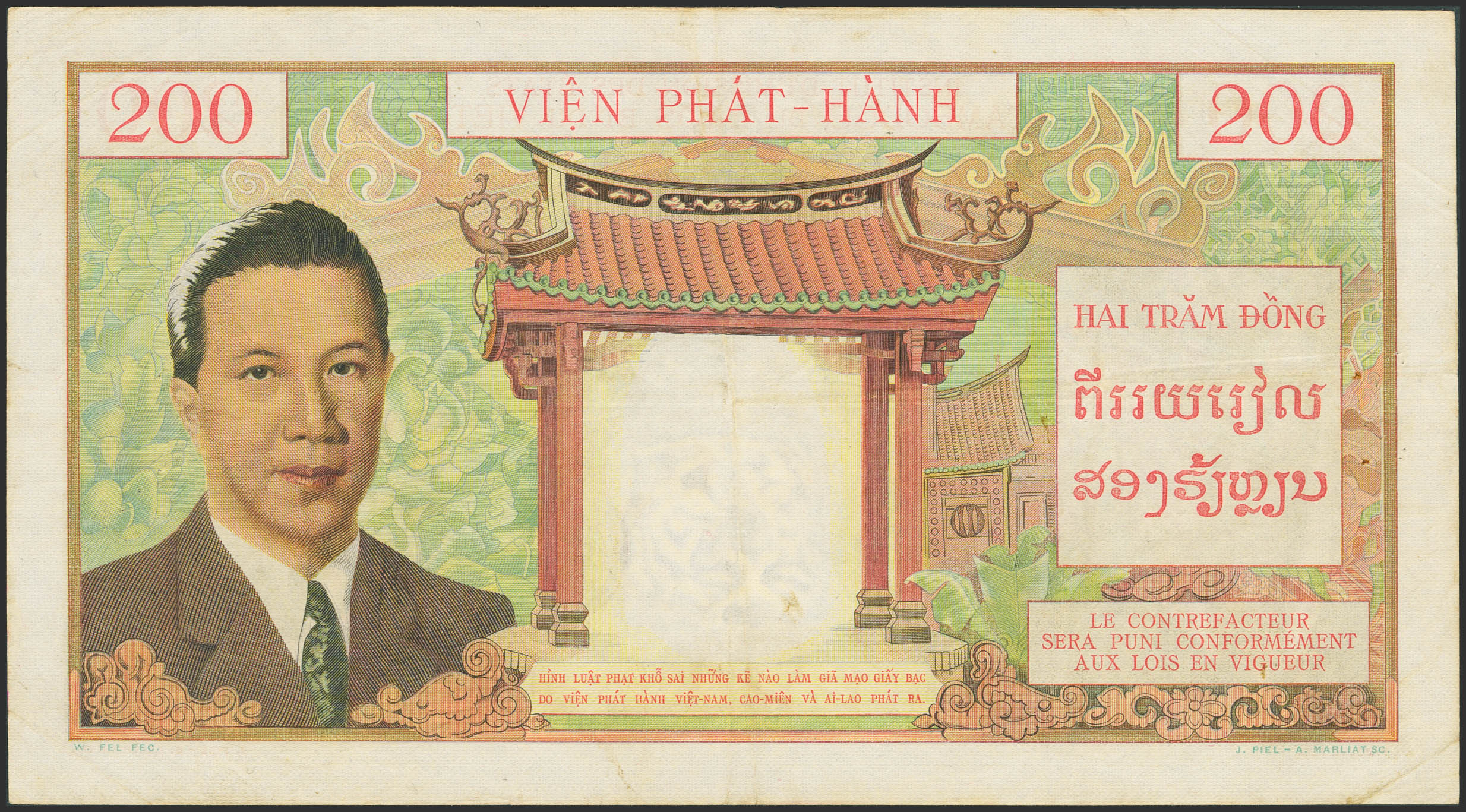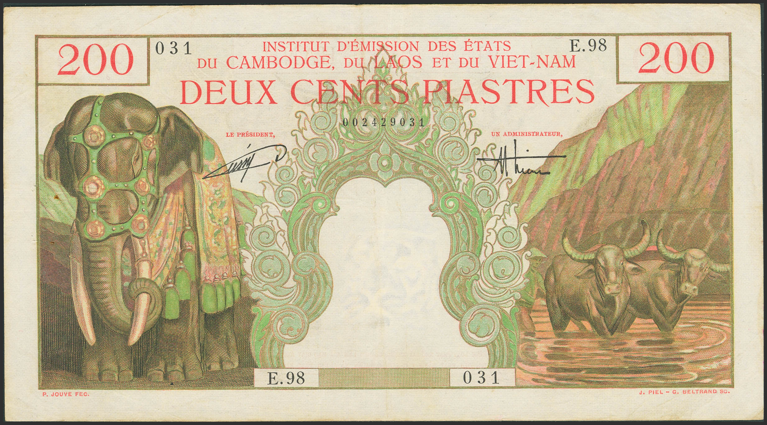 FRENCH INDOCHINA. 200 Piastres. (1953ca). Institut d'Emission des Etats du Cambodge, du Laos et du Vietnam. Vietnam. (Pick: 109). Extremely Fine.