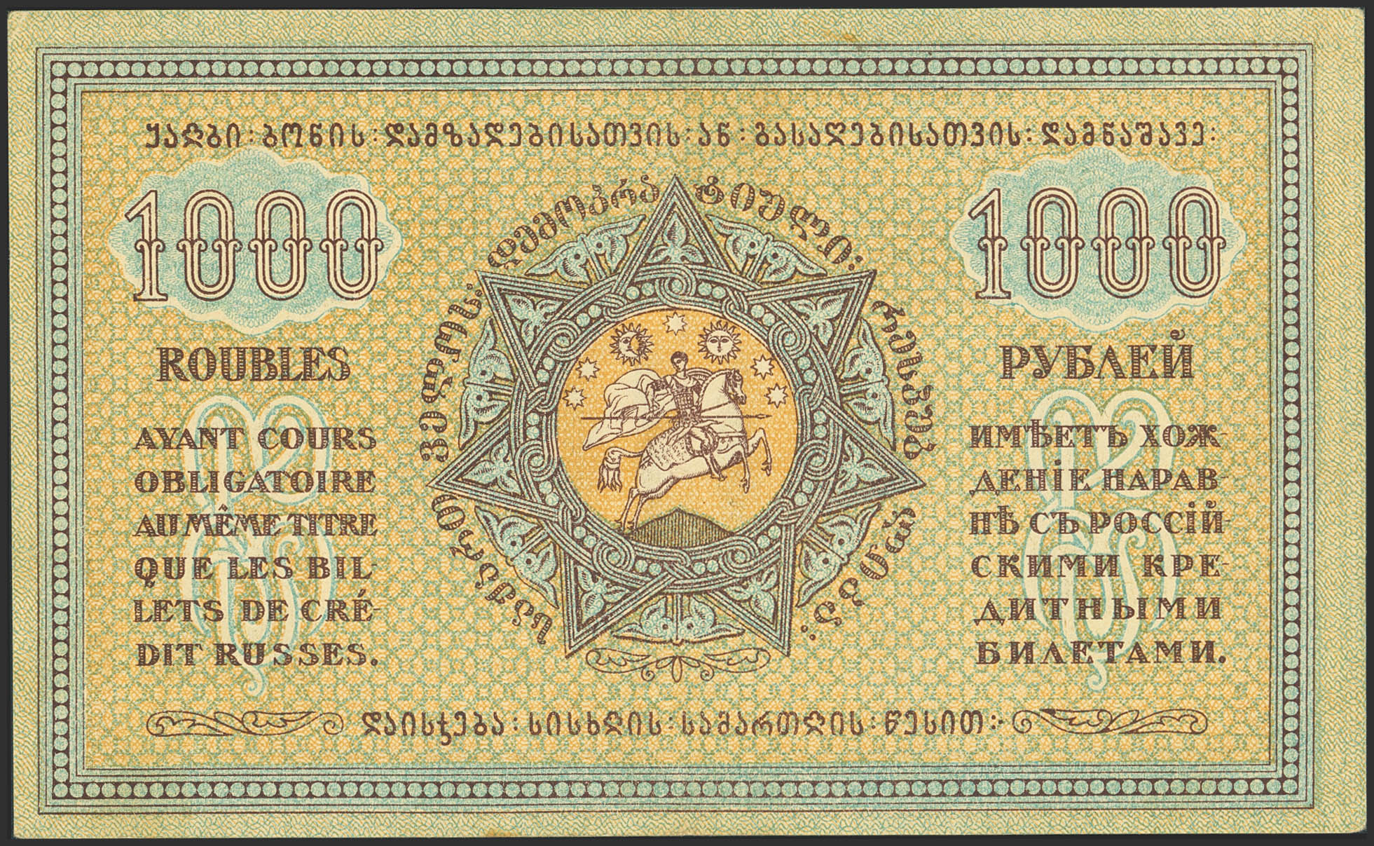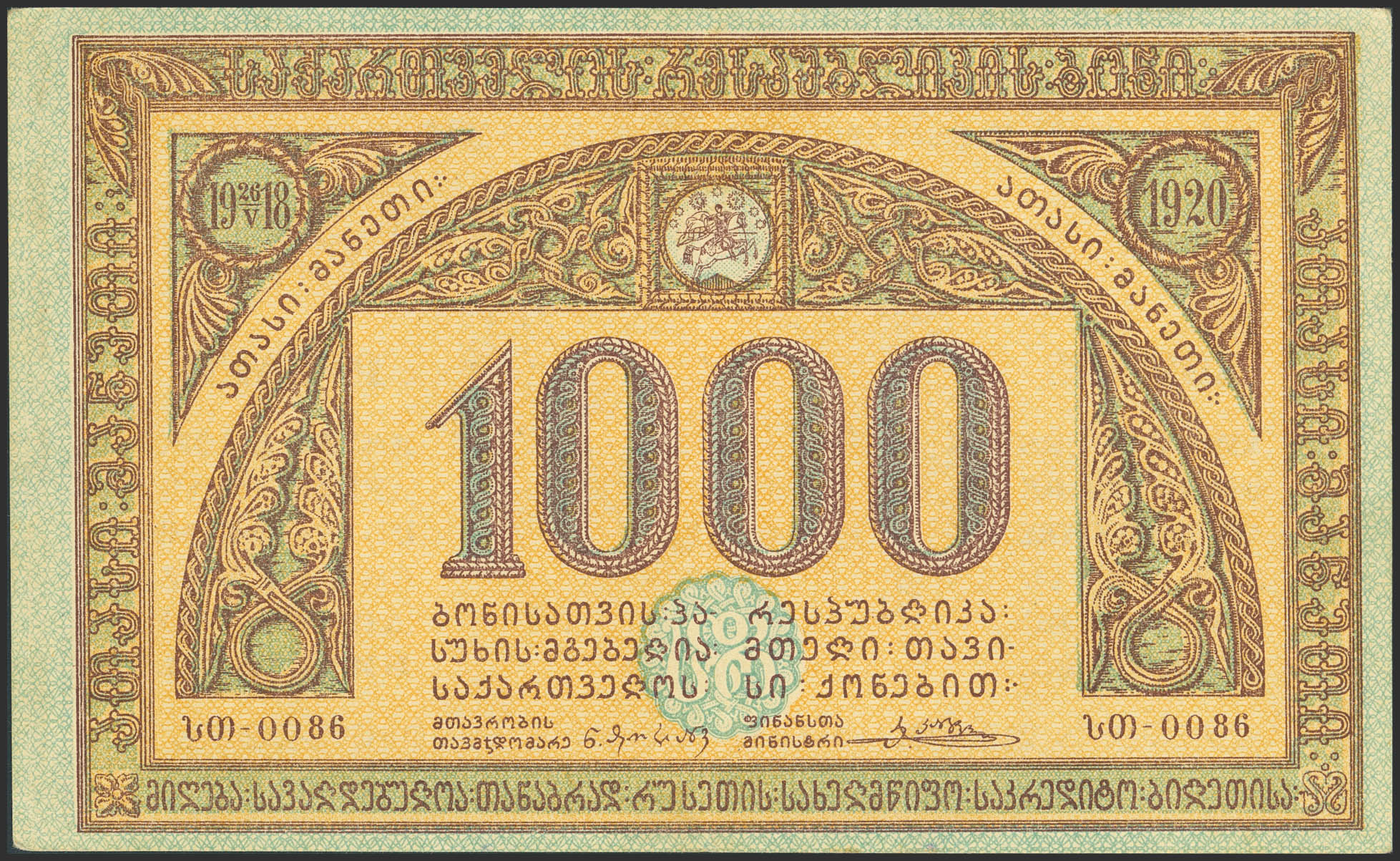 GEORGIA. 1000 Maneti. 1920. Georgian Republic. (Pick: 14b). More than Extremely Fine.