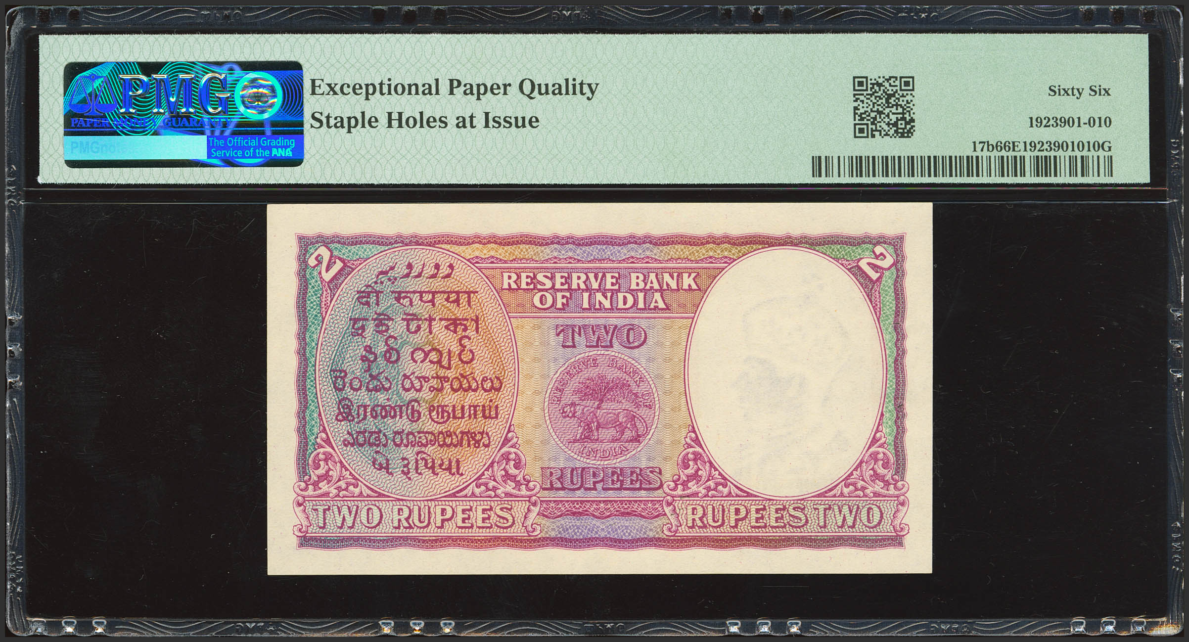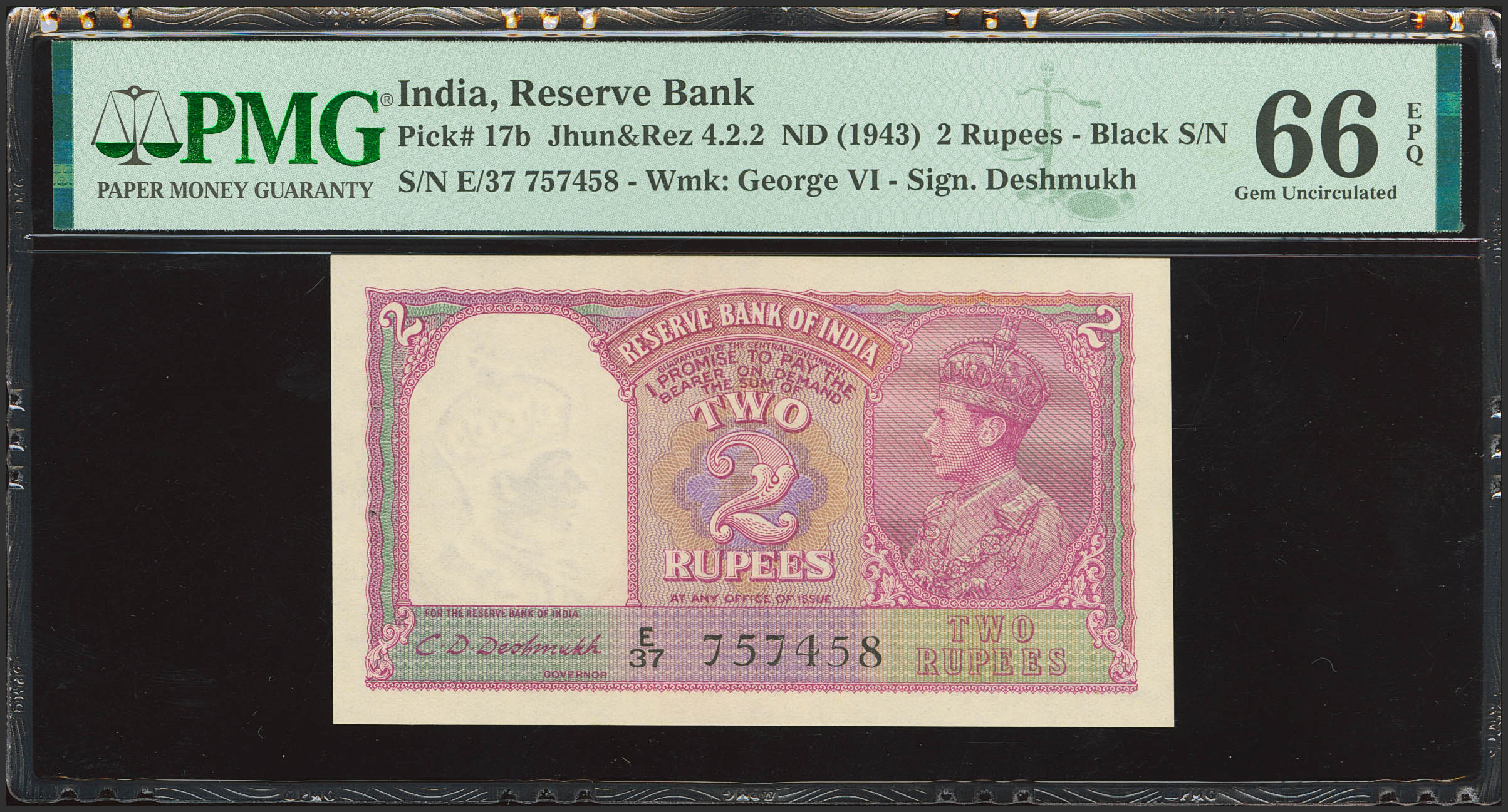 INDIA. 2 Rupees. (1937ca). Reserve Bank. Deshmukh. (Pick: 17b). PMG66EPQ (staple holes at Issue).