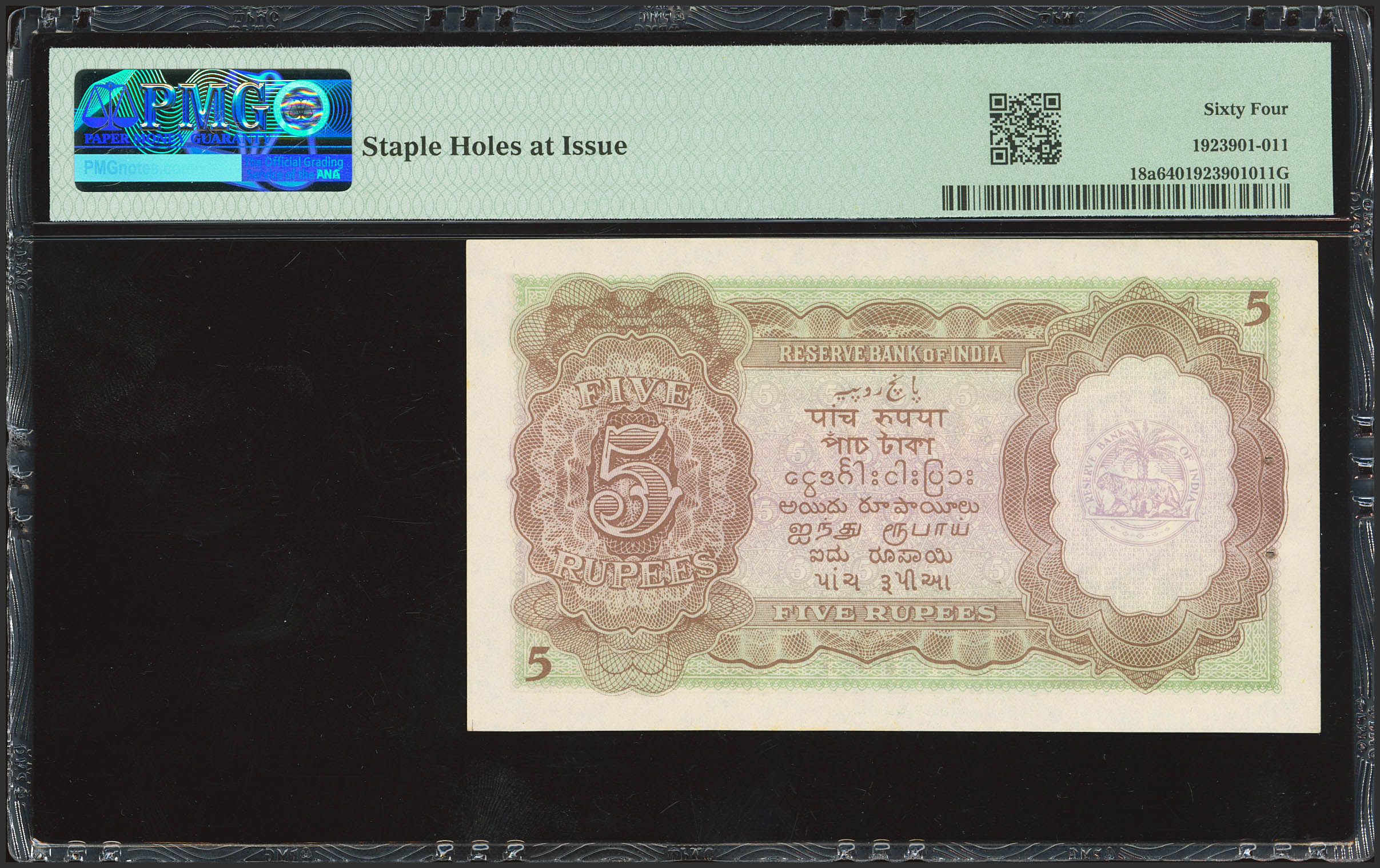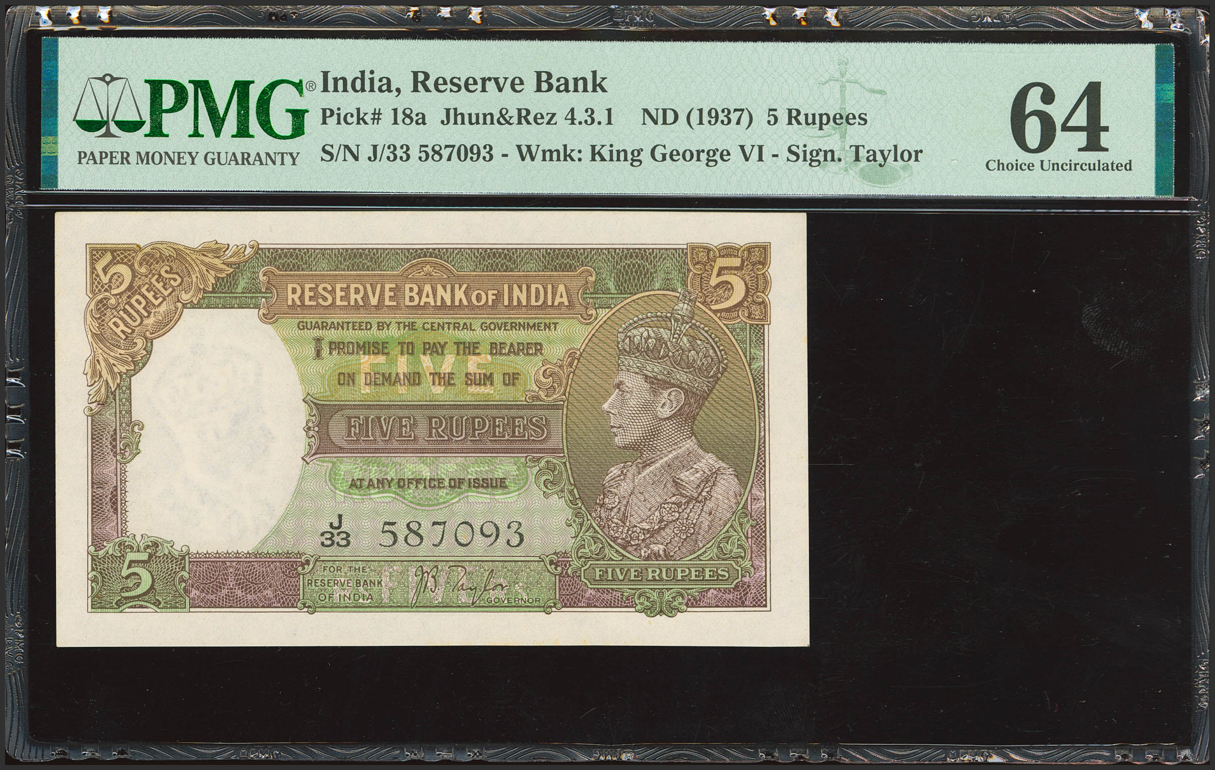 INDIA. 5 Rupees. (1937ca). Reserve Bank. Taylor. (Pick: 18a). PMG64 (staple holes at Issue).