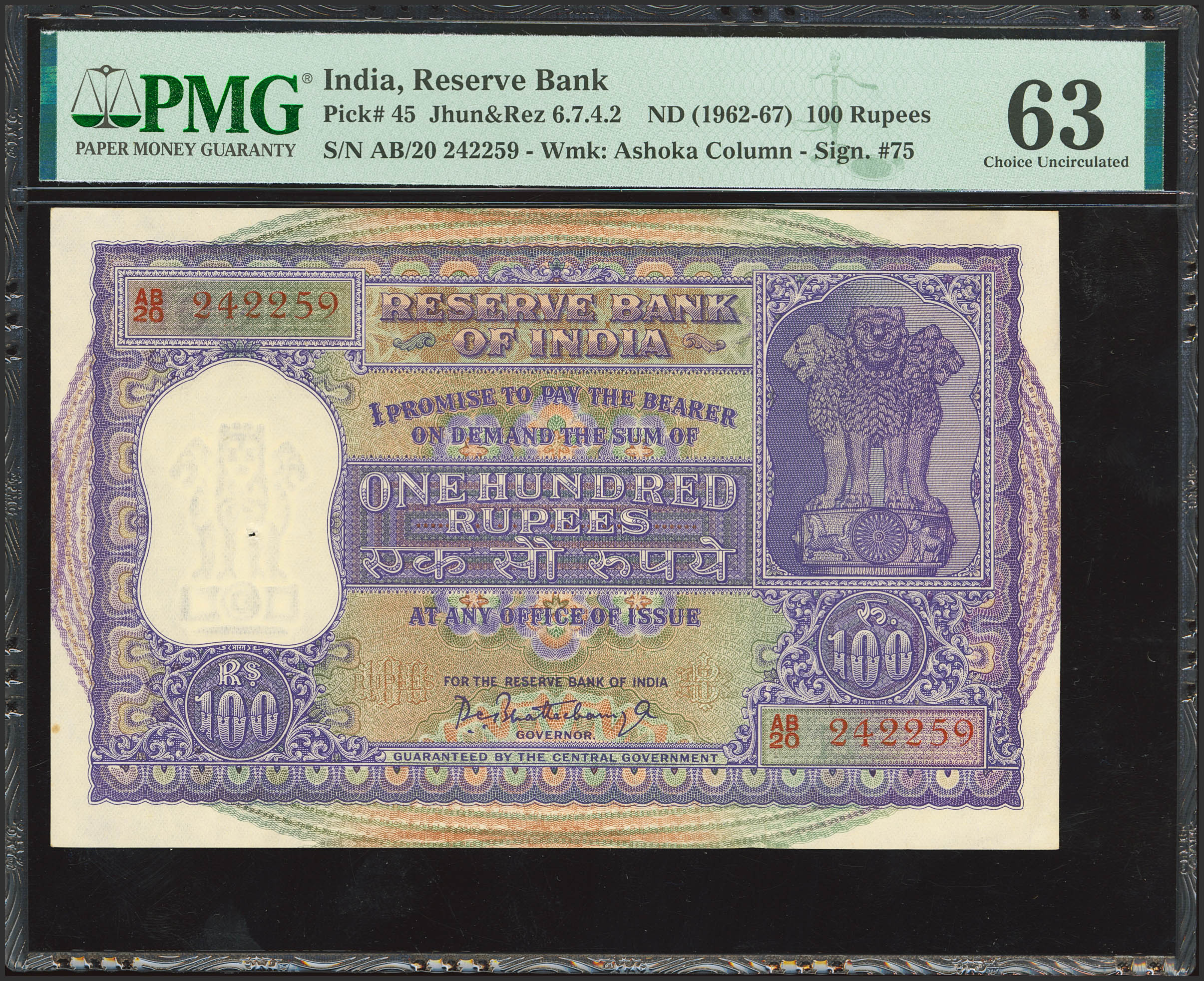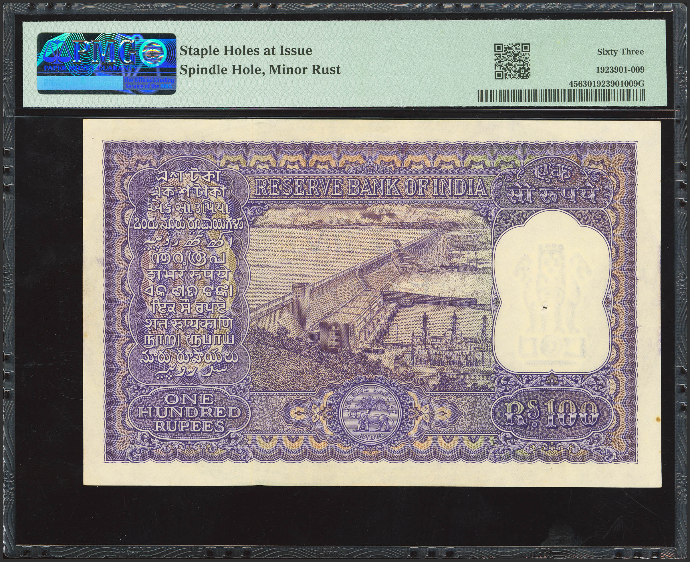 INDIA. 100 Rupees. (1962ca). Reserve Bank. (Pick: 45). PMG63 (staple holes at Issue, spindle holes, minor rust).