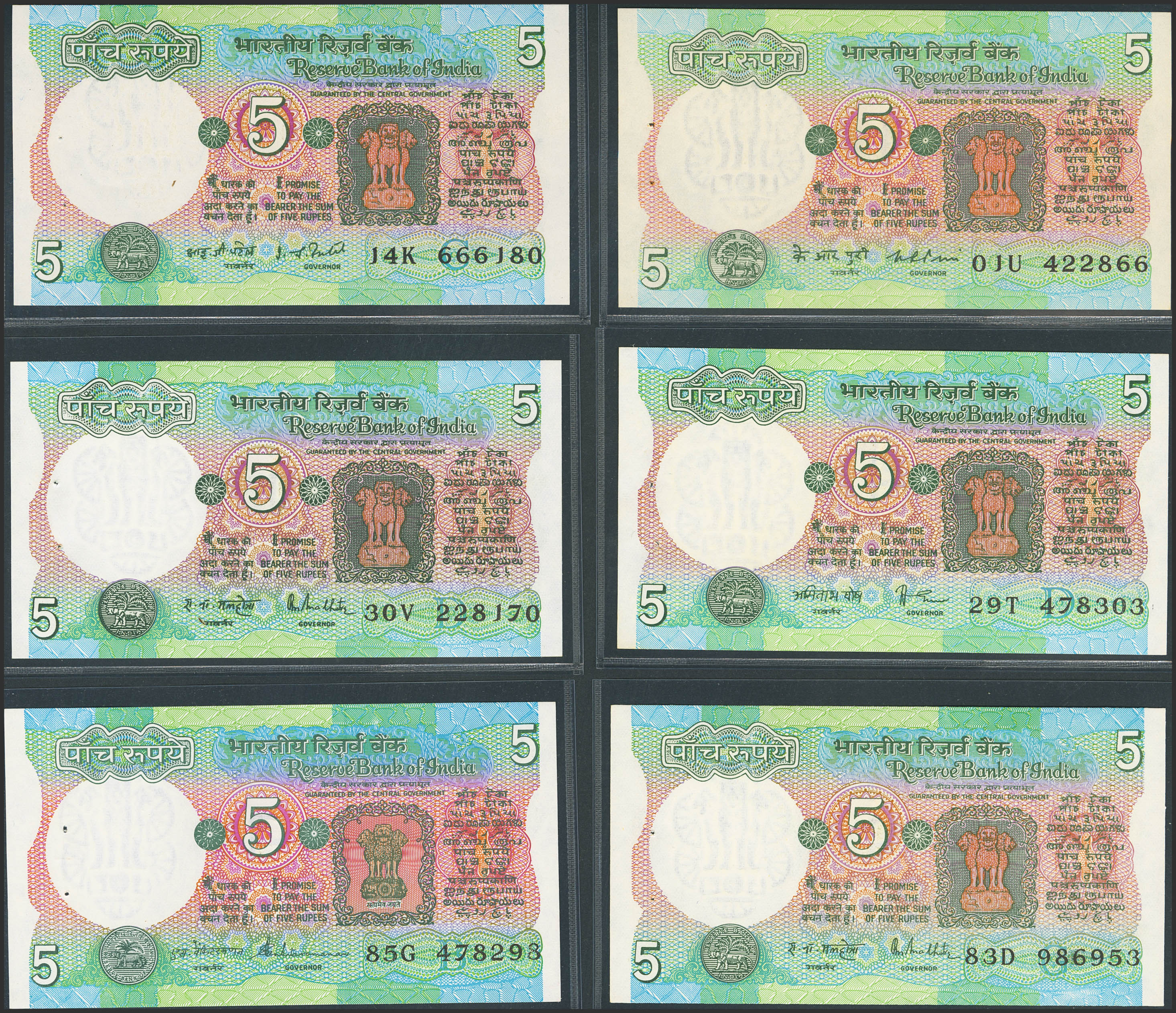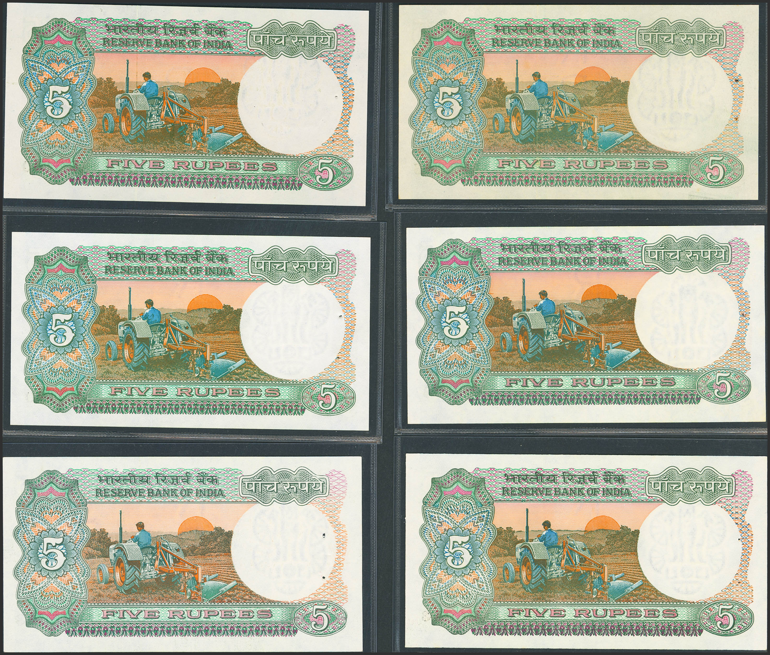 INDIA. Lot of 6 notes of 5 Rupees. (1975ca). Reserve Bank. Different signatures. (Pick: 80b, 80g, 80j, 80k, 80n, 80q). Almost Uncirculated / Uncirculated, staple holes at issue.