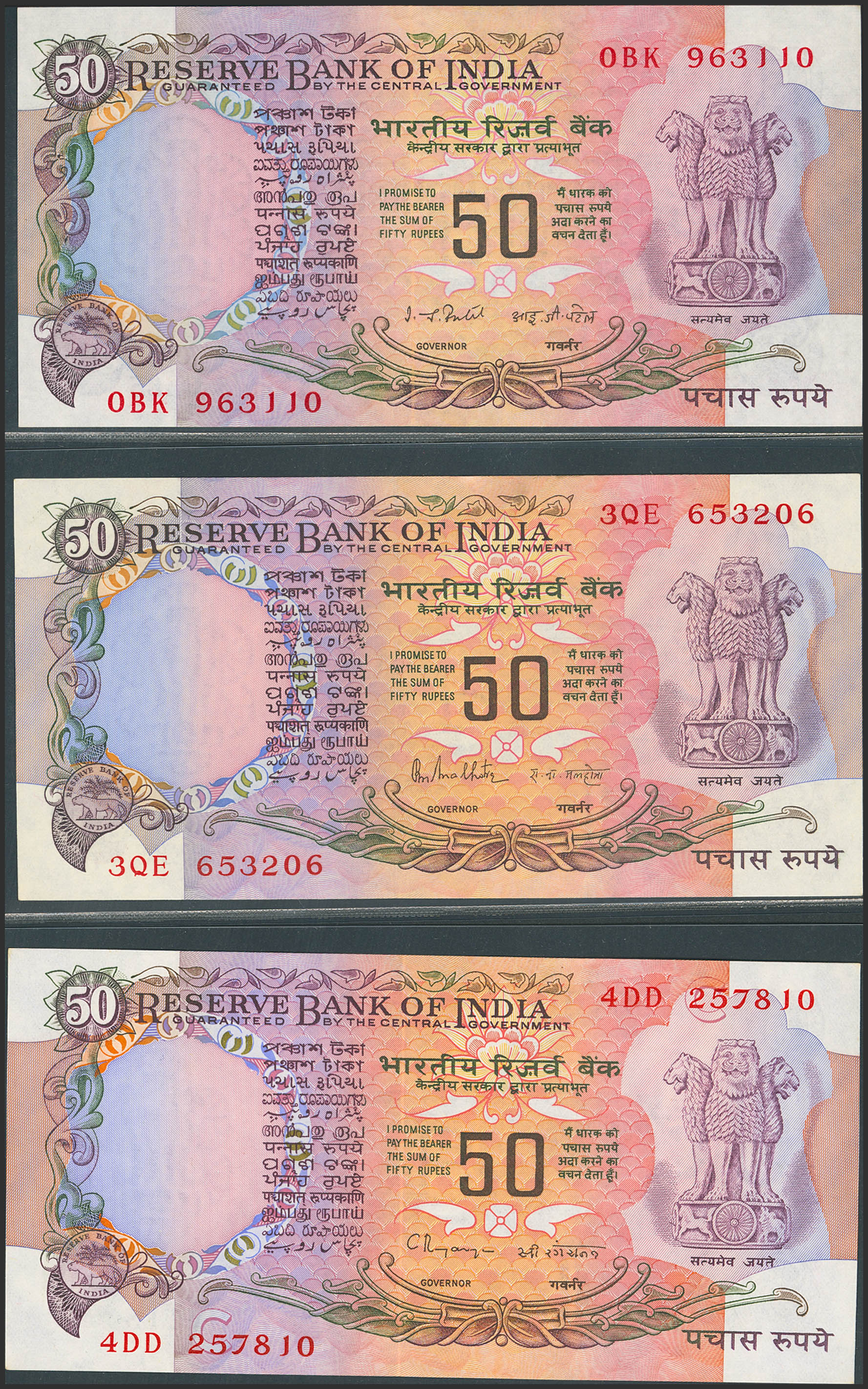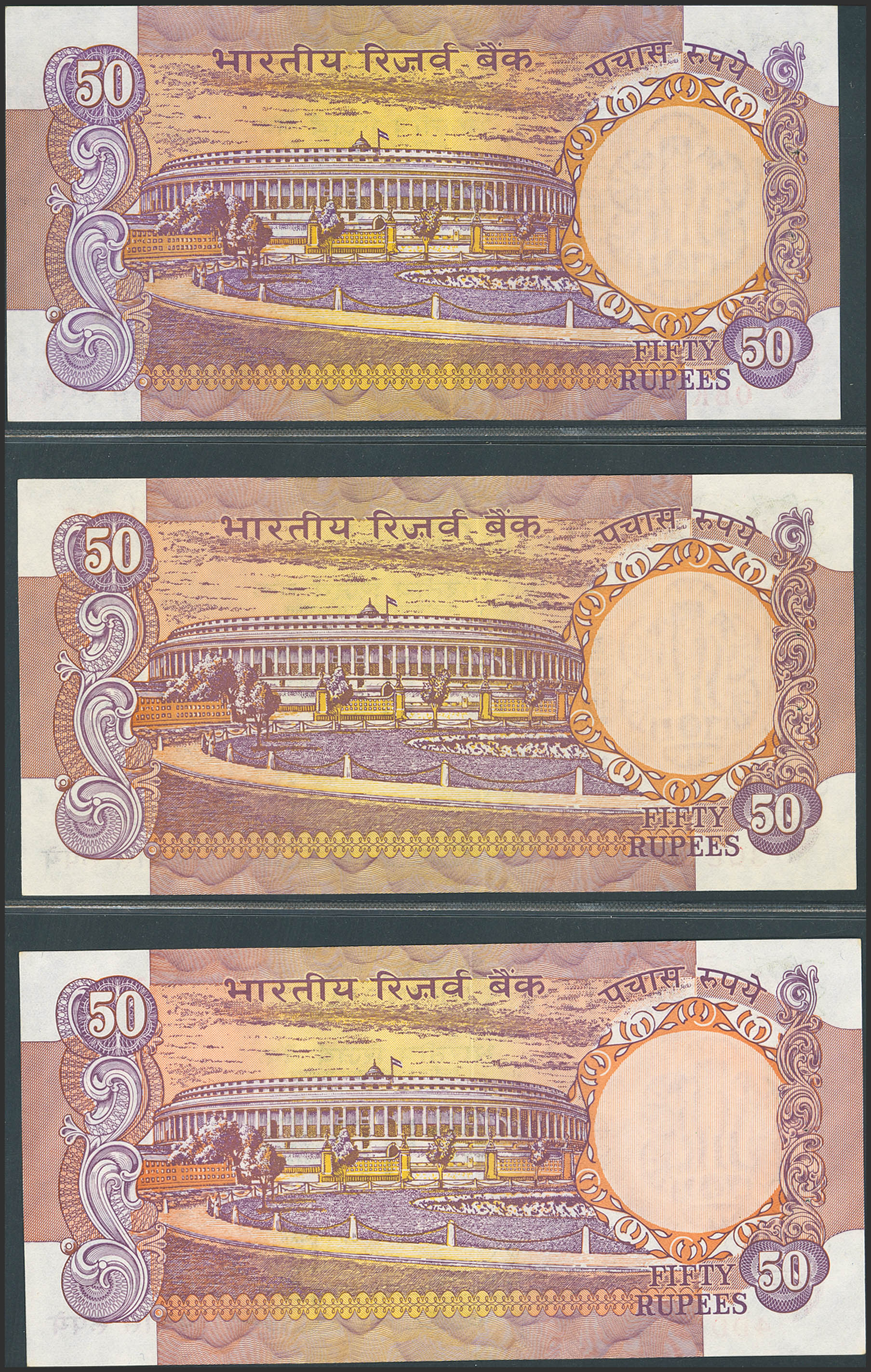 INDIA. Lot of 3 notes of 50 Rupees. (1978ca). Reserve Bank. Different signatures. (Pick: 84a, 84c, 84j). Almost Uncirculated (2) and Uncirculated (1), staple holes at issue.