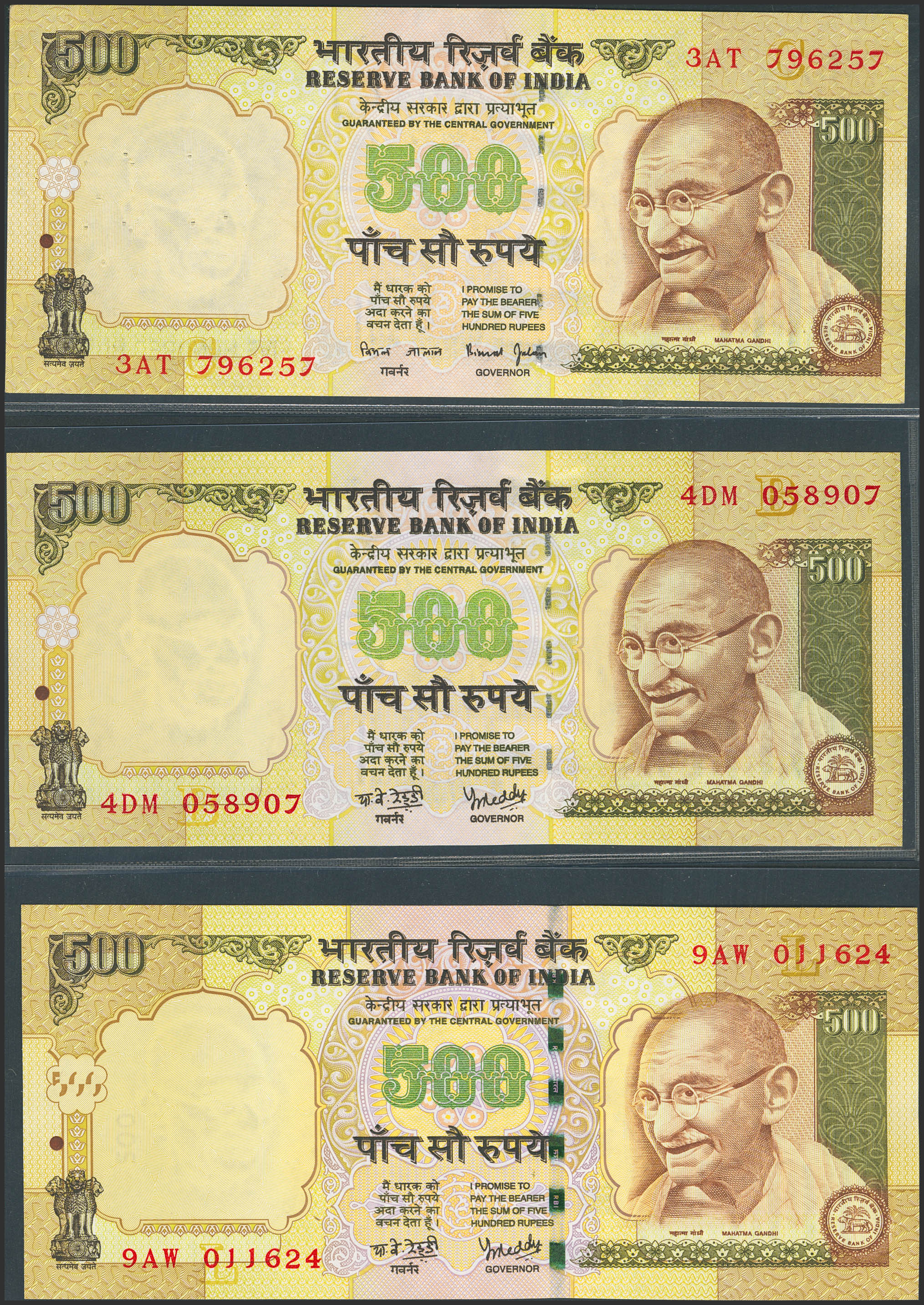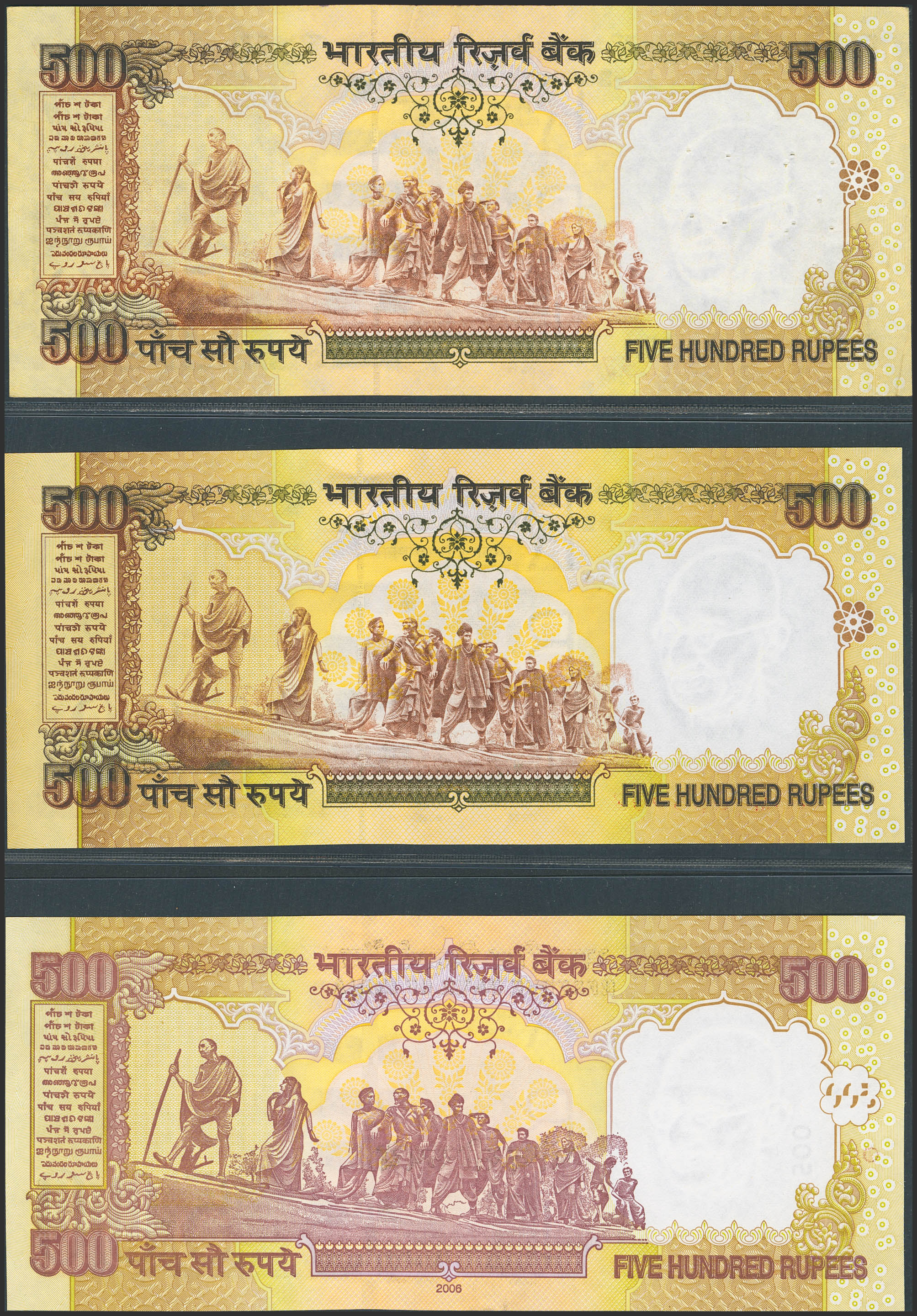INDIA. Lot of 3 notes of 500 Rupees. (2000ca). Reserve Bank. (Pick: 93d, 93g, 99f). Extremely Fine (1) and Uncirculated (2), staple holes at issue, pinholes and graffiti on one of them.