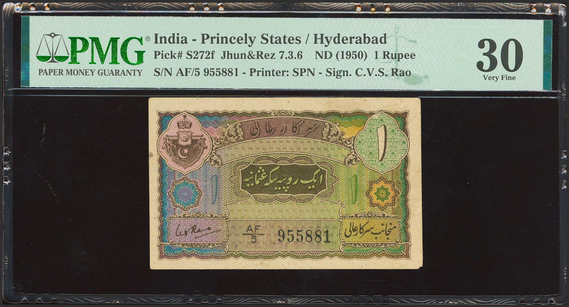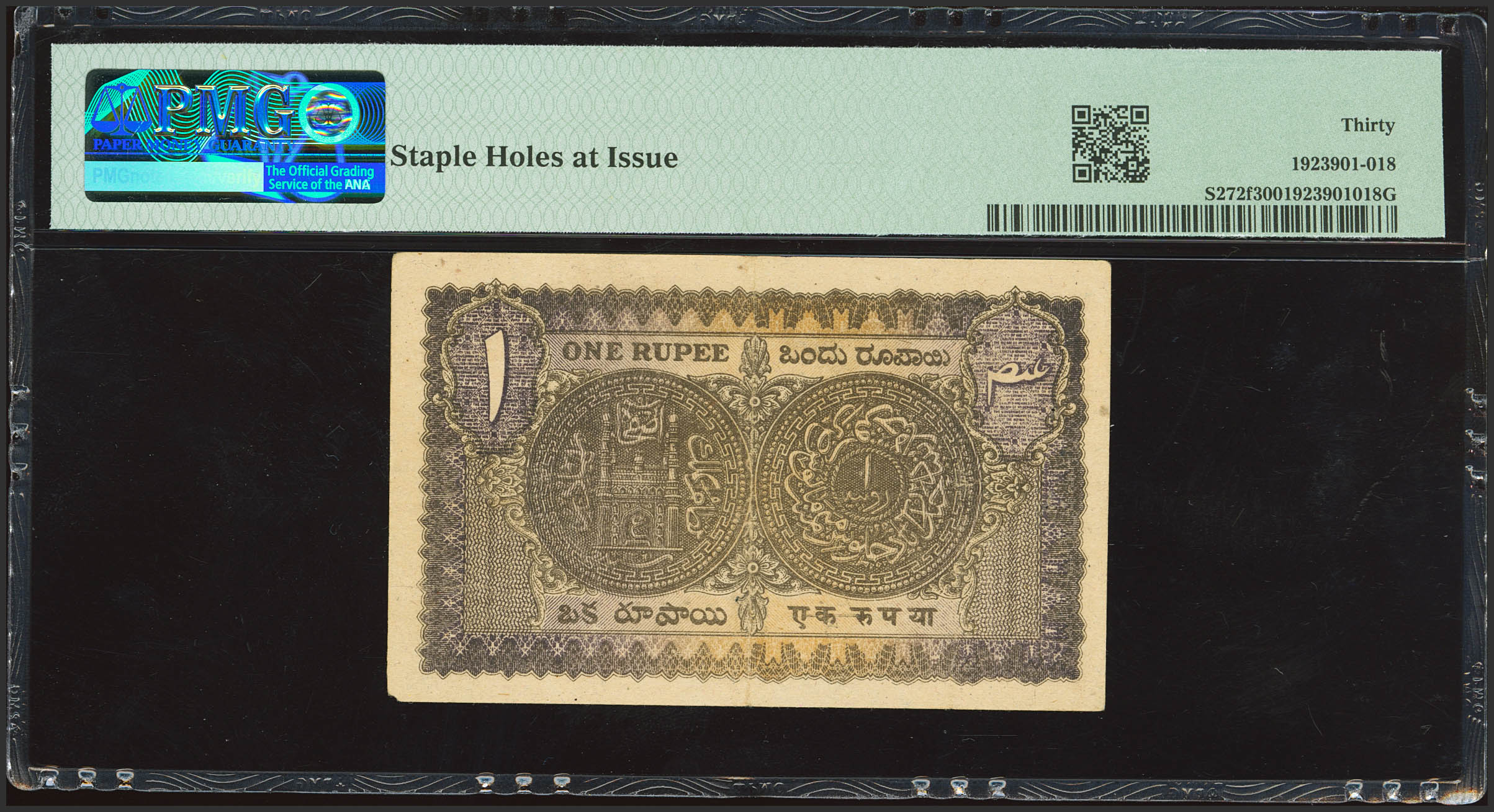 INDIA-PRINCELY STATES. 1 Rupee. (1950ca). Government of Hyderabad. C.V.S. Rao. (Pick: S272f). PMG30 (staple holes at Issue).