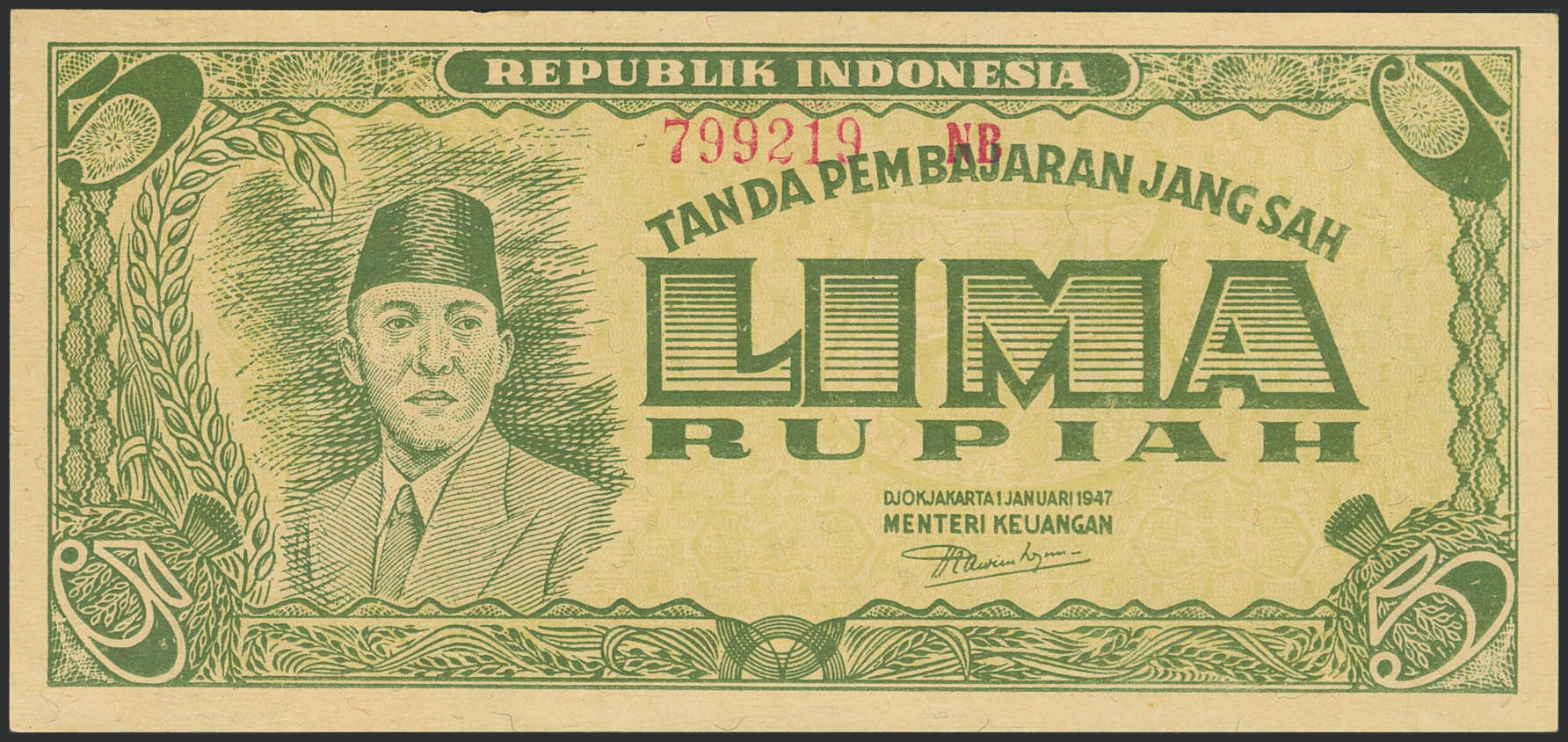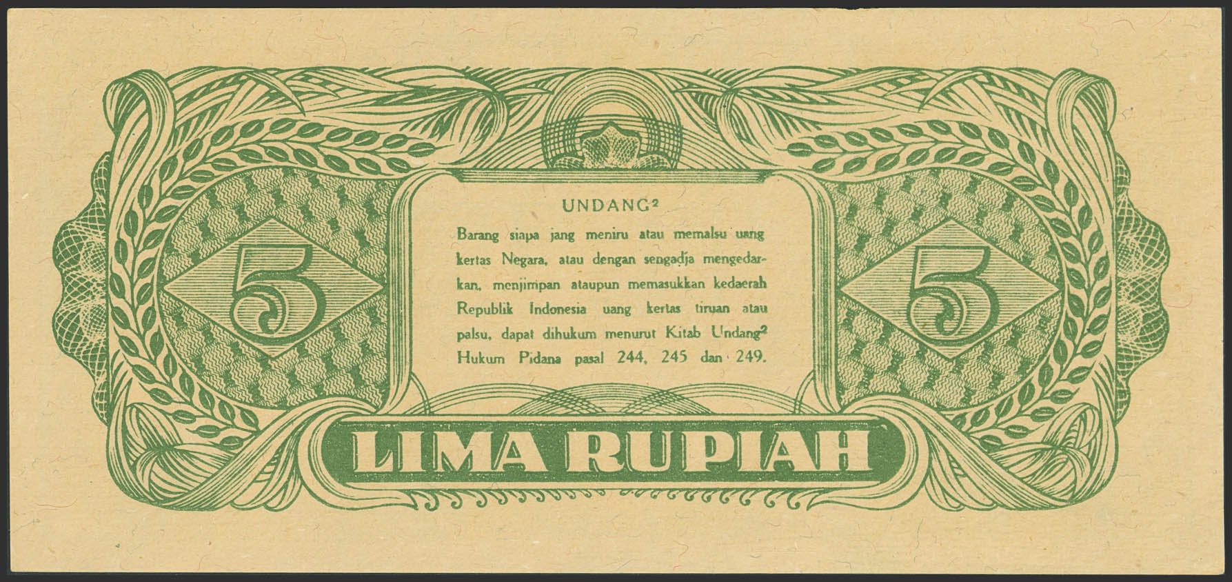 INDONESIA. 5 Rupiah. 1 January 1945. Republic Indonesia. (Pick: 21). Less than Uncirculated.