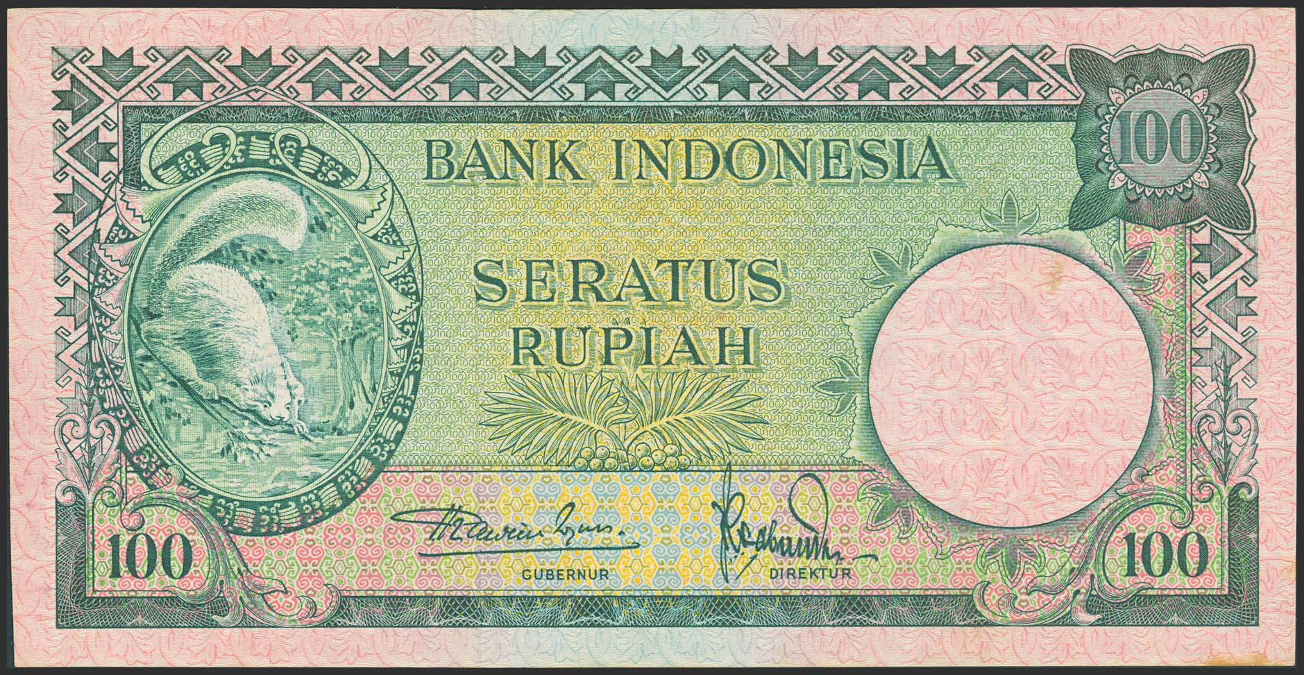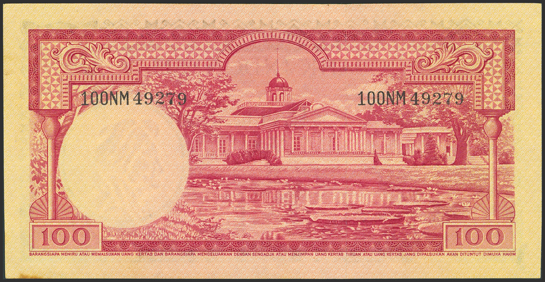 INDONESIA. 100 Rupiah. (1957ca). Bank Indonesia. (Pick: 51). About Uncirculated, rust on lower.