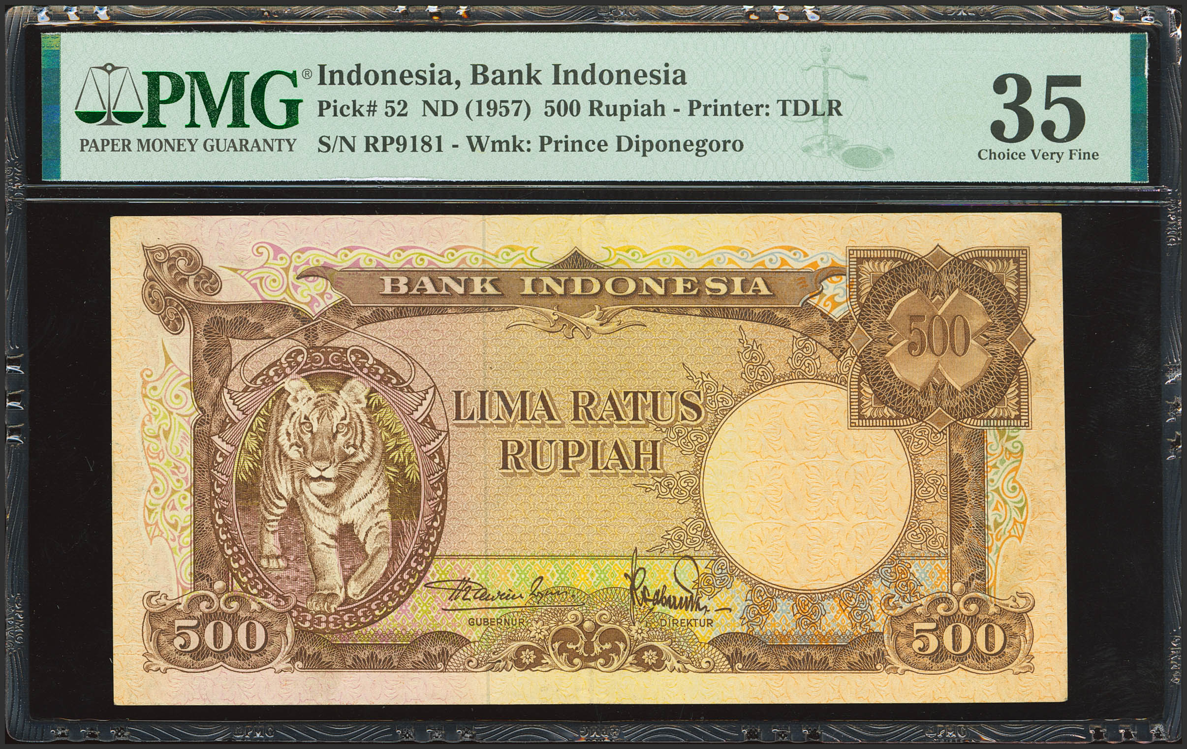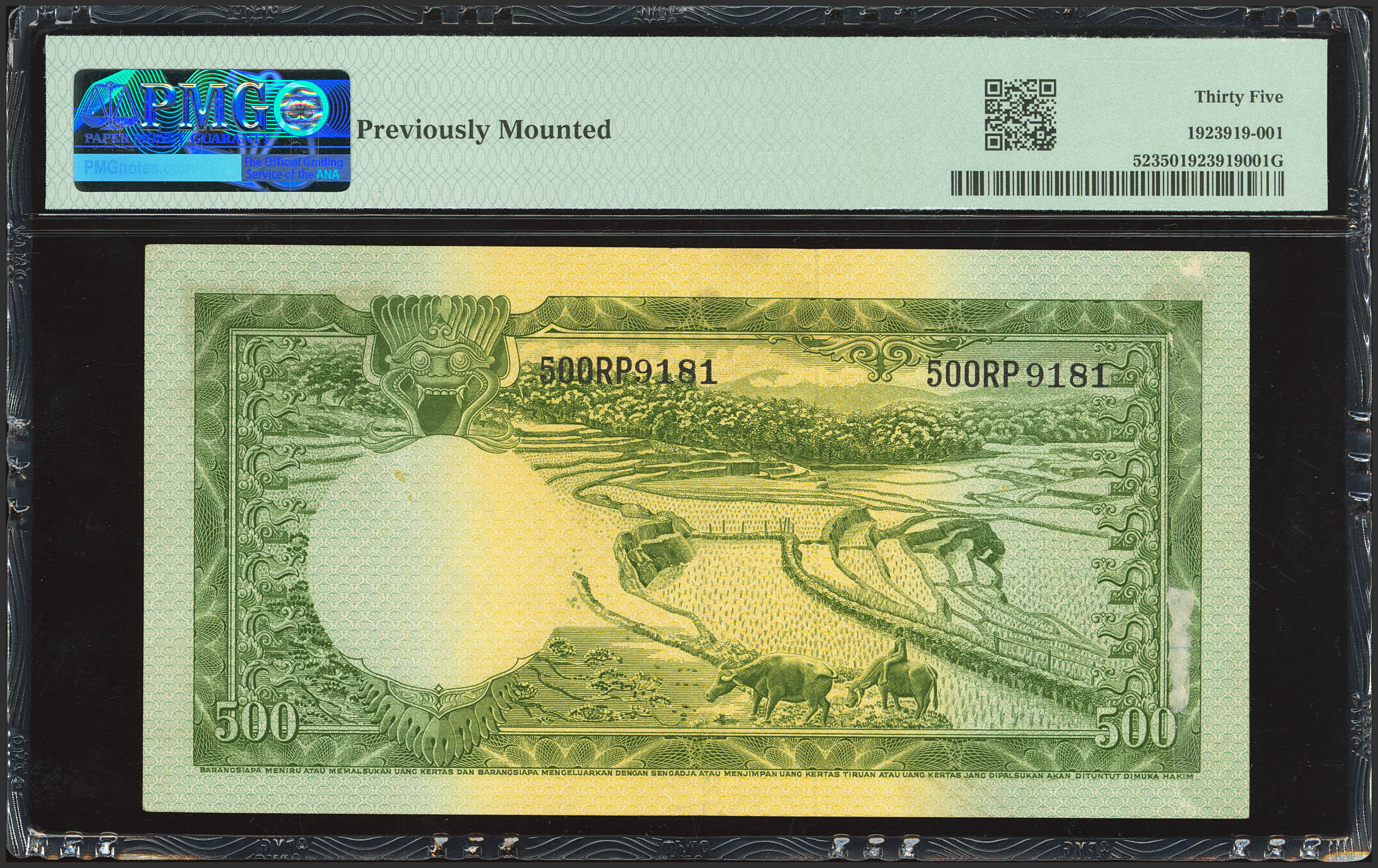 INDONESIA. 500 Rupiah. (1957ca). Bank Indonesia. (Pick: 52). PMG35 (previously mounted).