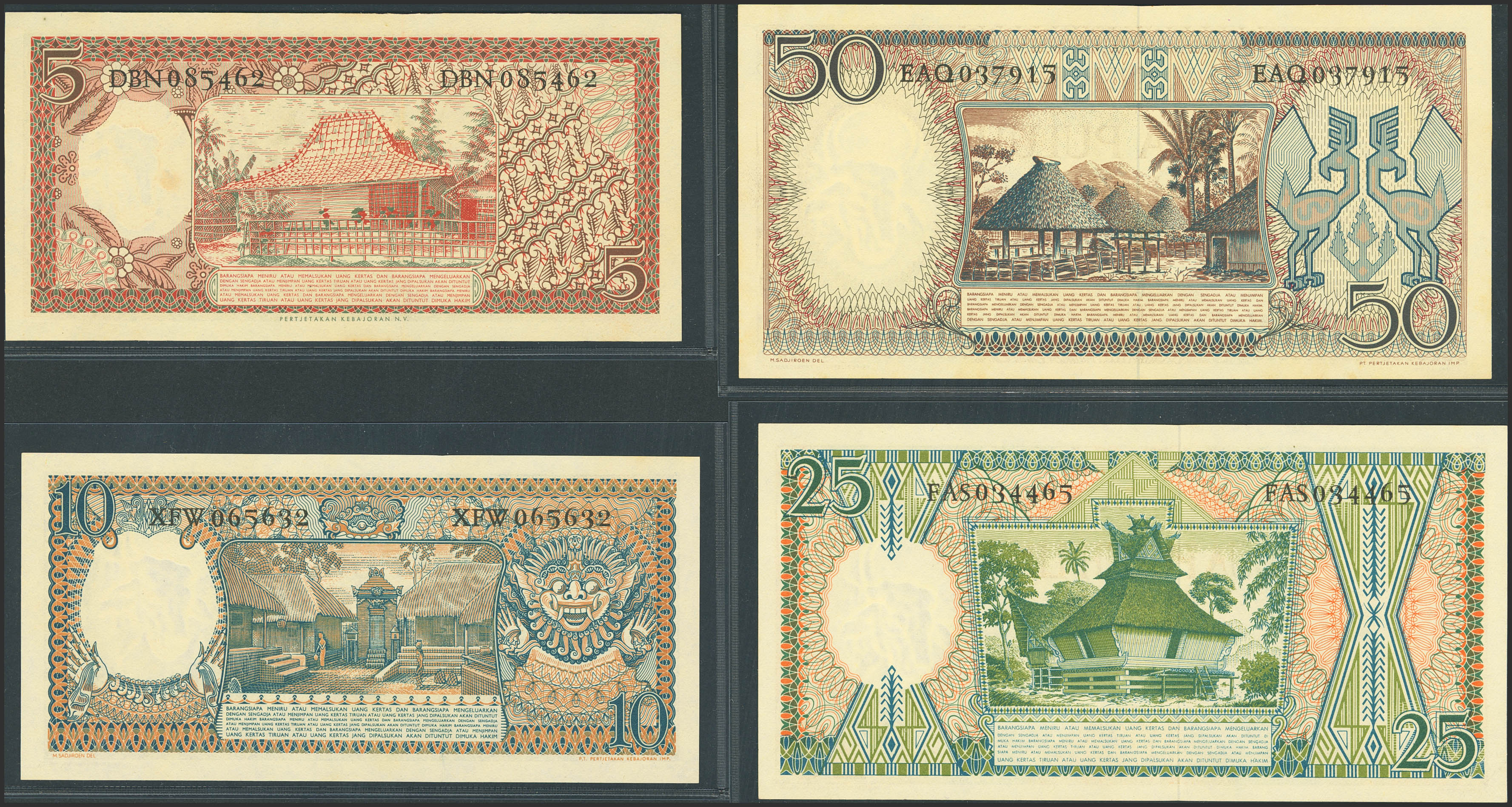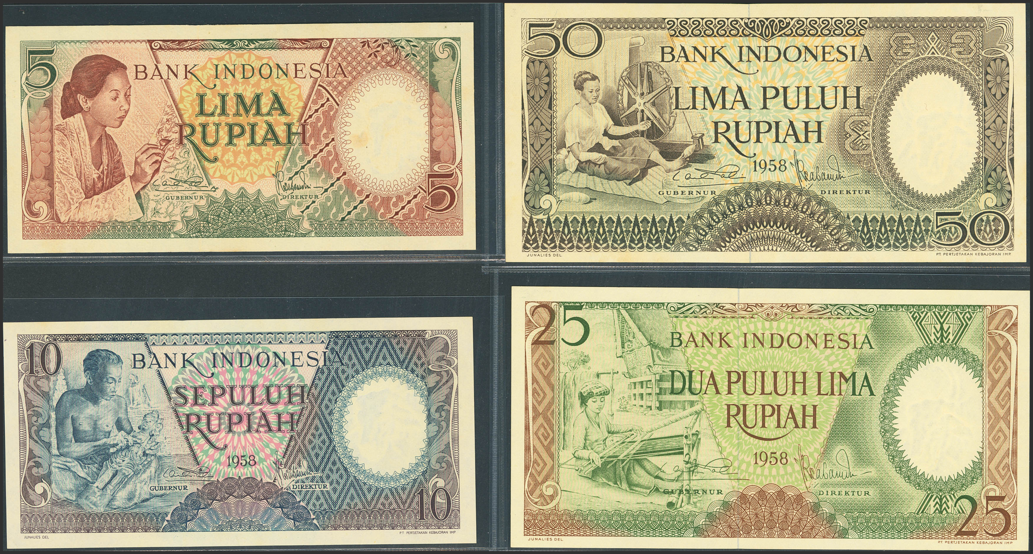 INDONESIA. Lot of 4 notes from 5 at 50 Rupiah. 1958. Bank Indonesia. (Pick: 55, 56, 57, 58). Uncirculated (3) and Less than Uncirculated (1).