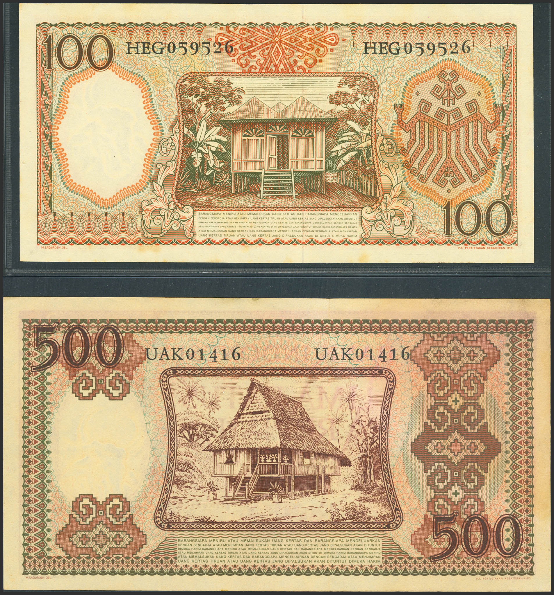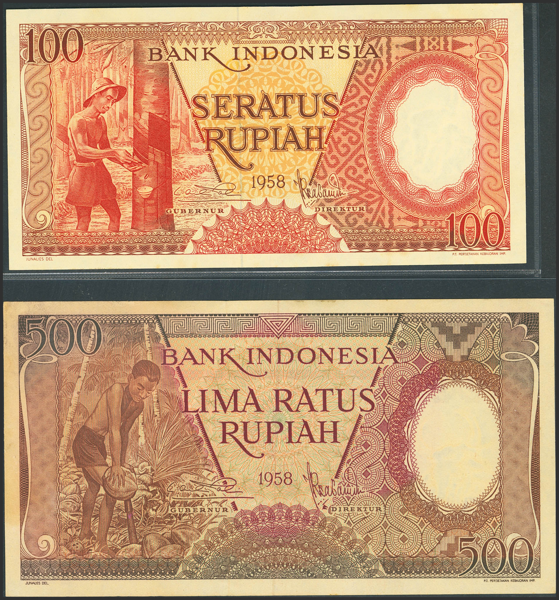 INDONESIA. Lot of 2 notes of 100 and 500 Rupiah. 1958. Bank Indonesia. (Pick: 59, 60). Uncirculated (59) and Almost Uncirculated (60).