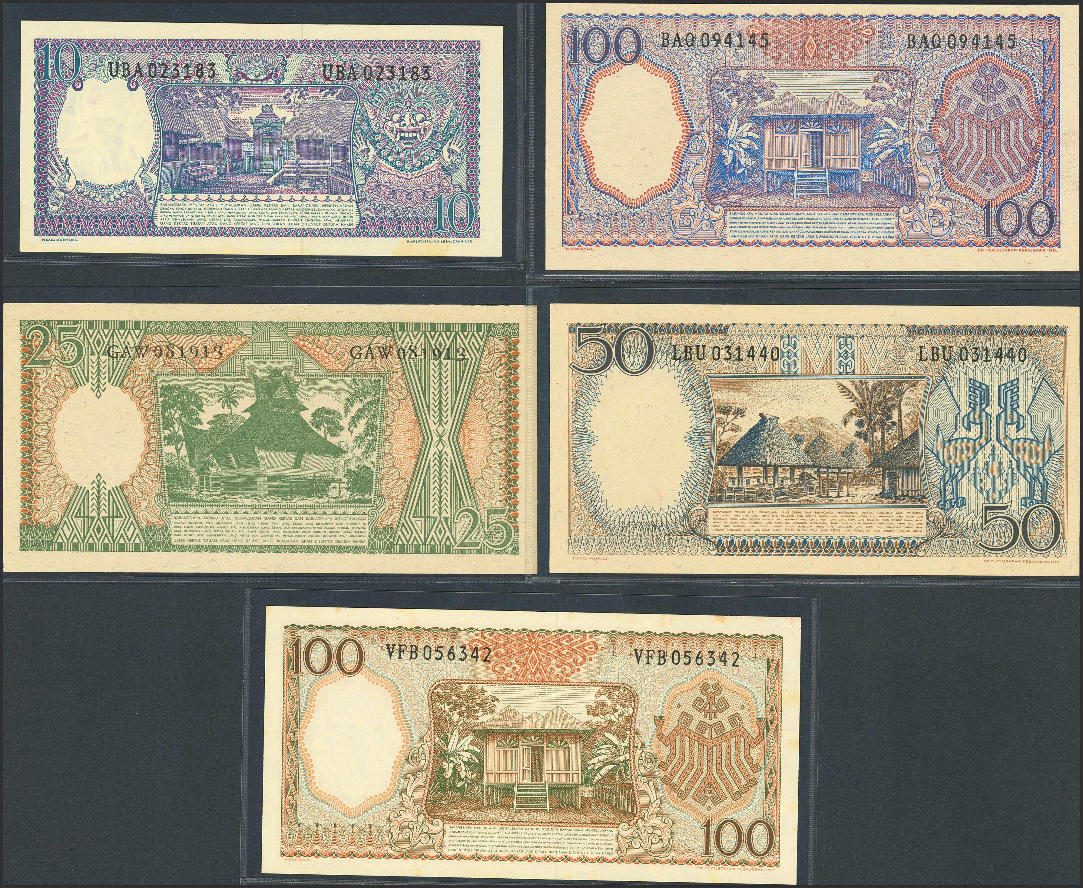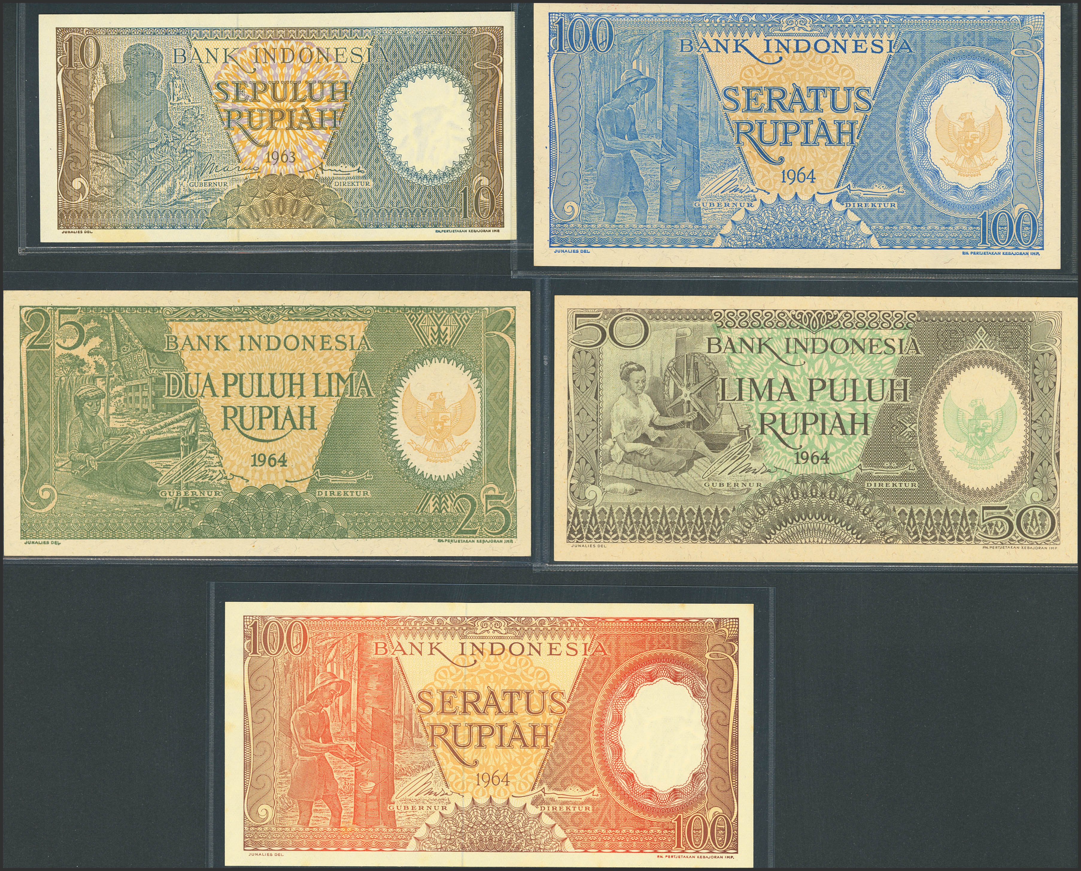 INDONESIA. 100 Rupiah. 1963, 1964. Bank Indonesia. (Pick: 89, 95a, 96, 97b, 98). Uncirculated, one of them has very light stains.