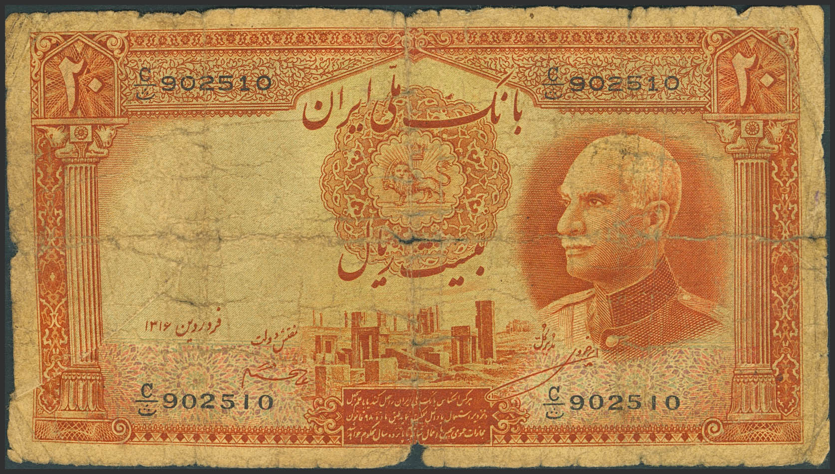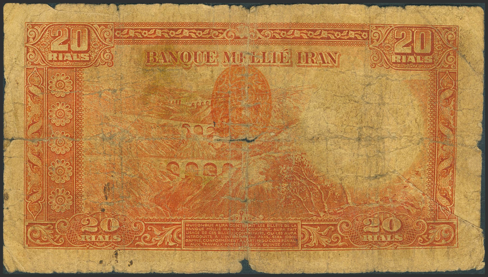 IRAN. 20 Rials. (1937ca). Bank Melli Iran. SH1316. (Pick: 34a). Pinholes, tears. Good.