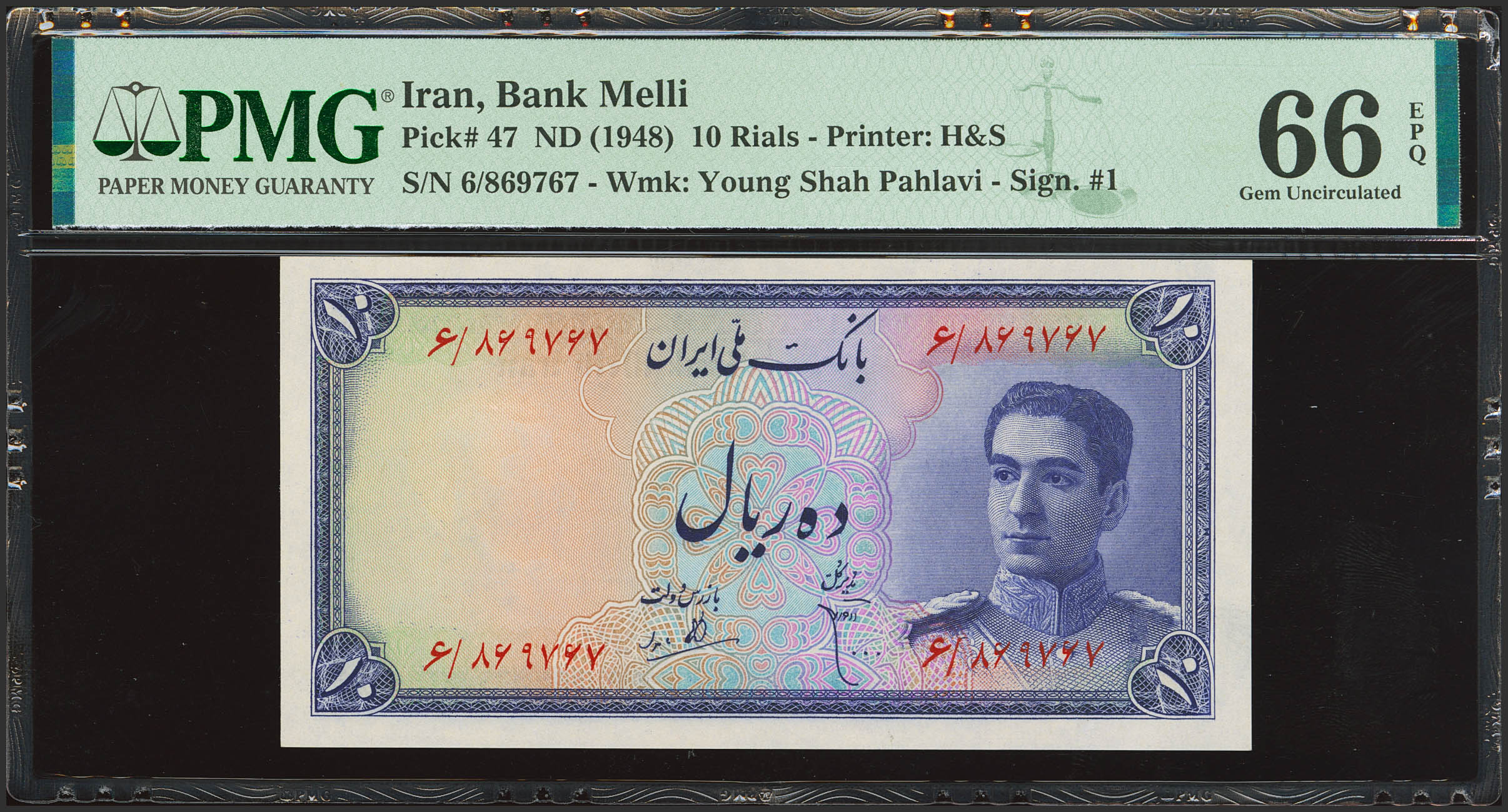 IRAN. 10 Rials. (1948ca). Bank Melli Iran. (Pick: 47). PMG66EPQ.