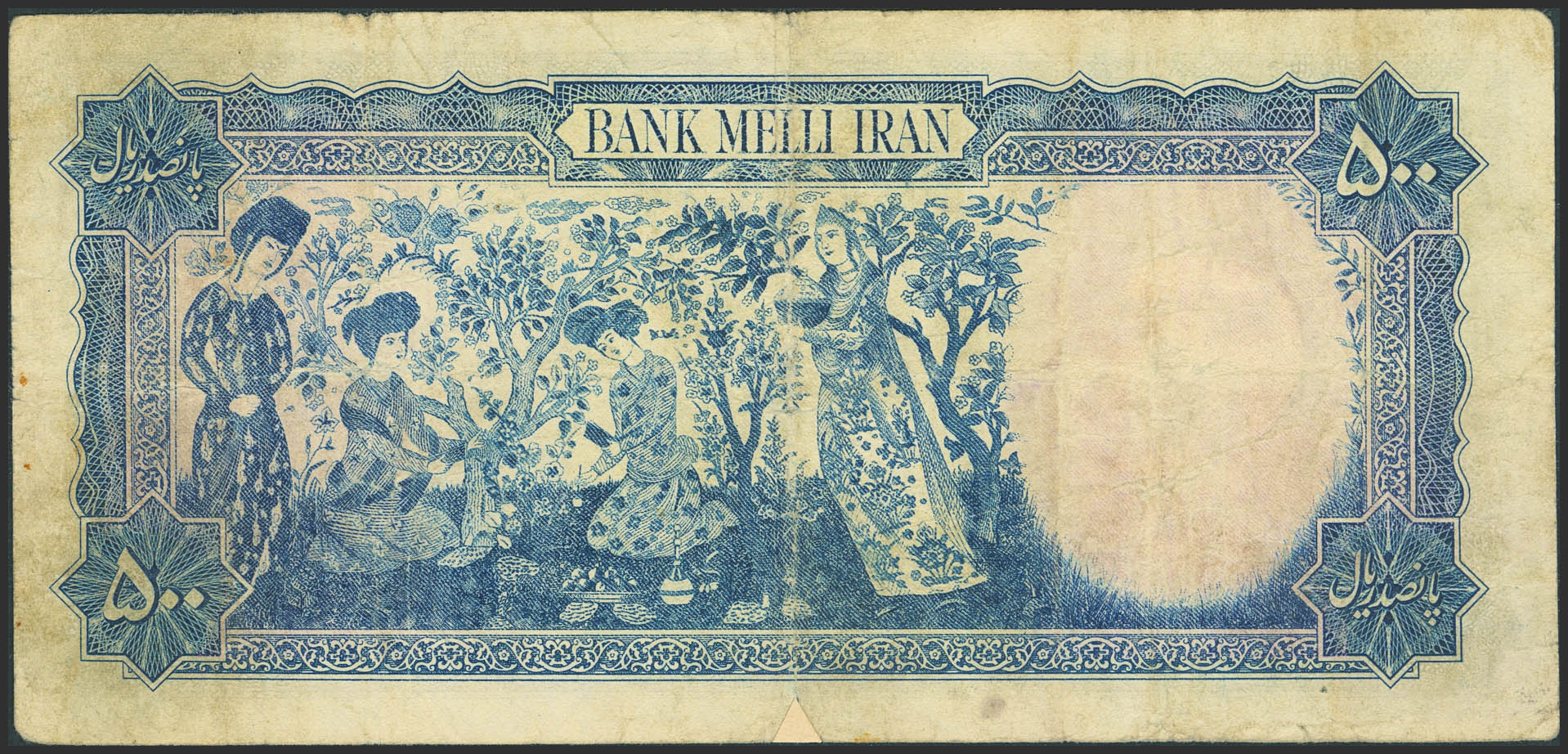 IRAN. 500 Rials. (1951ca). Bank Melli Iran. (Pick: 52). Adhesive paper added over tear on central fold. Fine.