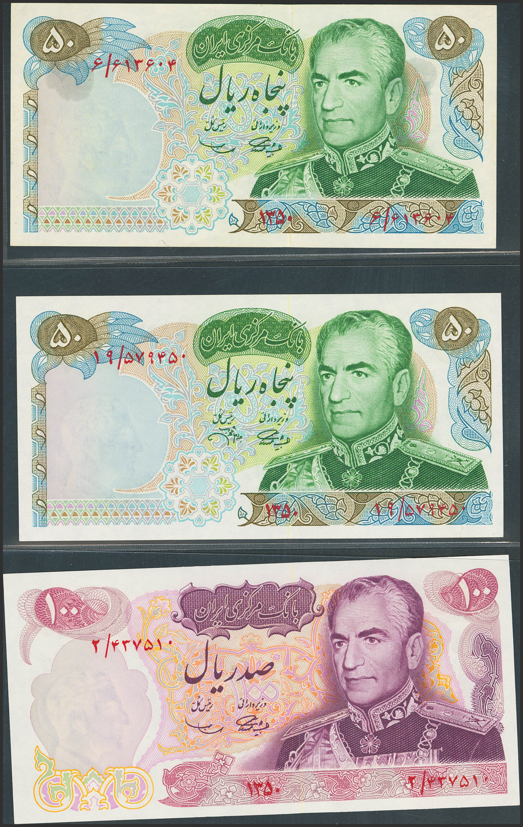 IRAN. Lot of 3 notes of 50 and 100 Rials. (1971ca). Bank Markazi Iran. 2500th Anniversary of the Persian Empire. All references with all subreferences. (Pick: 97a, 97b, 98). Uncirculated (2) and Extremely Fine, with pinholes (1).
