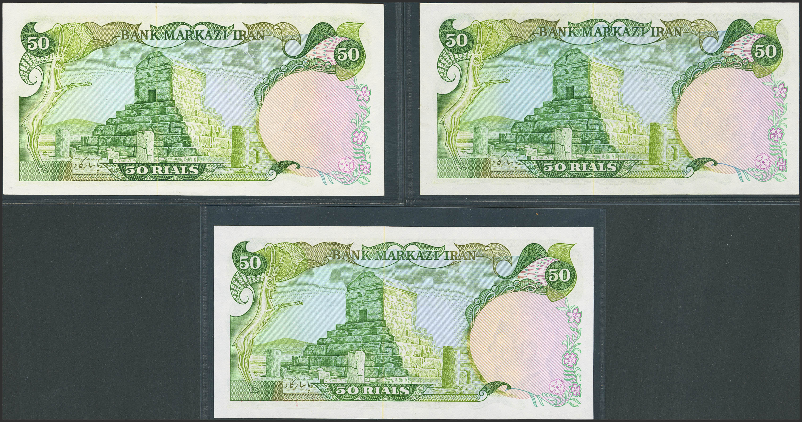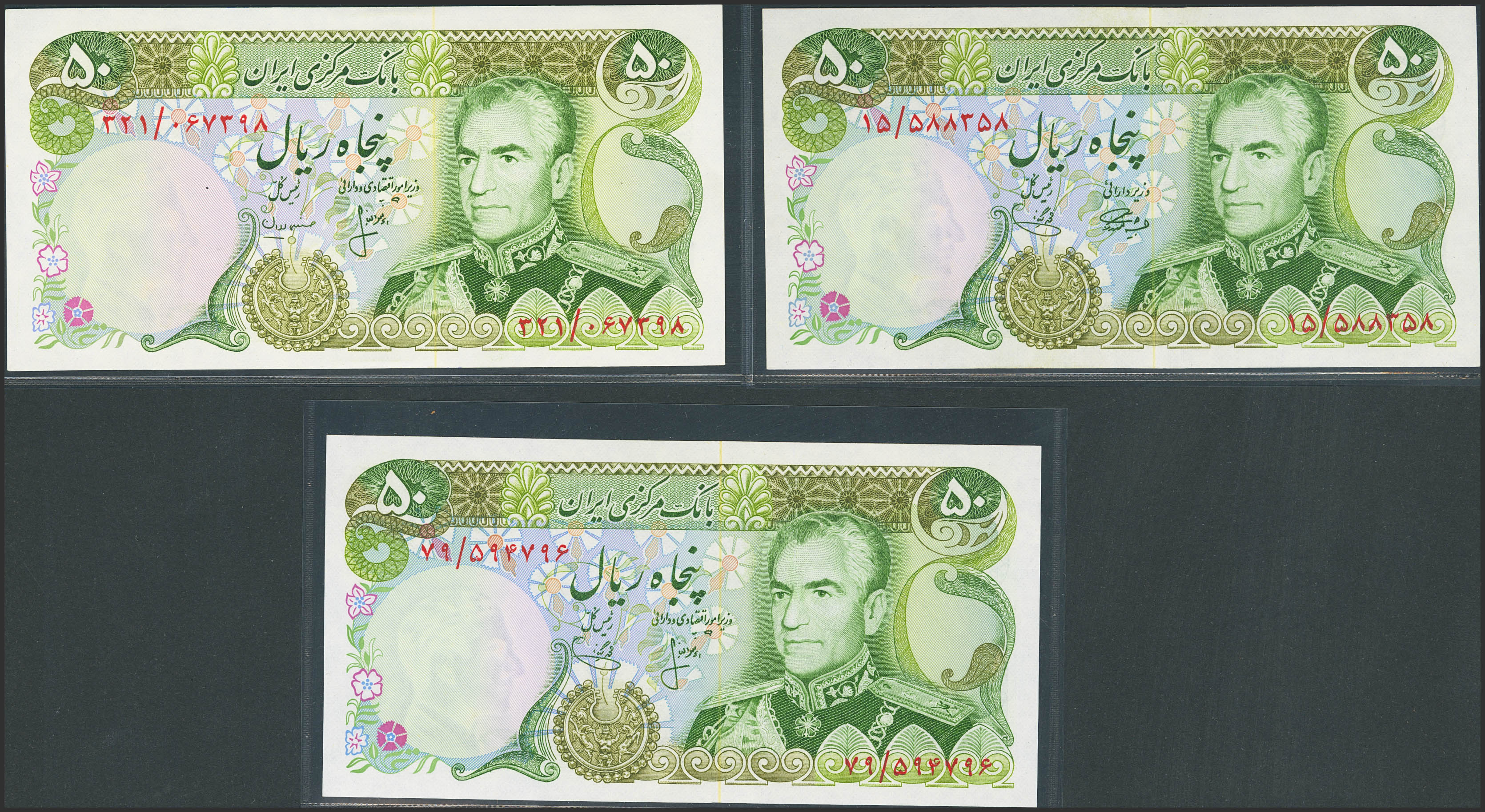 IRAN. Lot of 3 notes of 50 Rials. (1974ca). Bank Markazi Iran. (Pick: 101a, 101b, 101c). Uncirculated (2) and Almost Uncirculated (1).
