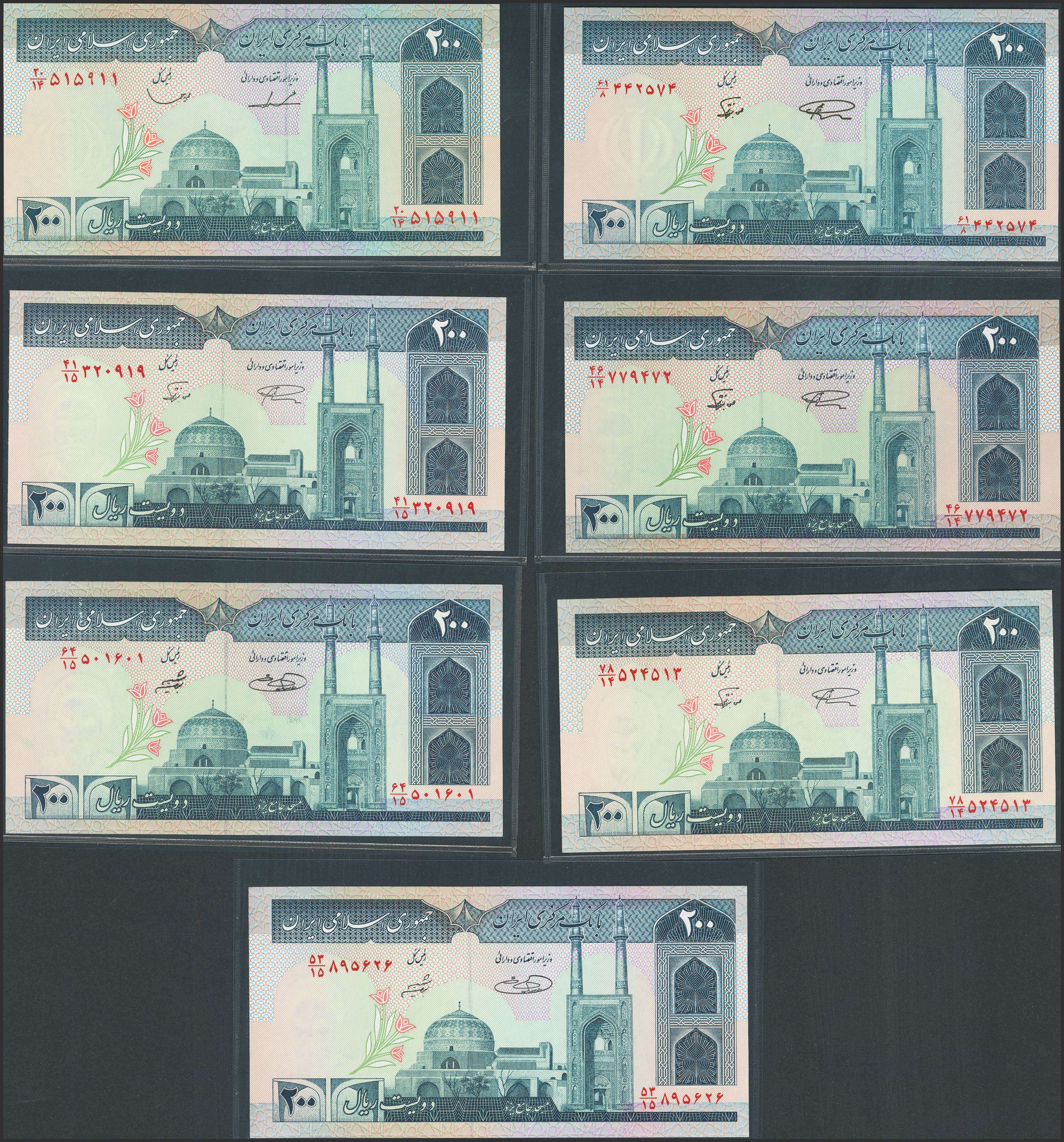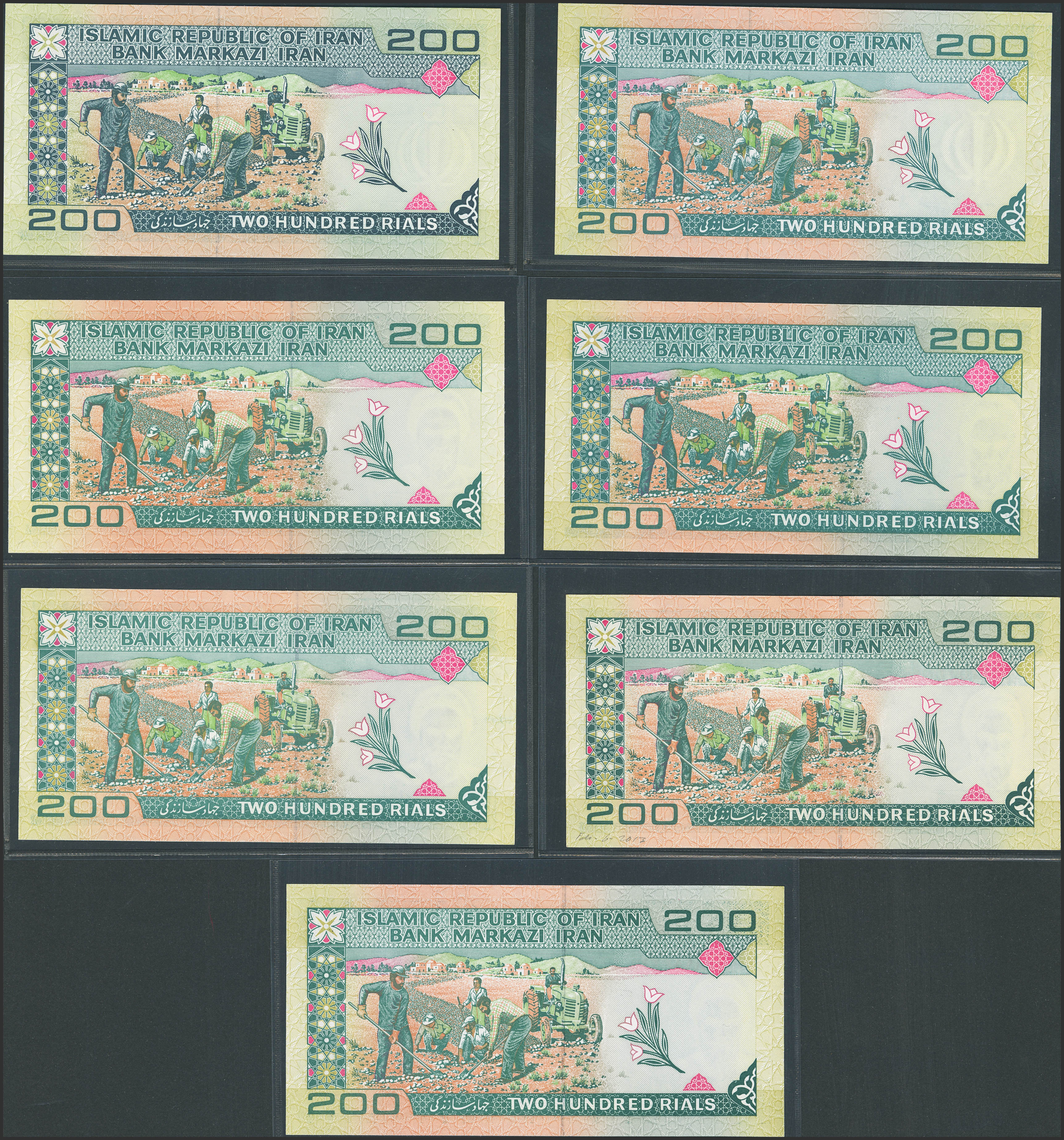 IRAN. Lot of 7 notes of 200 Rials. (1982ca). Bank Markazi Iran. (Pick: 136a, 136b, 136d(3), 136e(2)). Uncirculated.