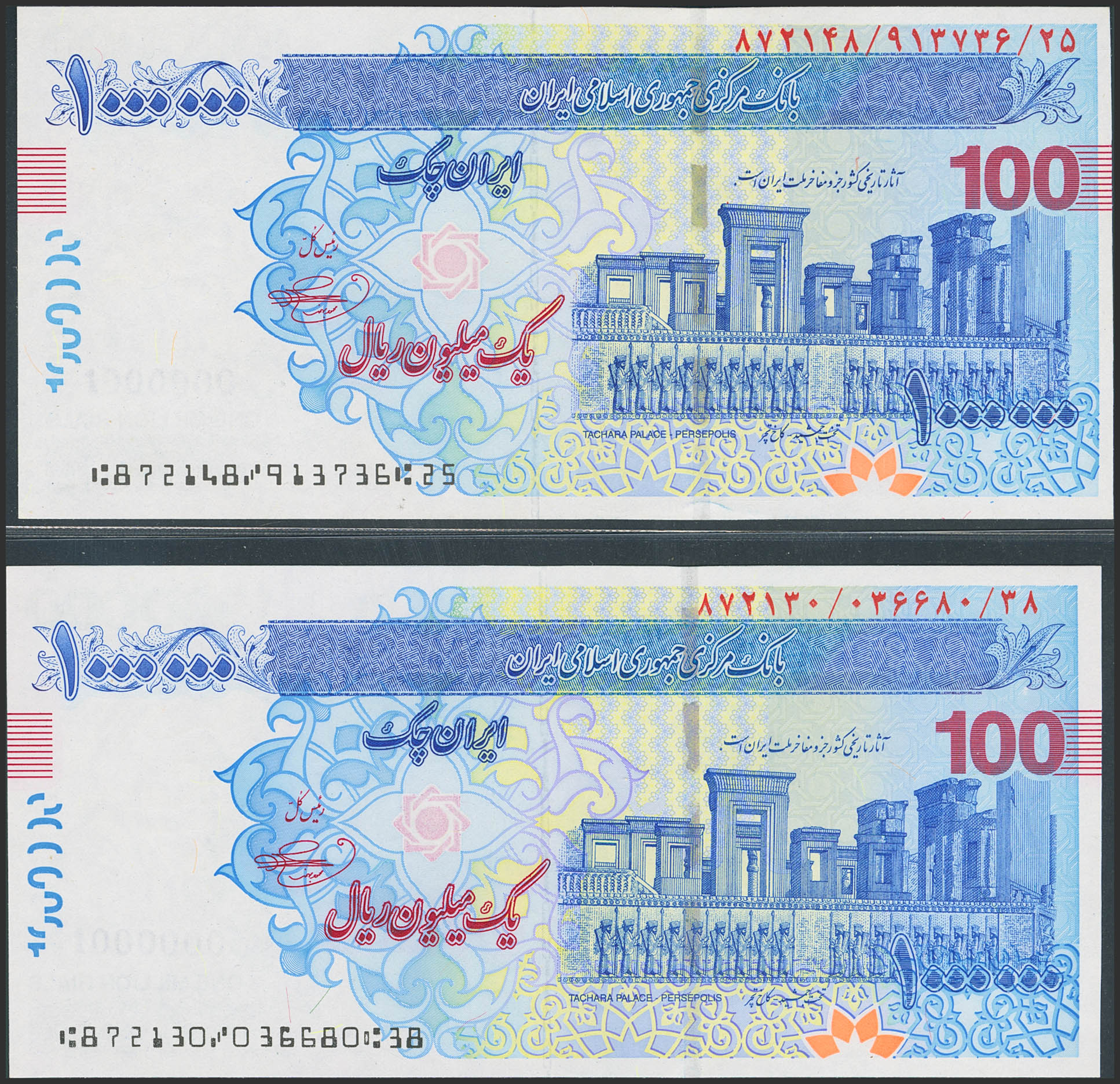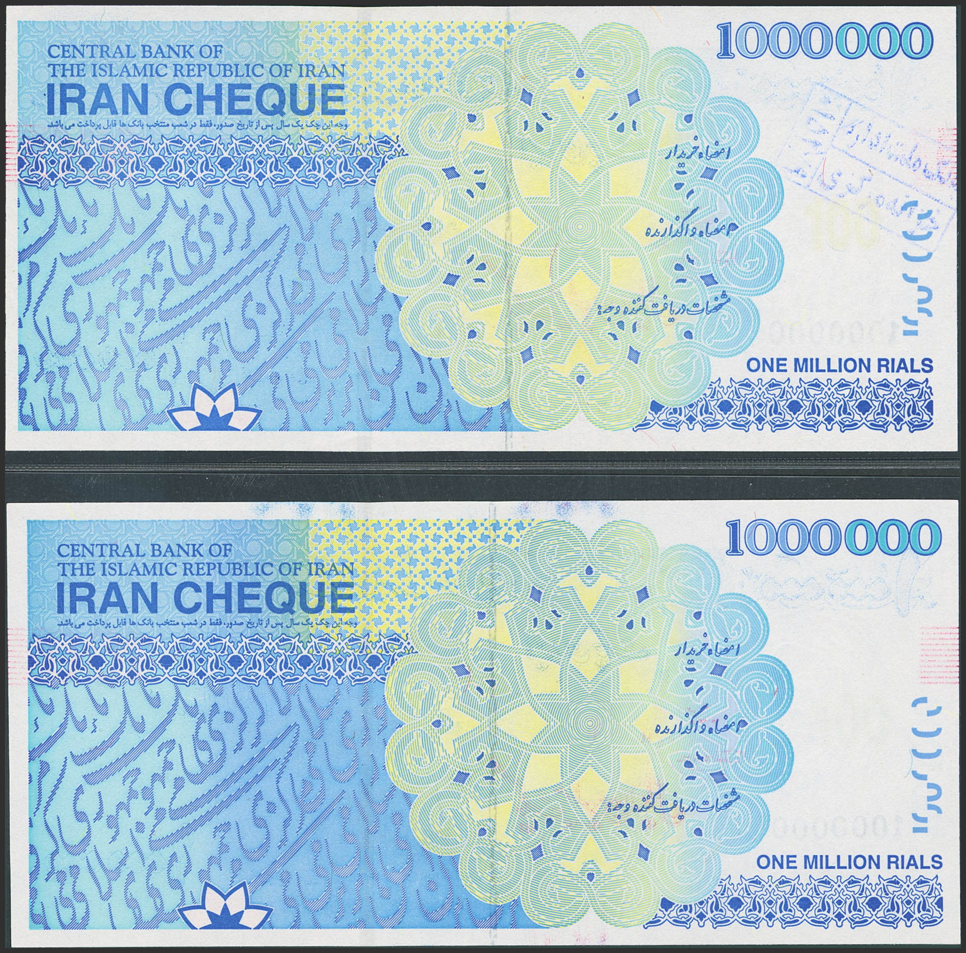 IRAN. Lot of 2 notes of 1000000 Rials. (2009ca). Central Bank of the Islamic Republic. Emergency Check due-absence of regular paper money with high denominations. (Pick: 154Ba). Uncirculated.