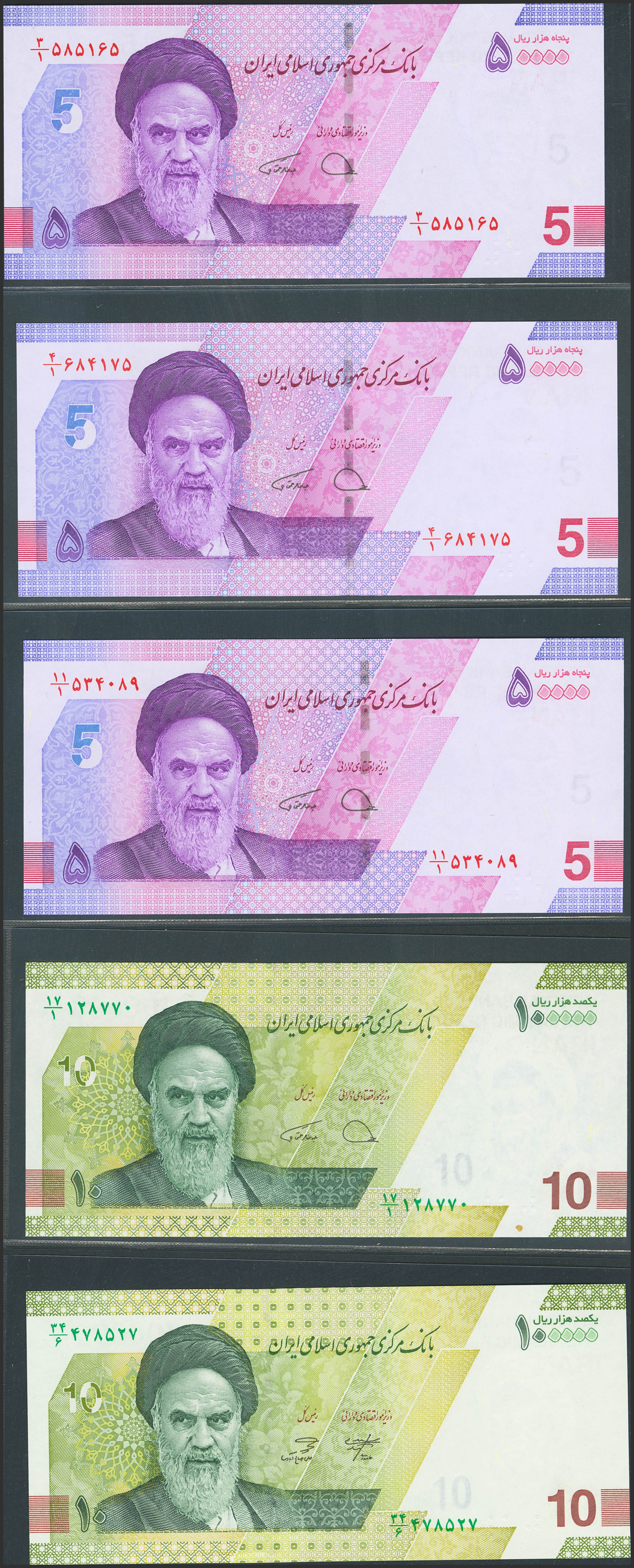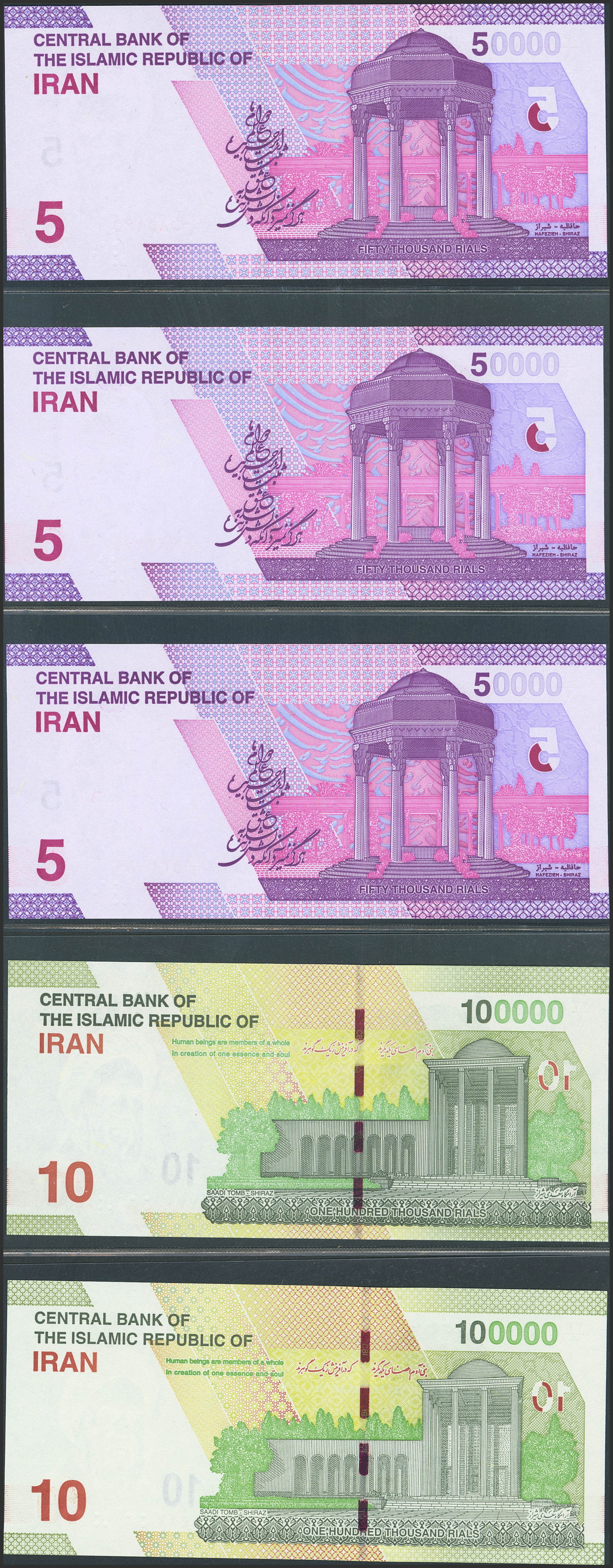 IRAN. Lot of 5 notes of 50000 and 100000 Rials. (2018ca). Central Bank of the Islamic Republic. (Pick: 162(3), 163(2)). Uncirculated.