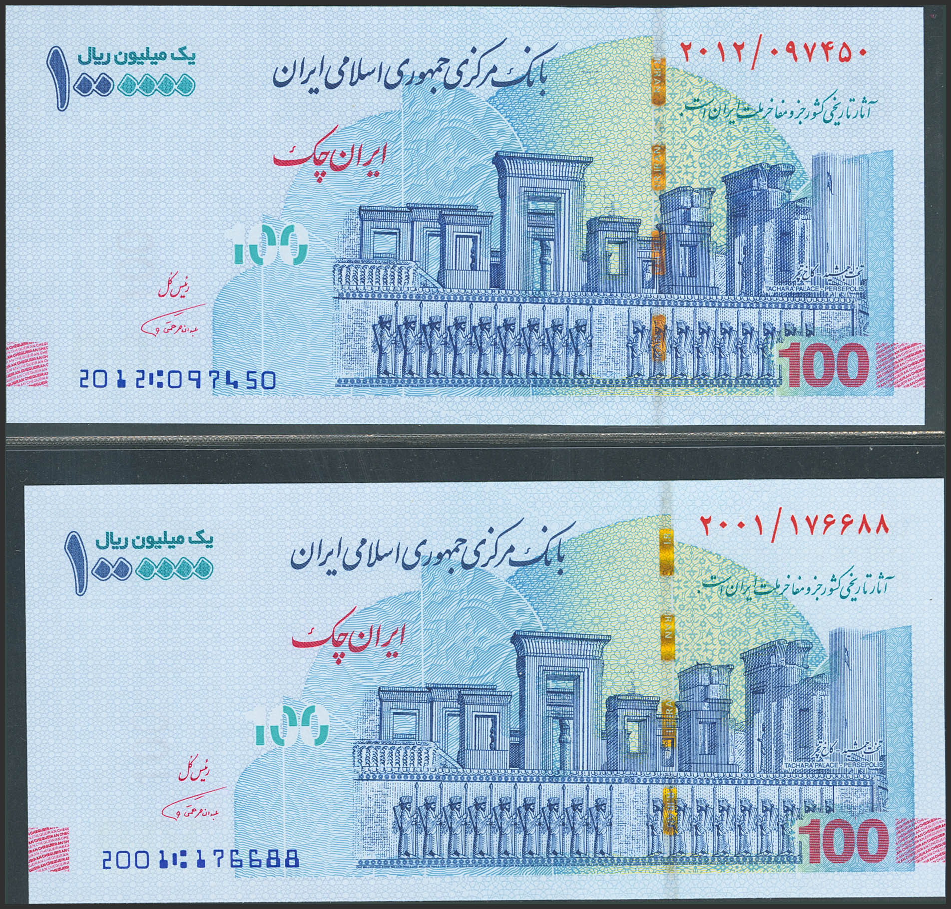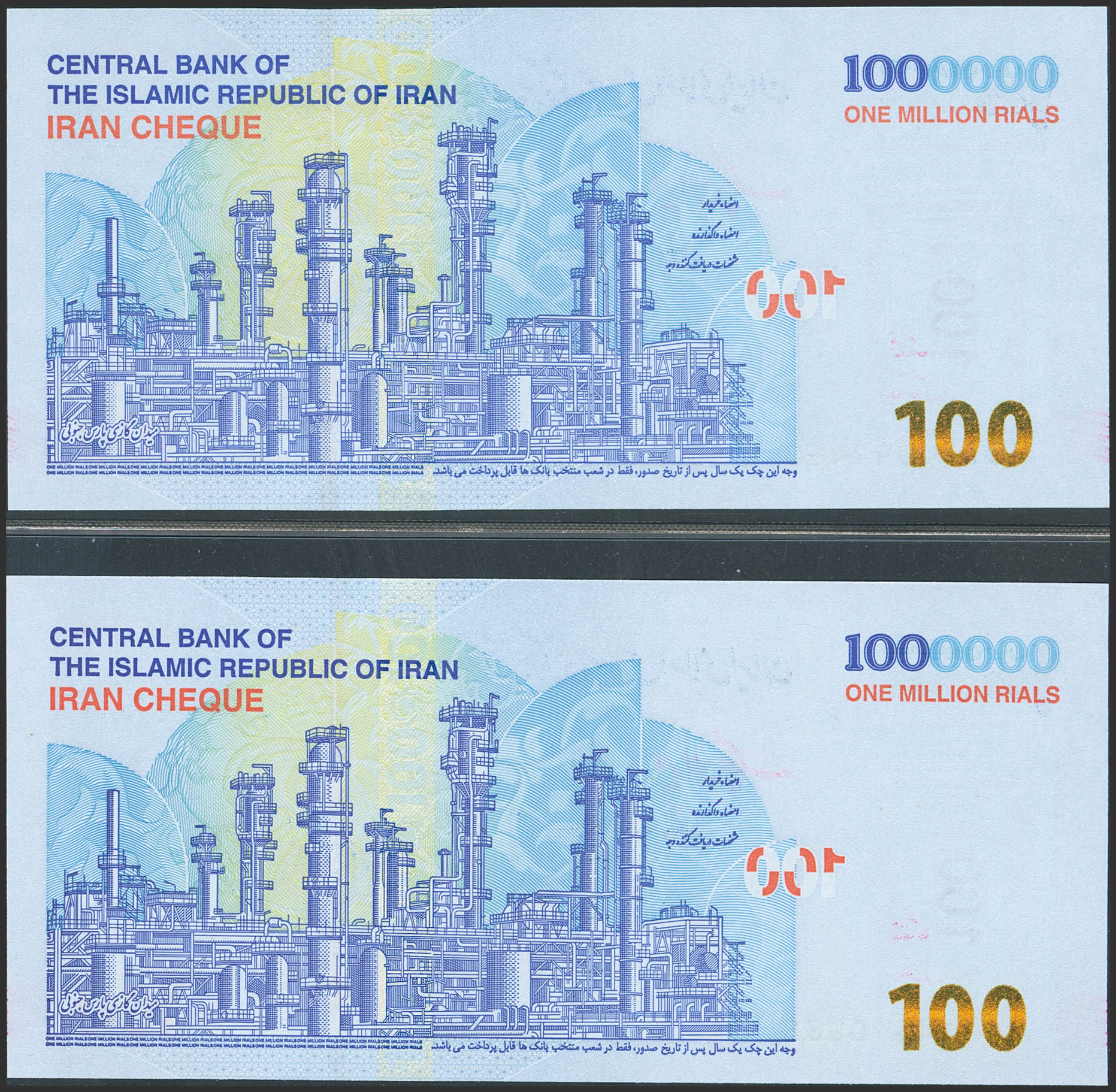 IRAN. Lot of 2 notes of 1000000 Rials. (2020Ca). Central Bank of the Islamic Republic. Emergency Check due-absence of regular paper money with high denominations. (Pick: 165). Uncirculated.