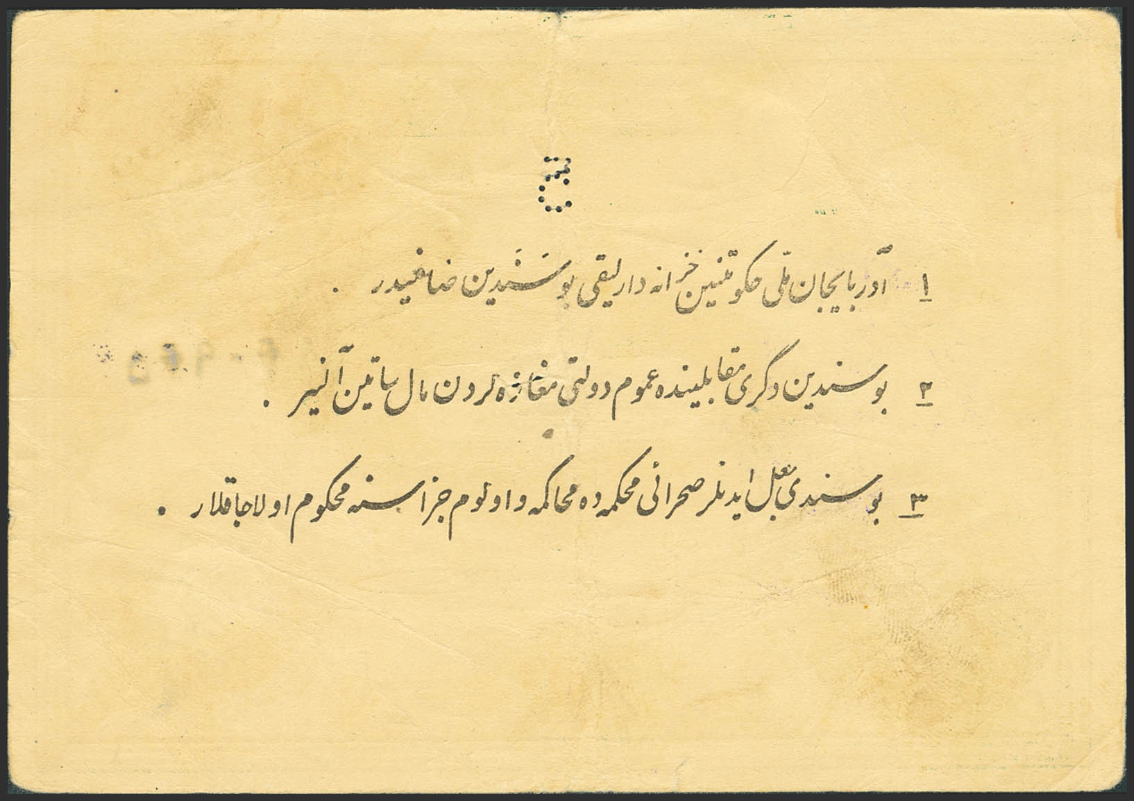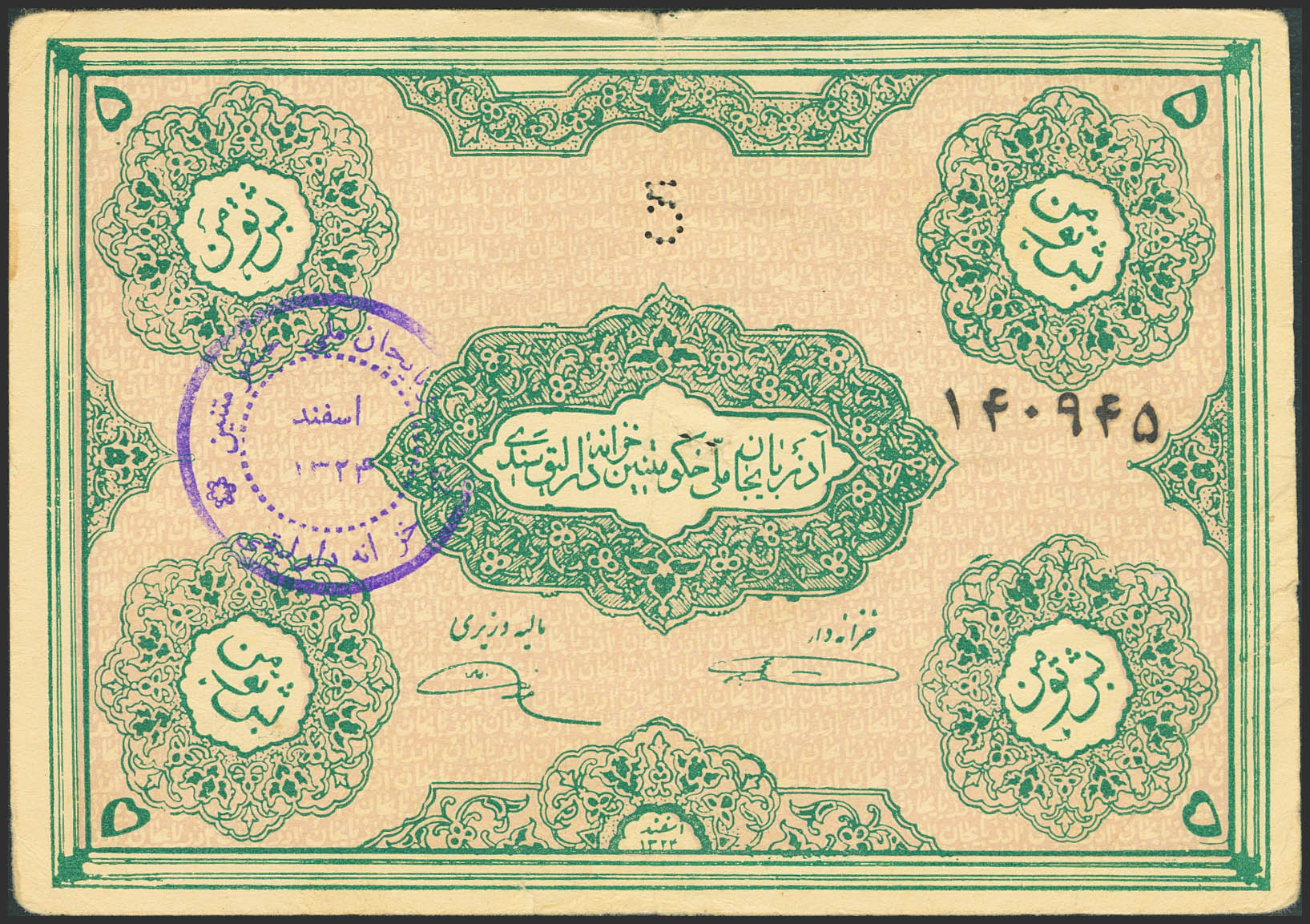 IRANIAN AZERBAIJAN. 5 Toman. 1946. Autonomous Government. (Pick: S104a). More than Very Fine, pinholes.