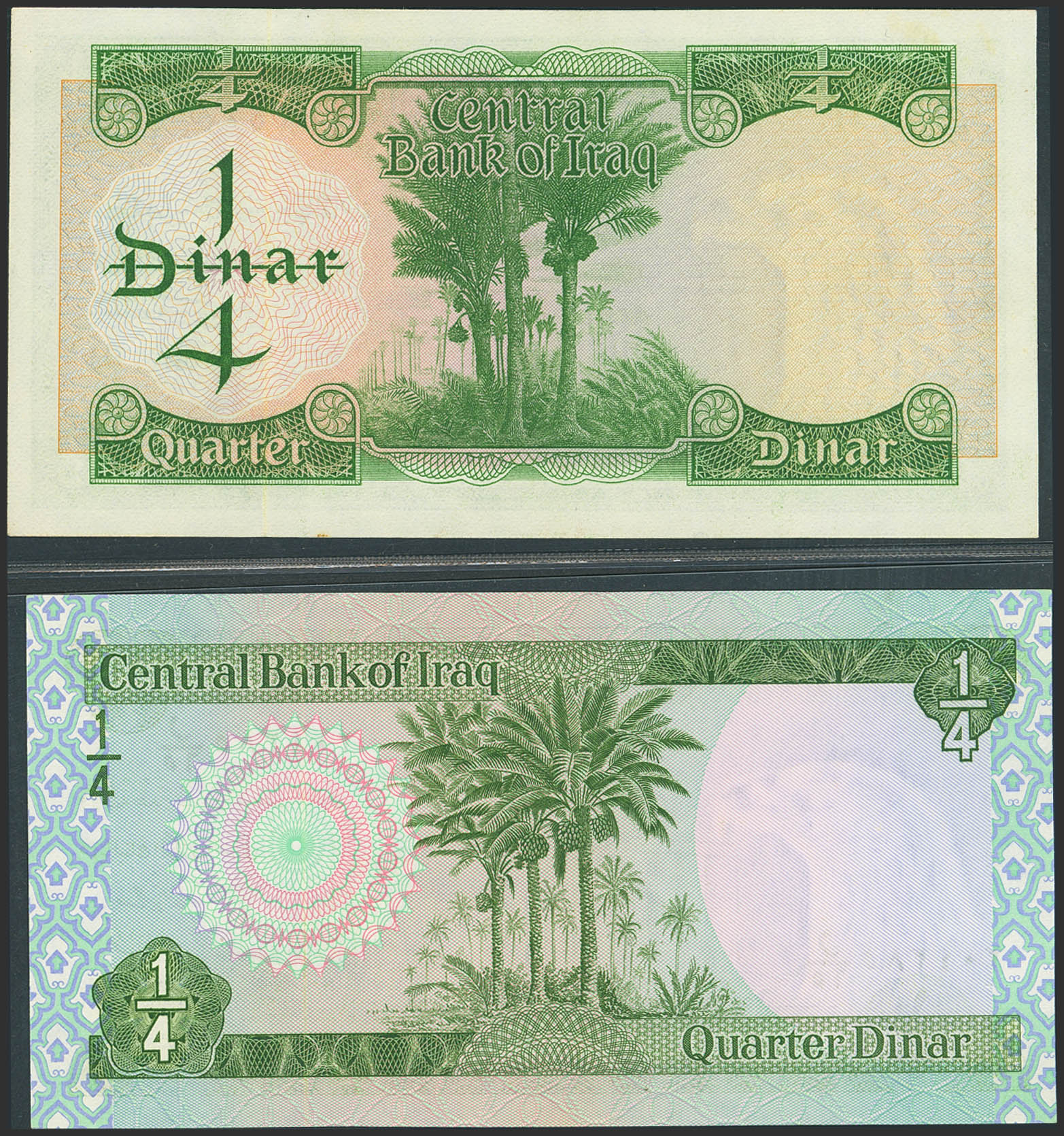 IRAQ. Lot of 2 notes of ¼ Dinar. (1969ca). Central Bank. (Pick: 56, 61). Almost Uncirculated and Uncirculated.