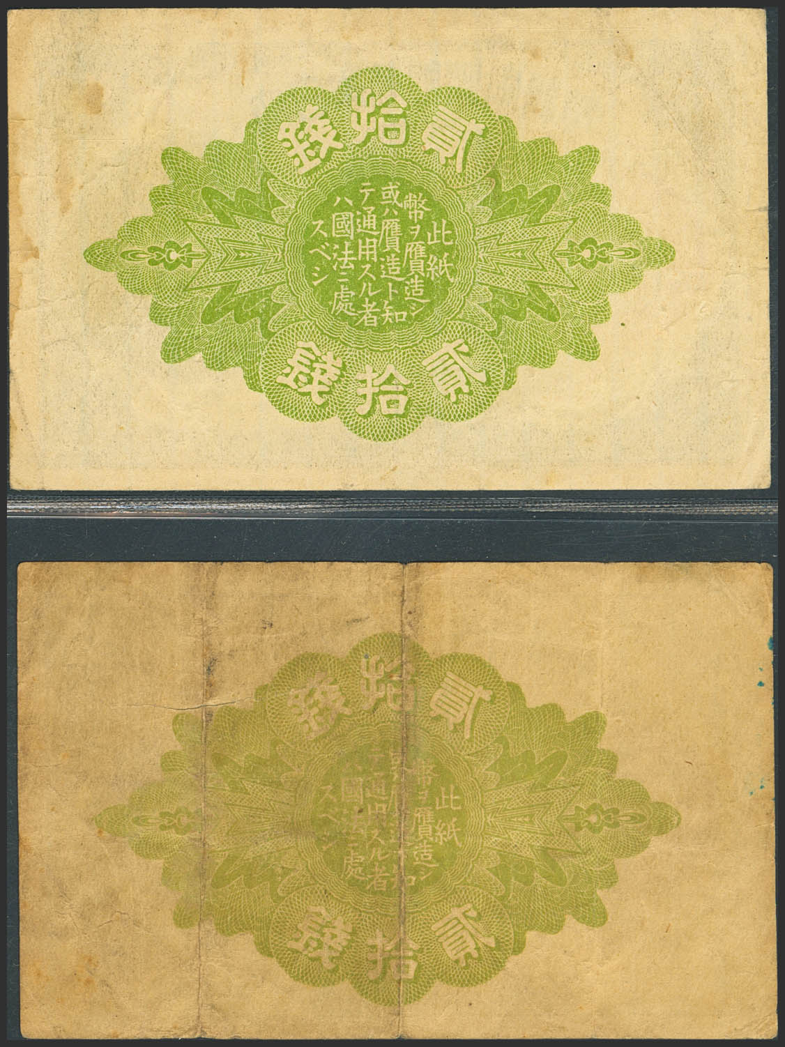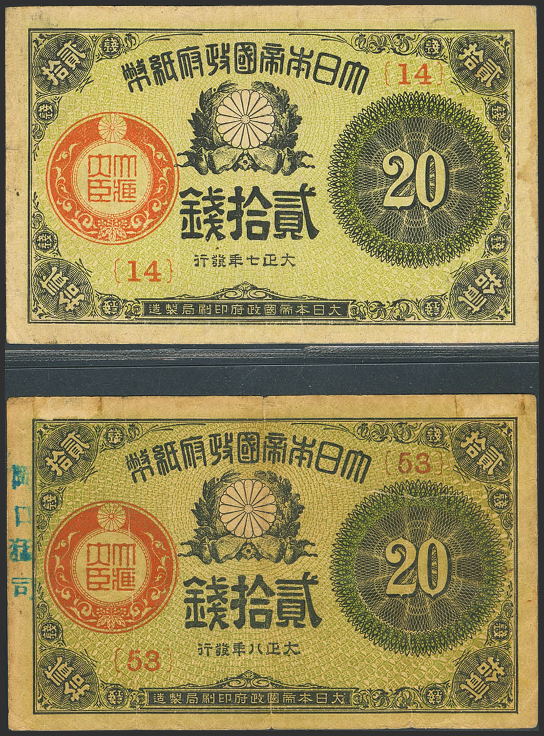 JAPAN. Lot of 2 notes of 20 Sen. 1918 and 1919. Great Imperial Japanese Government. (Pick: 47b). The 1919 note has a 2.5 cm tear in the center. Extremely Fine and Very Fine.