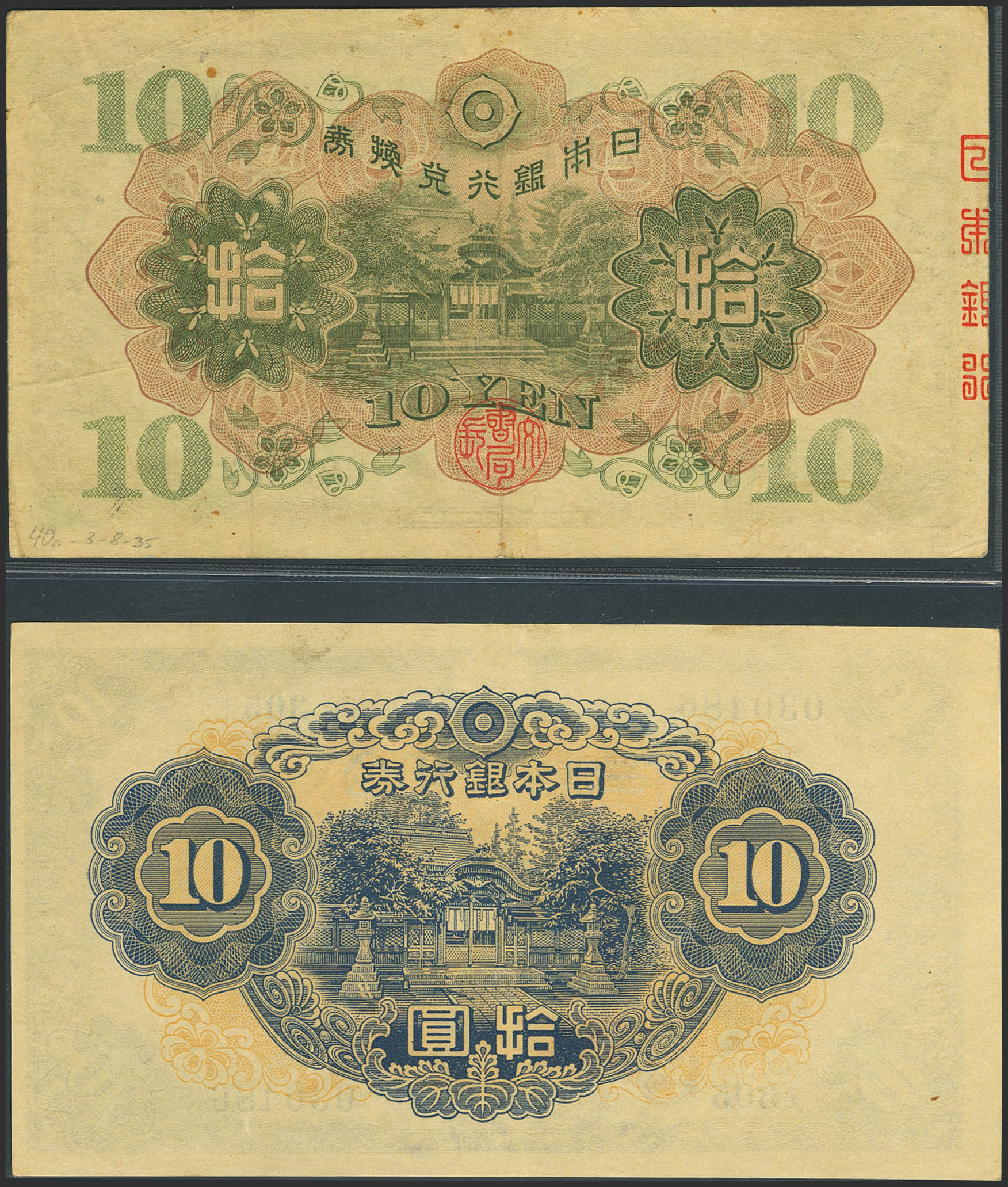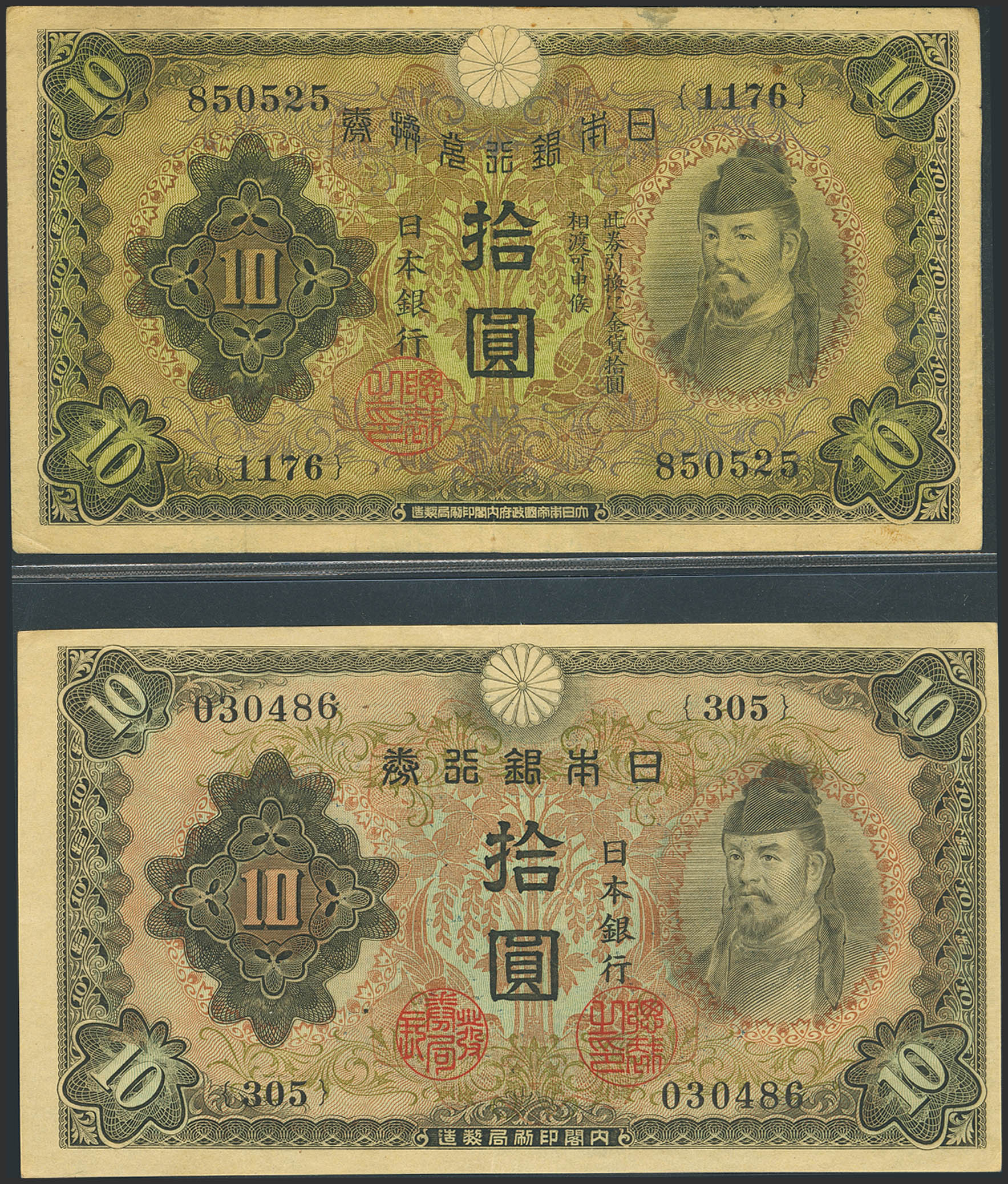 JAPAN. Lot of 2 notes of 10 Yen. (1930ca) and (1943ca). Bank of Japan. (Pick: 51a, 40a). More than Very Fine and More than Extra Fine.
