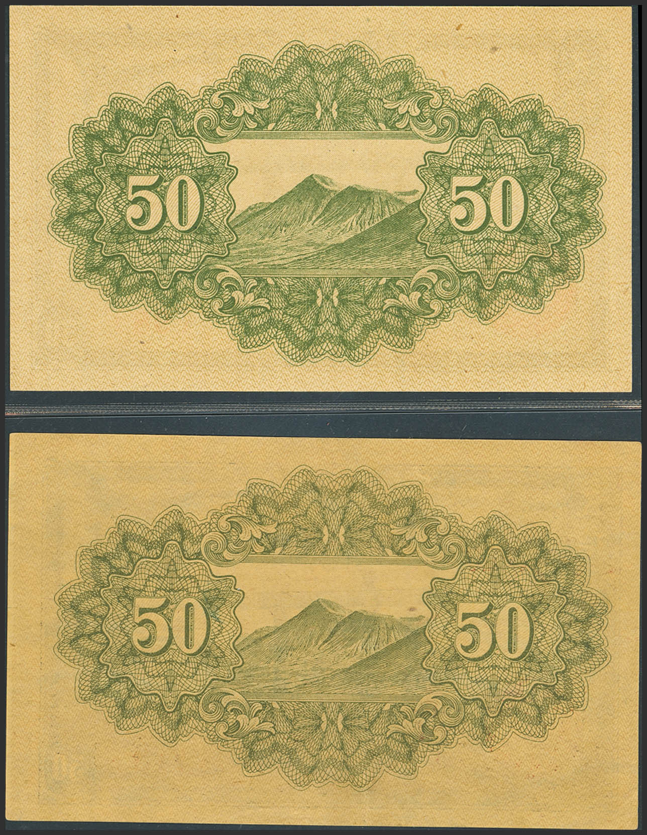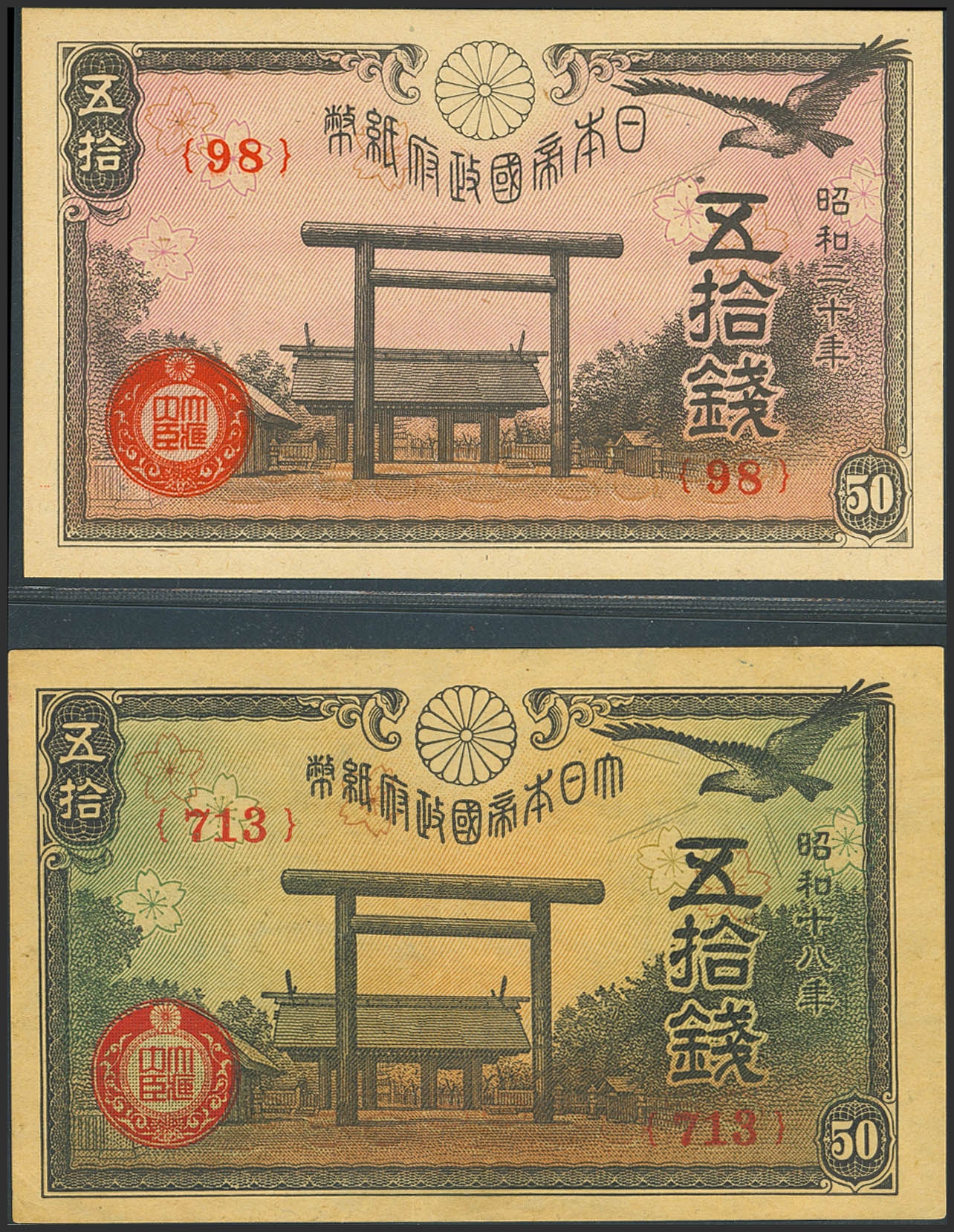 JAPAN. Lot of 2 notes of 50 Sen. 1943 and 1945. Great Imperial Japanese Government and Imperial Japanese Government. (Pick: 59b, 60a). Almost Uncirculated and Uncirculated.