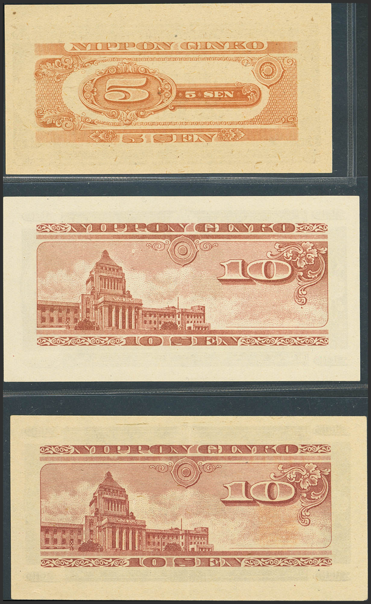 JAPAN. Lot of 2 notes of 5 and 10 Sen. (1947ca). Bank of Japan. (Pick: 83, 84). Almost Uncirculated.