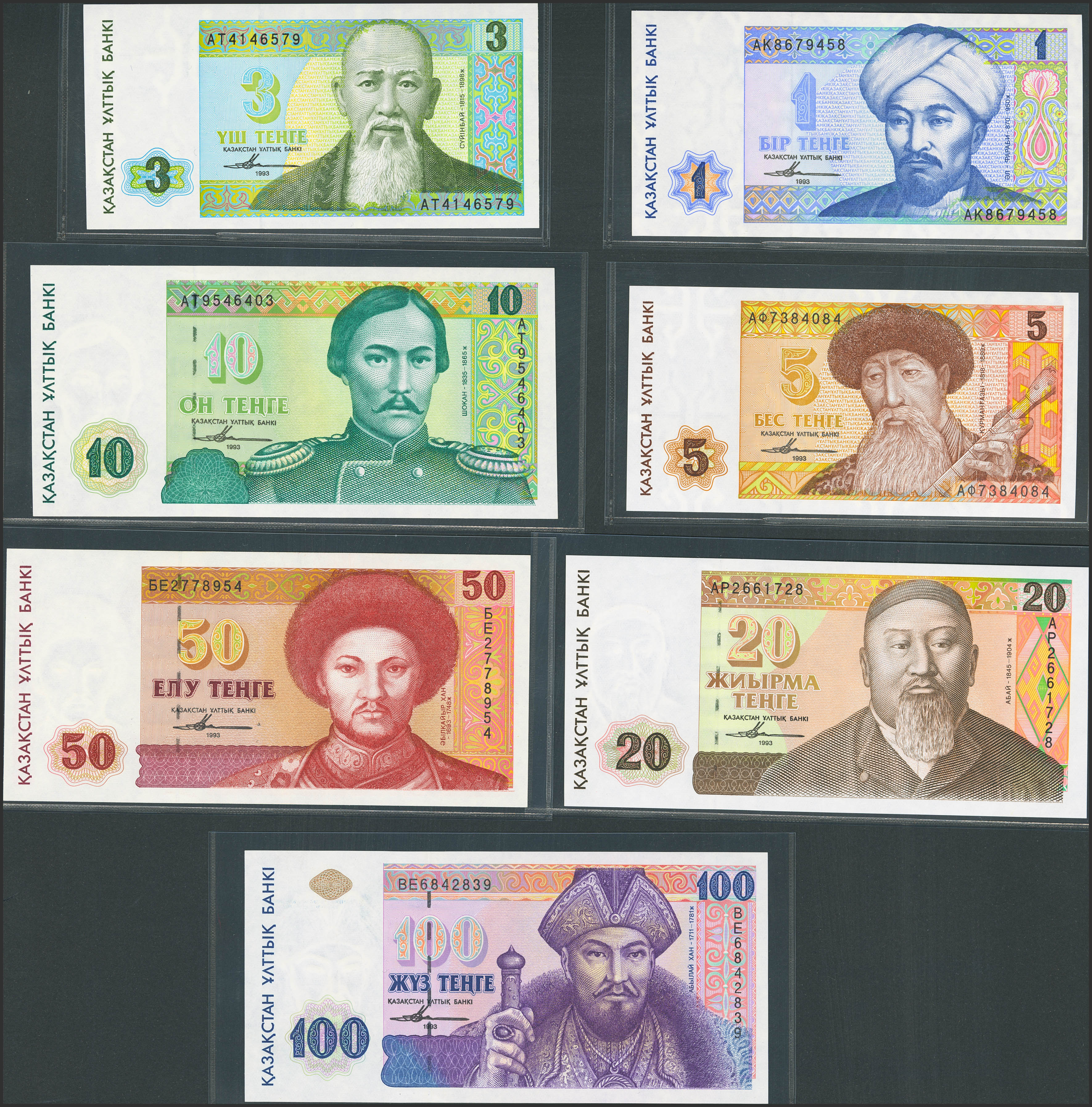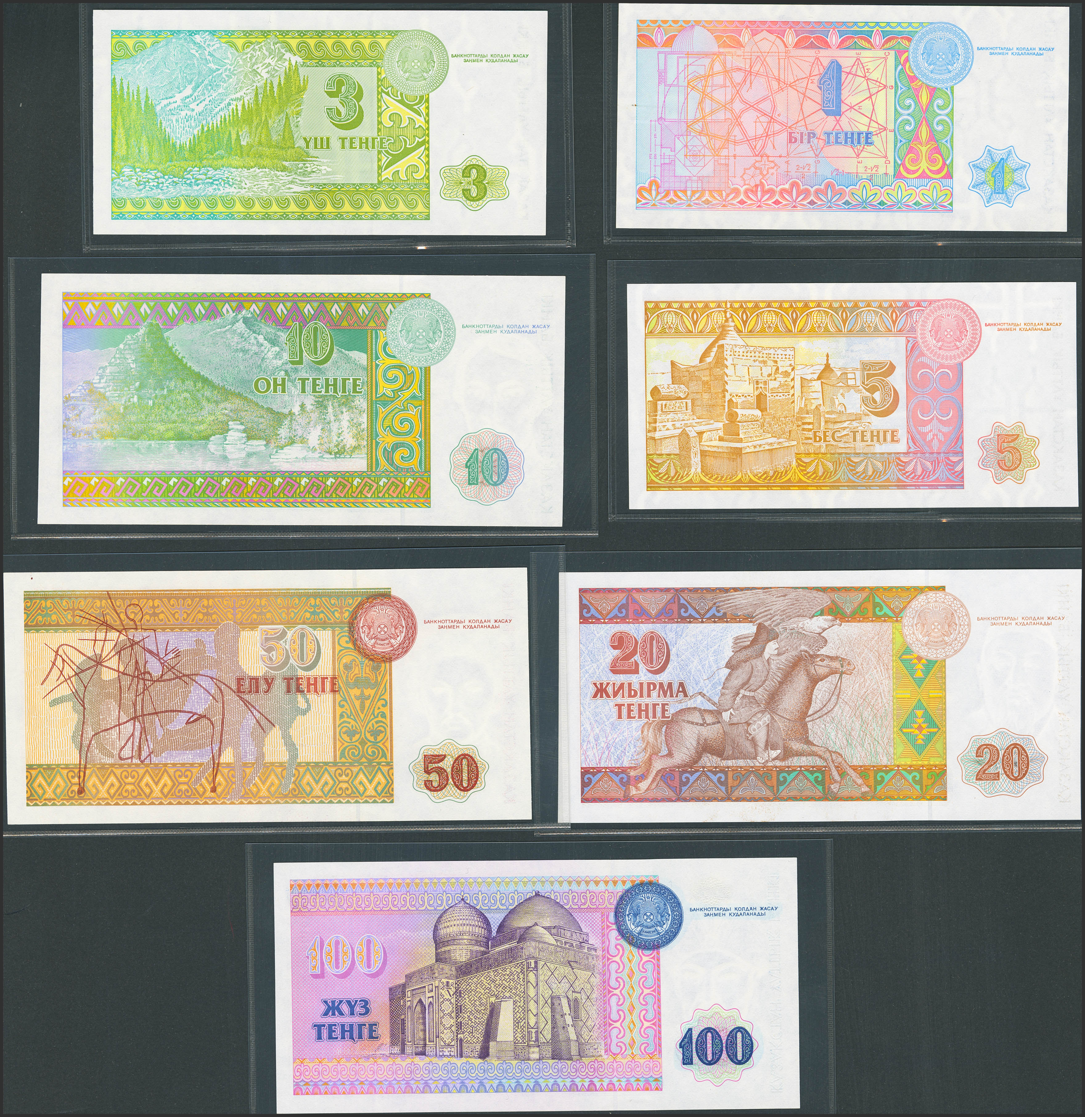 KAZAKHSTAN. Lot of 7 notes from 1 at 100 Tenge. 1993. National Bank. (Pick: 7, 8, 9, 10, 11, 12, 13b). Uncirculated.