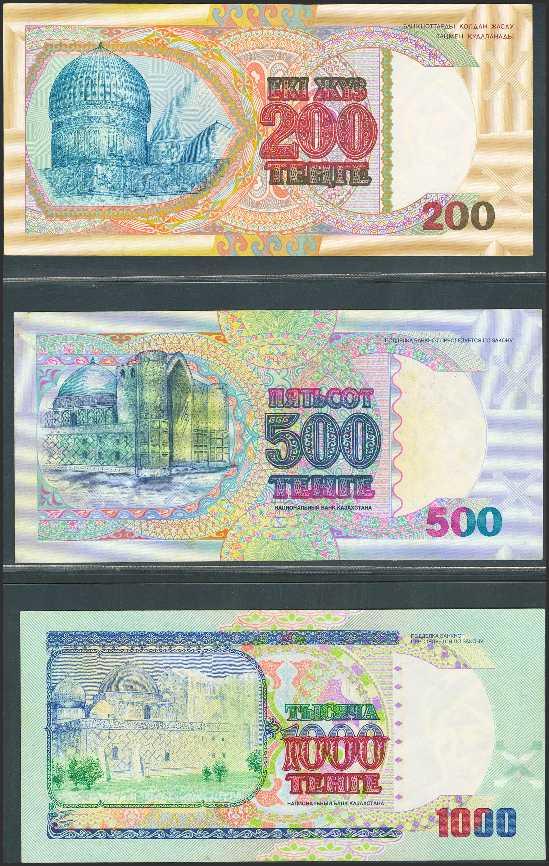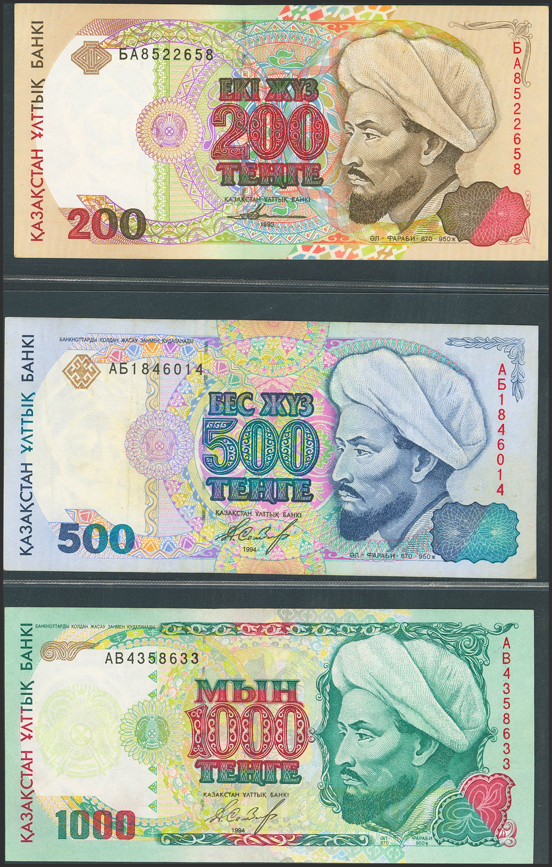 KAZAKHSTAN. Lot of 3 notes from 200 at 1000 Tenge. 1993 and 1994. National Bank. (Pick: 14a, 15, 16a). Almost Uncirculated (14a and 16a), Extremely Fine (15a).