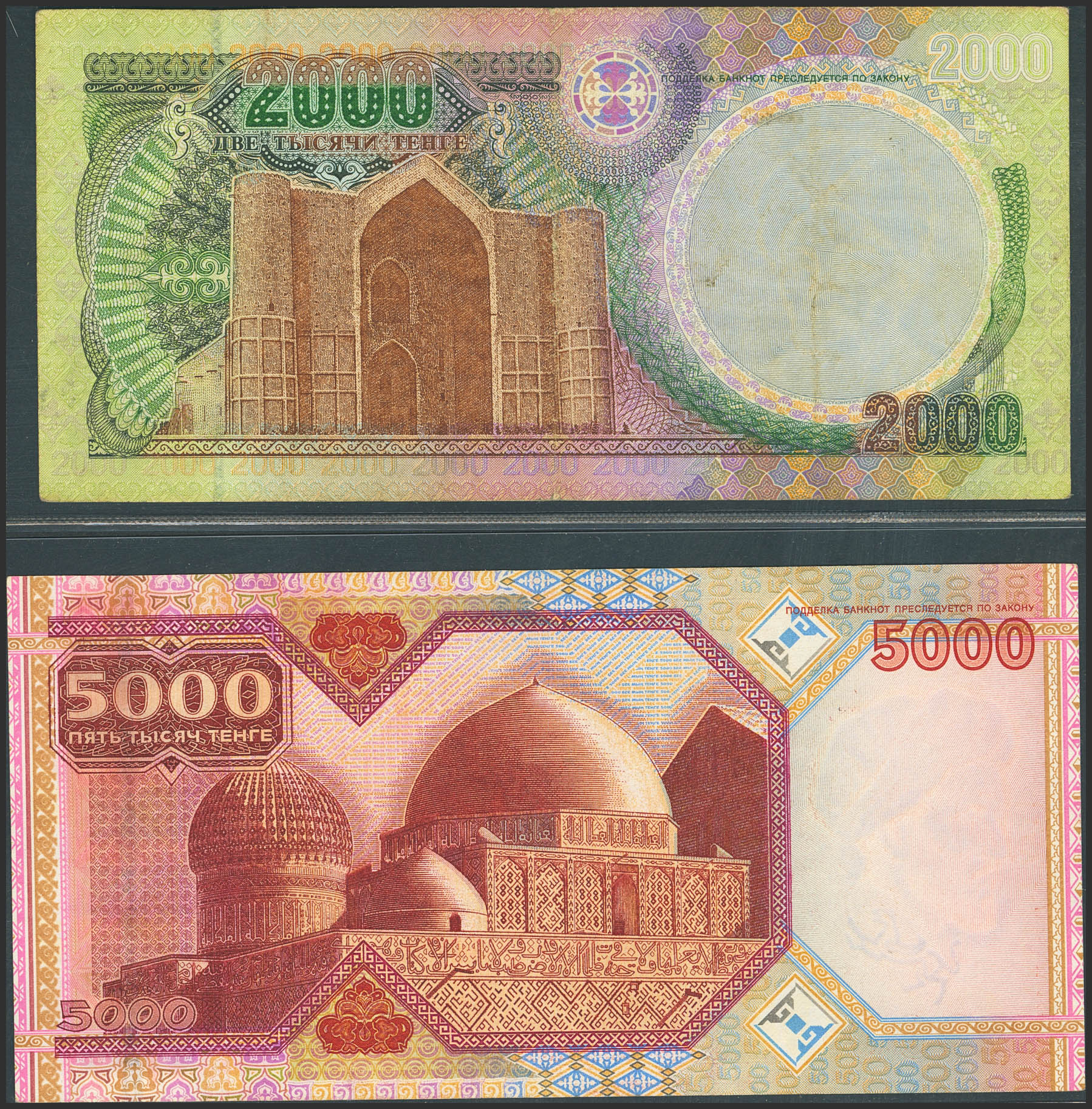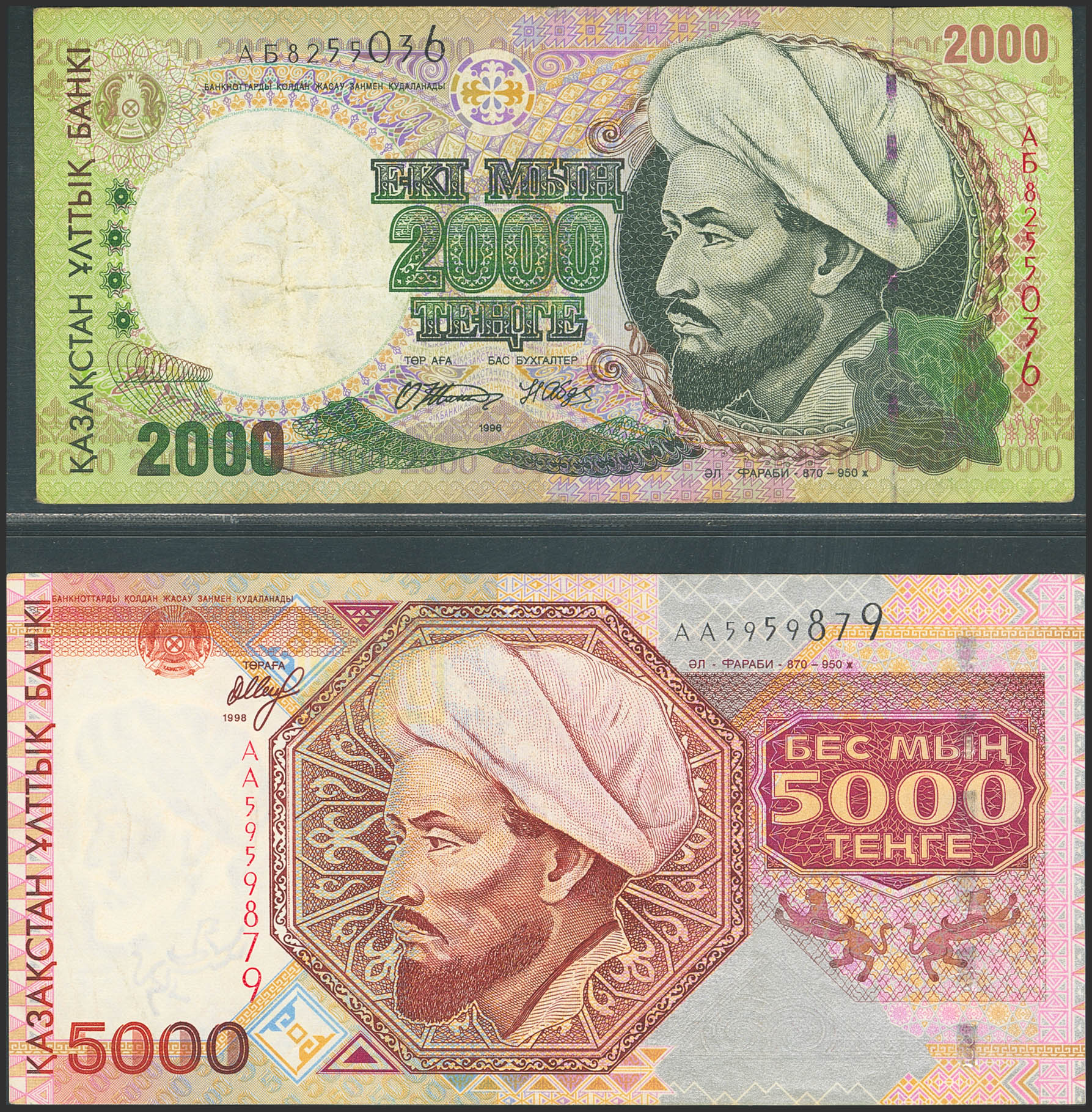 KAZAKHSTAN. Lot of 2 notes of 2000 and 5000 Tenge. 1996 and 1998. National Bank. (Pick: 17, 18). Very Fine and Almost Uncirculated.