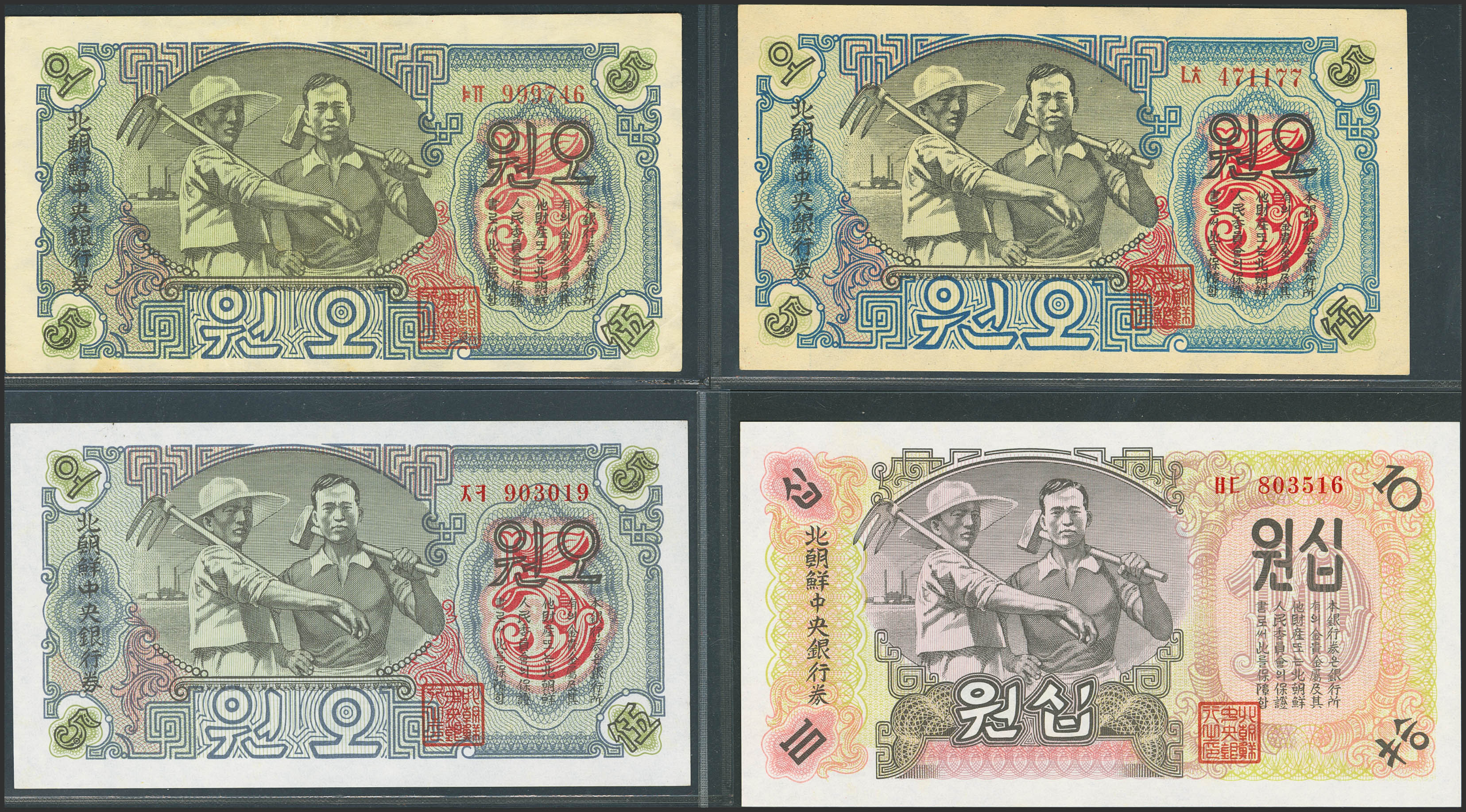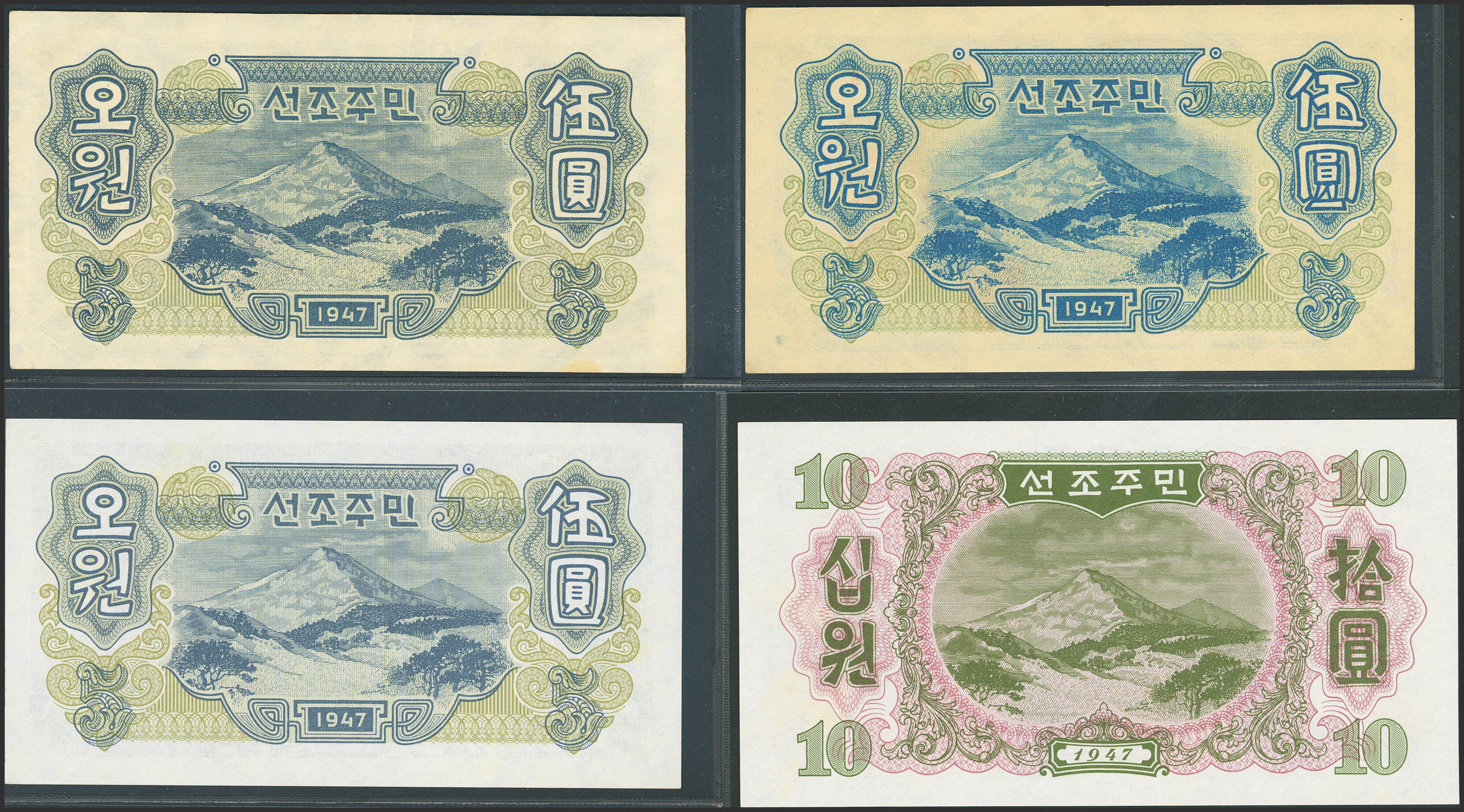 KOREA NORTH. Lot of 4 notes of 5 and 10 Won. 1947. Central Bank. Three with watermark and one without it. (Pick: 9, 10a, 10b, 10Ab). About Uncirculated (P9), More than Extremely Fine (10a) and Uncirculated (P10b and P10Ab).