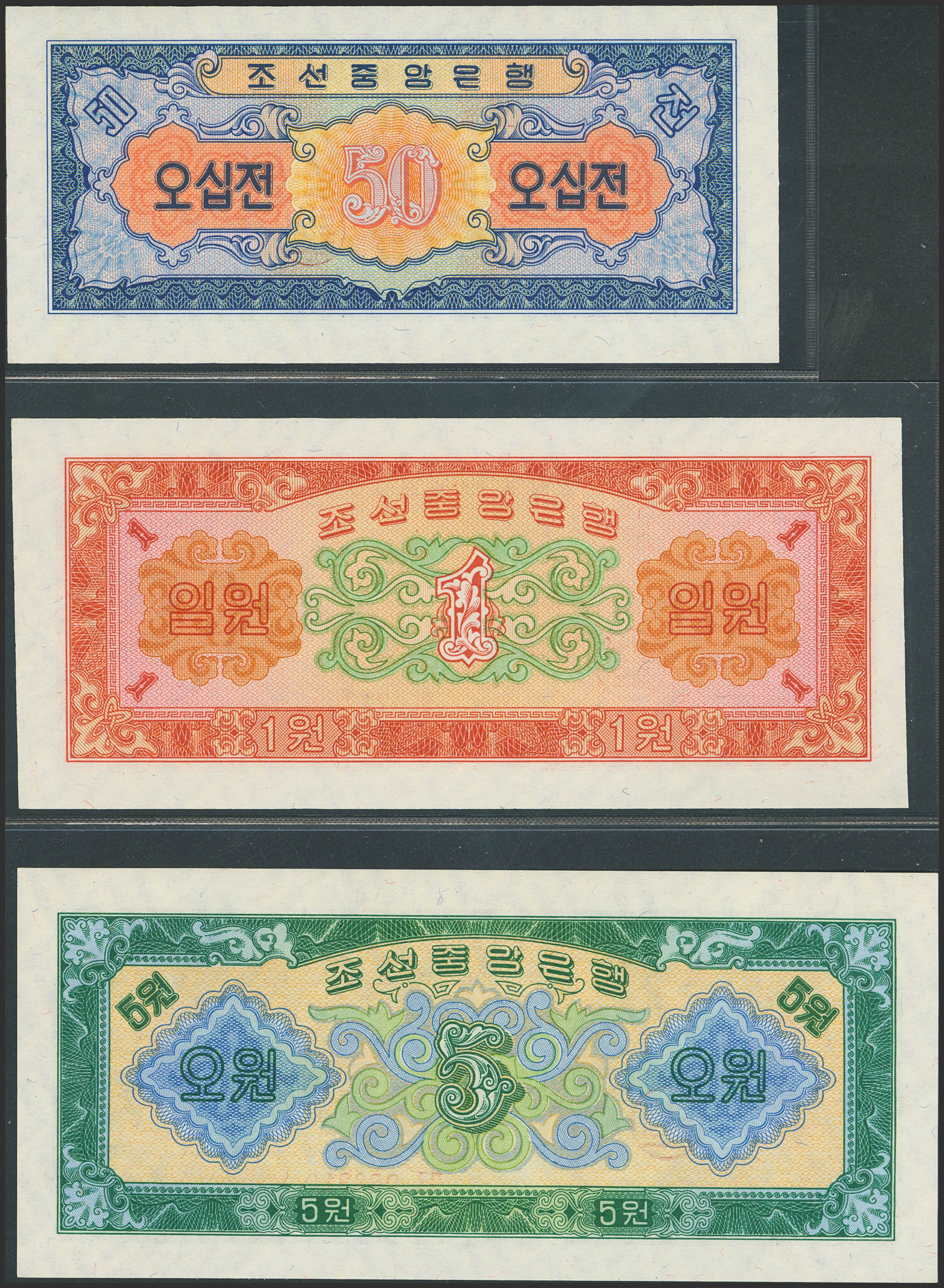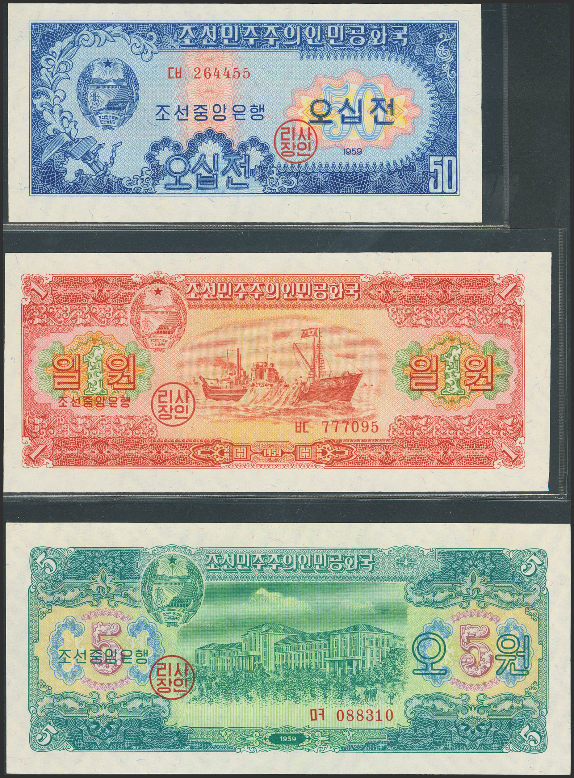 KOREA NORTH. Lot of 3 notes of 50 Chon and 1 and 5 Won. 1959. Central Bank of the Democratic Peoples Republic. (Pick: 12, 13, 14). Uncirculated.