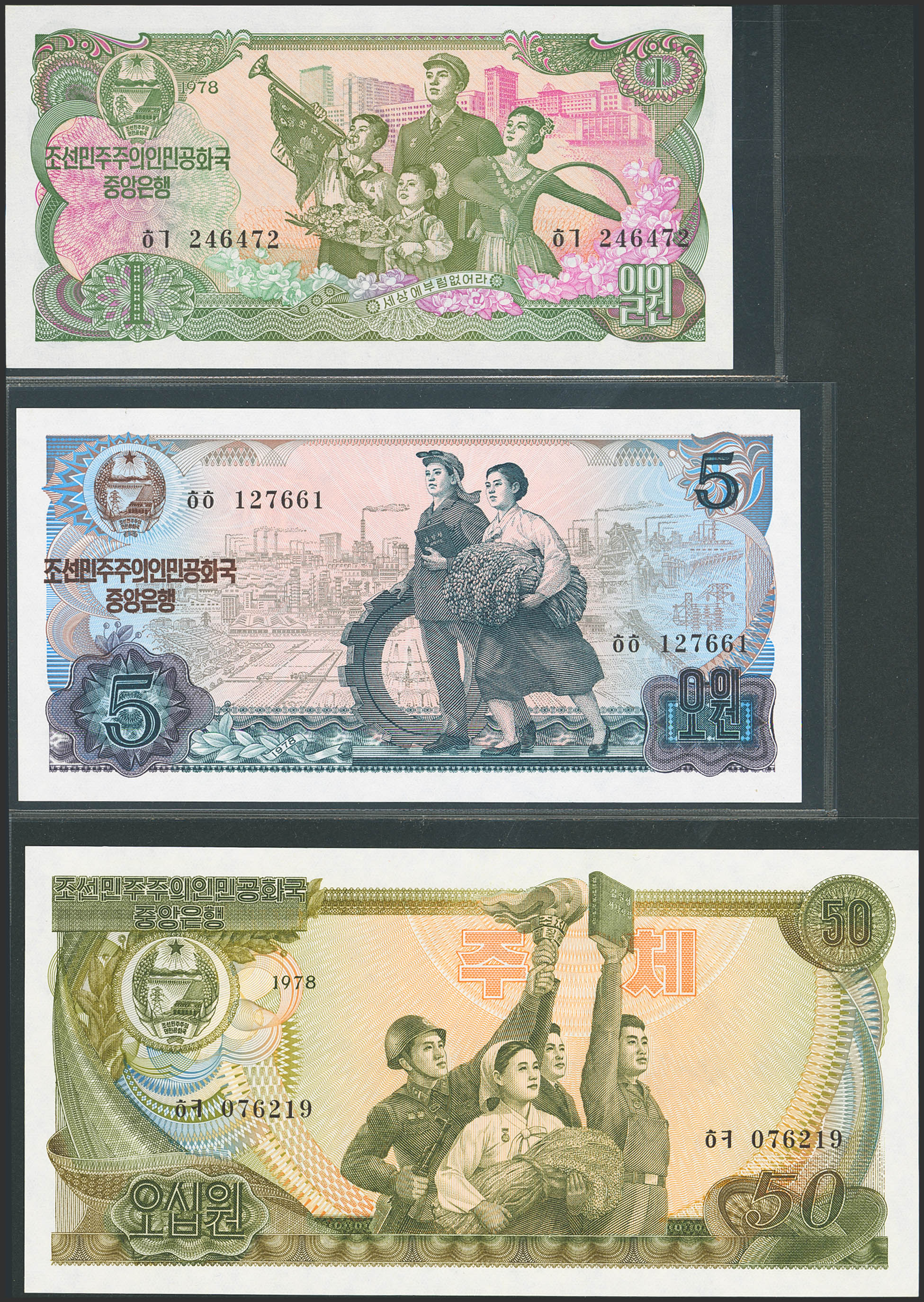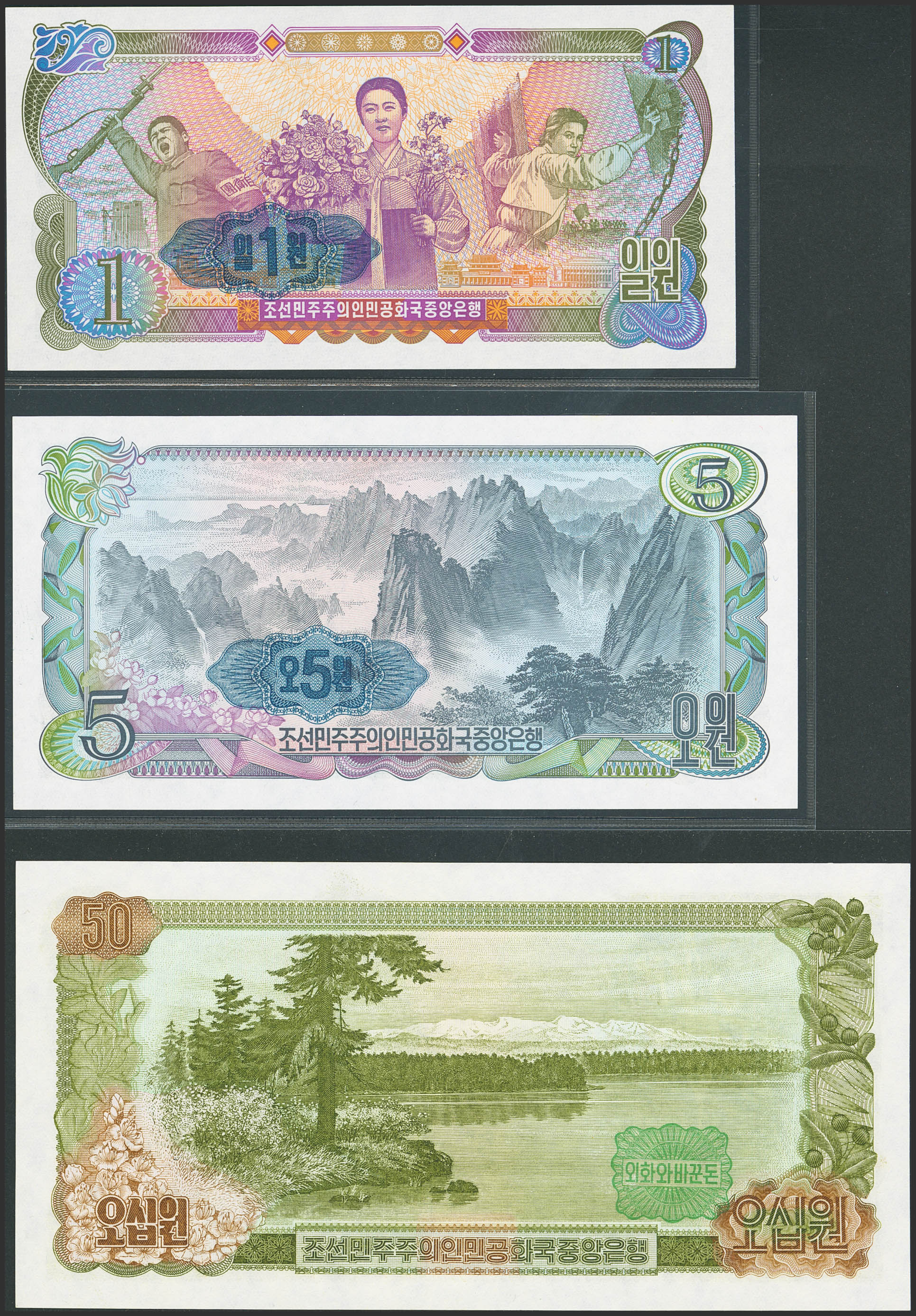 KOREA NORTH. Lot of 3 notes of 1, 5 and 50 Won. 1978. Central Bank of the Democratic Peoples Republic. (Pick: 18d, 19e, 21b). Uncirculated.