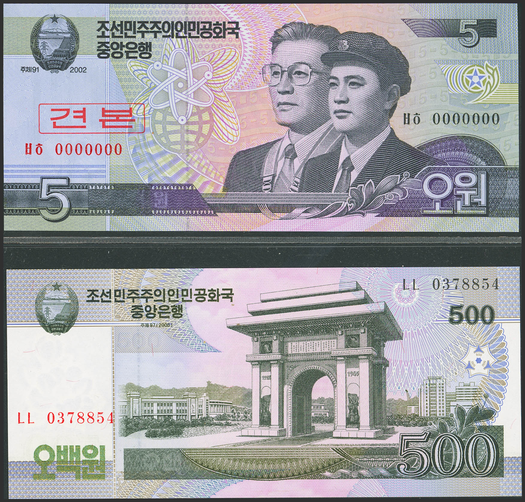 KOREA NORTH. Lot of 2 notes of 5 and 500 Won. (2009ca). Central Bank of the Democratic Peoples Republic. (Pick: 58s, 63). Uncirculated.