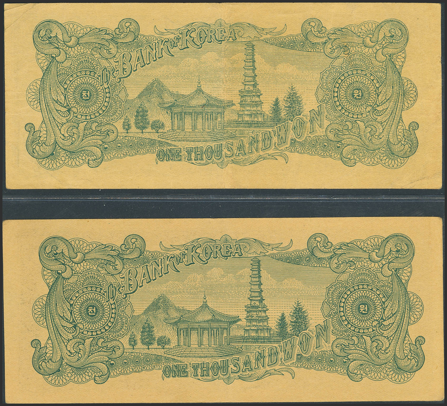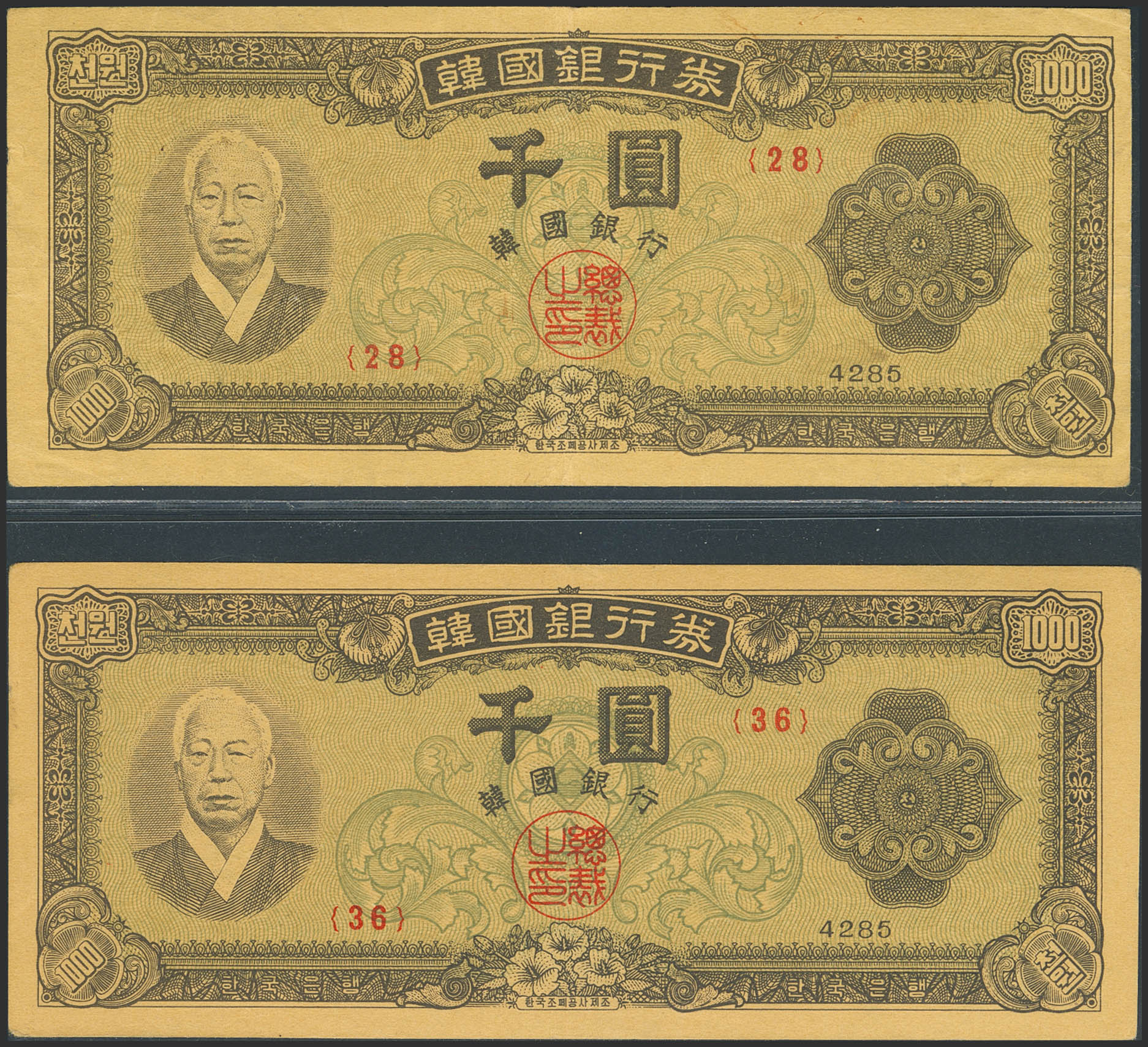 KOREA SOUTH. Lot of 2 notes of 1000 Won. 1952. Bank of Korea. (Pick: 10a). Almost Uncirculated and Extra Fine.