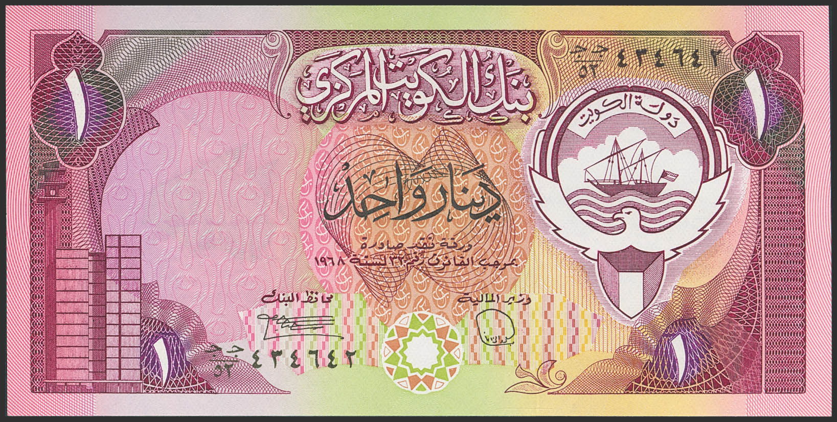 KUWAIT. 1 Dinar. 1968. Central Bank. This prefix was stolen by the Iraqi forces during the invasion in 1990. (Pick: 13d). Uncirculated.
