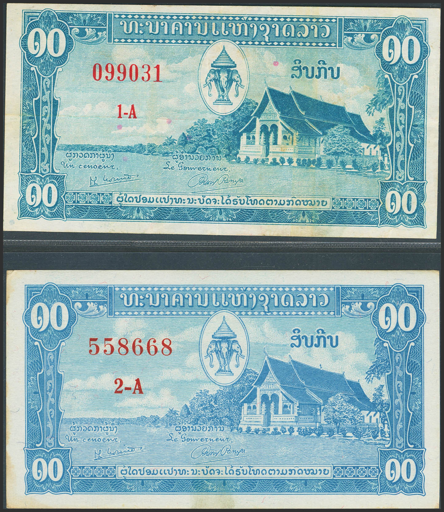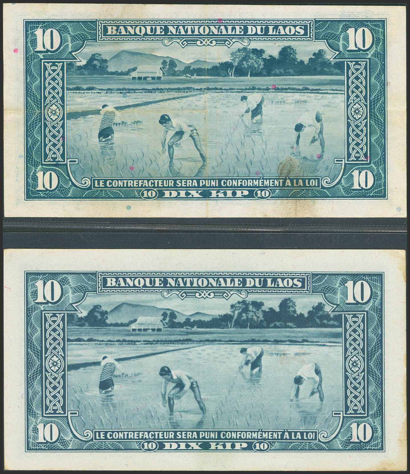 LAOS. Lot of 2 notes of 10 Kip. (1957ca). Banque Nationale. With and without planchettes. (Pick: 3a, 3b). More than Very Fine and Less than Uncirculated, stains.