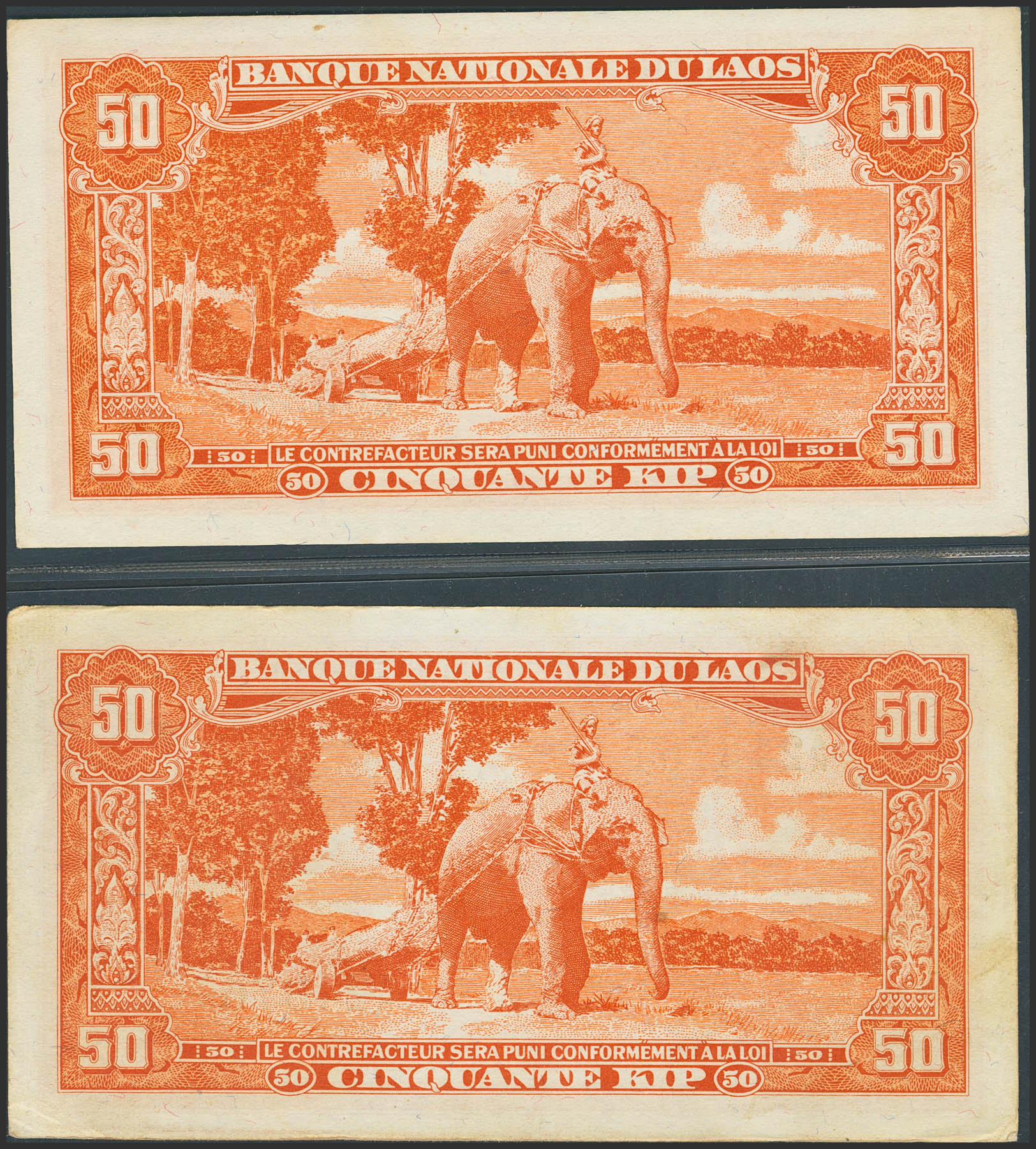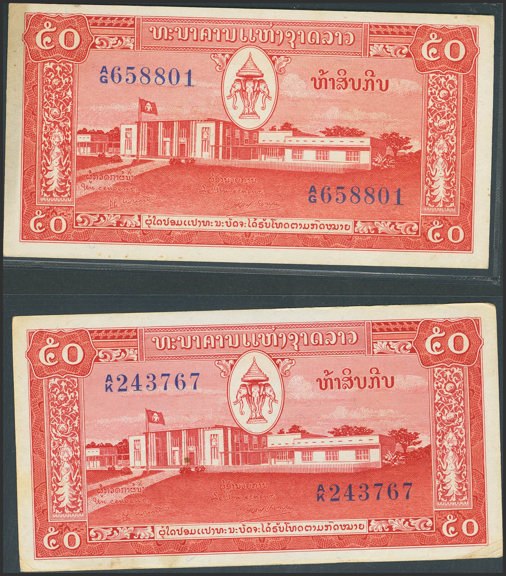 LAOS. Lot of 2 notes of 50 Kip. (1957ca). Banque Nationale. Without planchettes. (Pick: 5b). Almost Uncirculated and Less than Uncirculated, edges slightly darkened.