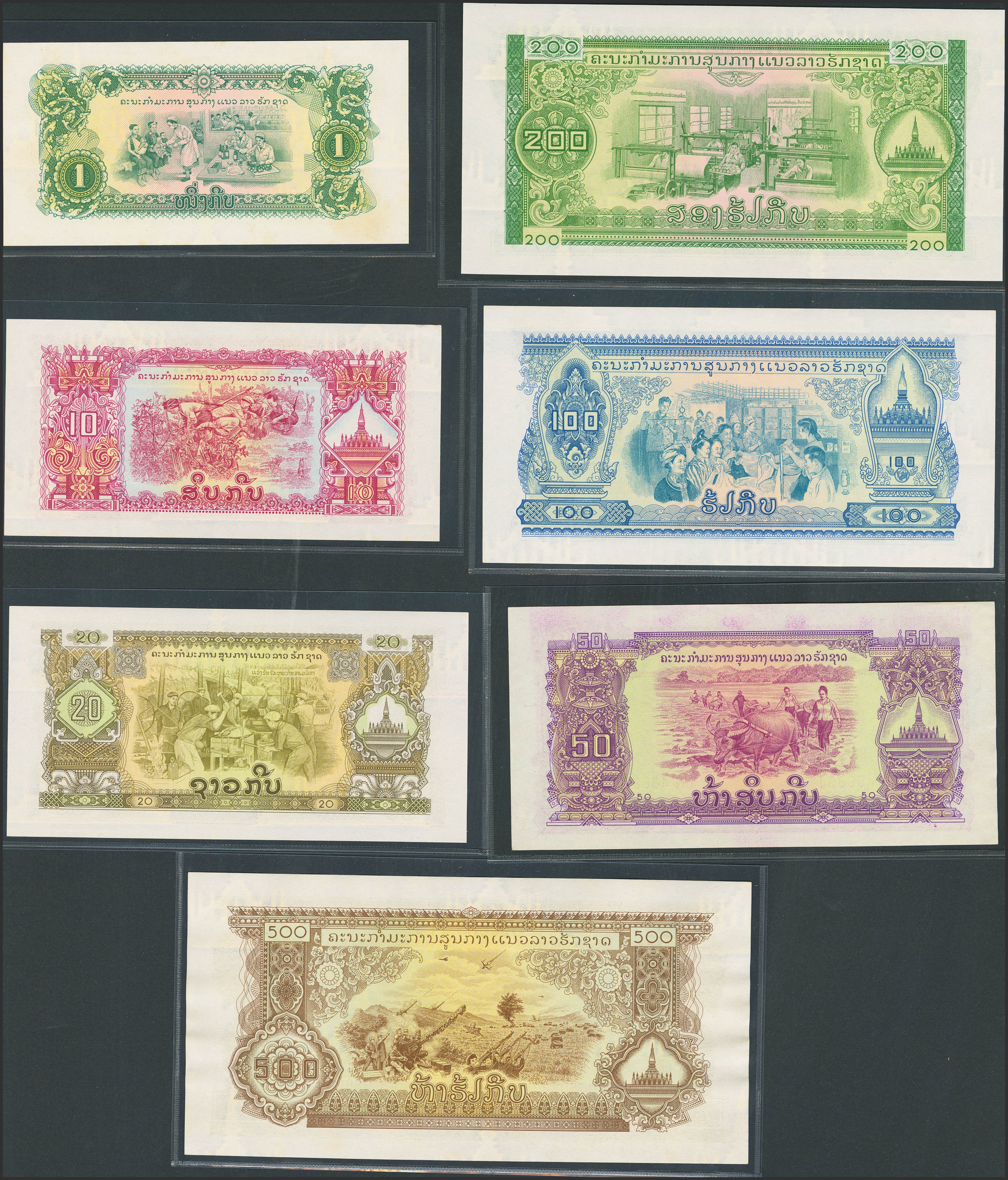 LAOS. Complete set from 1 at 500 Kip. (1968ca). Lao Central National Committee. (Pick: 19Aa, 20a, 21a, 22b, 23a, 23Aa, 24a). Uncirculated.