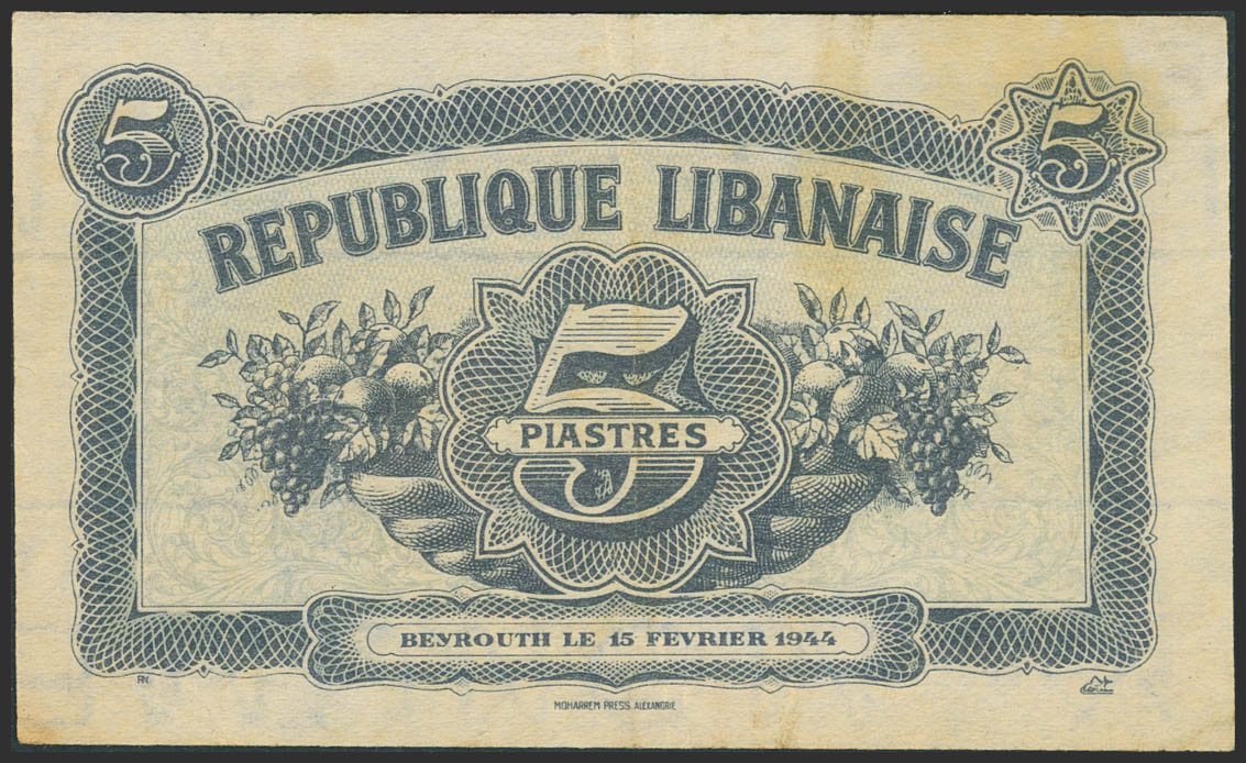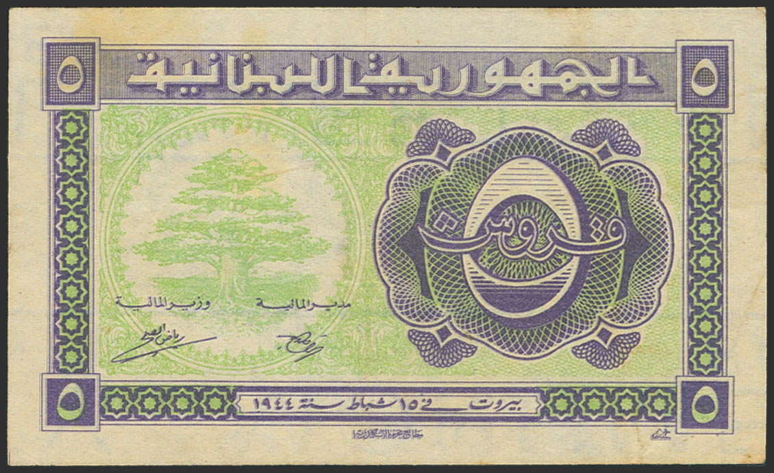 LEBANON. 5 Piastres. 15 February 1944. Republique Libanaise. (Pick: 38). Flattened. More than Very Fine.